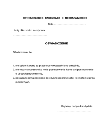 OŚWIADCZENIE KANDYDATA O NIEKARALNOŚCI Data ……………………………….. Imię i Nazwisko kandydata …………………………………. OŚWIADCZENIE Oświadczam, że: 1. nie byłem karany za przestępstwo popełnione umyślnie, 2. nie toczy się przeciwko mnie postępowanie karne ani postępowanie o ubezwłasnowolnienie, 3. posiadam pełną zdolność do czynności prawnych i korzystam z praw publicznych. Czytelny podpis kandydata ………………………………….