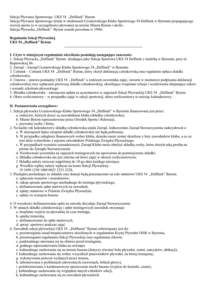 Sekcja Pływania Sportowego UKS 54 „Delfinek” Bytom Sekcja Pływania Sportowego działa w strukturach Uczniowskiego Klubu Sportowego 54 Delfinek w Bytomiu propagującego rozwój sportu (a w szczególności pływania) na terenie Miasta Bytom i okolic. Sekcja Pływacka „Delfinek” Bytom została powołana w 1996r. Regulamin Sekcji Pływackiej UKS 54 „Delfinek” Bytom I. Użyte w niniejszym regulaminie określenia posiadają następujące znaczenie: 1. Sekcja Pływacka „Delfinek” Bytom działająca jako Sekcja Sportowa UKS 54 Delfinek z siedzibą w Bytomiu, przy ul. Reptowskiej 86. 2. Zarząd – Zarząd Uczniowskiego Klubu Sportowego 54 „Delfinek” w Bytomiu 3. Członek – Członek UKS 54 „Delfinek” Bytom, który złożył deklarację członkowską oraz regularnie opłaca składki członkowskie. 4. Umowa – umowa pomiędzy UKS 54 „Delfinek” a rodzicem uczestnika zajęć, zawarta w momencie podpisania deklaracji członkowskiej oraz wpłaceniu pierwszej składki członkowskiej, określająca wzajemne relacje i oczekiwania obejmujące zakres i warunki szkolenia pływackiego. 5. Składka członkowska – miesięczna opłata za uczestnictwo w zajęciach Sekcji Pływackiej UKS 54 „Delfinek” Bytom 6. Okres rozliczeniowy – w przypadku zajęć w sekcji sportowej, okres rozliczeniowy to miesiąc kalendarzowy. II. Postanowienia szczegółowe: 1. Sekcja pływacka Uczniowskiego Klubu Sportowego 54 „Delfinek” w Bytomiu finansowana jest przez: a. rodziców, których dzieci są zawodnikami klubu (składka członkowska), b. Miasto Bytom reprezentowane przez Ośrodek Sportu i Rekreacji, c. prywatne osoby i firmy, 2. Na każdy rok kalendarzowy składkę członkowską ustala Zarząd. Jednocześnie Zarząd Stowarzyszenia zadecydował o: a. W miesiącach lipiec-sierpień składki członkowskie nie będą pobierane; b. W przypadku zaległości finansowych wobec klubu, dziecko może zostać skreślone z listy zawodników klubu, a co za tym idzie wykreślone z rejestru zawodników Polskiego Związku Pływackiego; c. W przypadkach wyraźnie uzasadnionych, Zarząd Klubu może obniżyć składkę osoby, która złożyła taką prośbę na piśmie do Zarządu Stowarzyszenia d. Nieobecność uczestnika na zajęciach treningowych nie upoważnia do pomniejszenia składki; e. Składka członkowska nie jest zależna od ilości zajęć w okresie rozliczeniowym; f. Składkę należy uiszczać najpóźniej do 10-go dnia każdego miesiąca; g. Wszelkie wpłaty należy wpłacać na konto Sekcji Pływackiej 19 1050 1230 1000 0023 2233 2228, 3. Pieniądze pochodzące ze składek oraz dotacji będą przeznaczone na cele statutowe UKS 54 „Delfinek” Bytom: a. opłacenie trenerów i instruktorów, b. zakup sprzętu sportowego niezbędnego do treningu pływackiego, c. dofinansowanie opłat startowych na zawodach, d. opłaty statutowe w Polskim Związku Pływackim, e. opłaty za wynajem basenu 4. O wysokości dofinansowania opłat na zawody decyduje Zarząd Stowarzyszenia 5. W ramach składki członkowskiej i opłat treningowych zawodnik otrzymuje: a. bezpłatne wejście na pływalnię na czas treningu, b. opiekę trenerską, c. dofinansowanie do opłat startowych, d. sprzęt sportowy podczas zajęć. 6. Zawodnik sekcji pływackiej UKS 54 „Delfinem” Bytom zobowiązany jest do: a. przestrzegania zasad bezpieczeństwa określonych w regulaminie Krytej Pływalni OSiR w Bytomiu, b. przestrzegania regulaminu Sekcji Pływackiej oraz regulaminu siłowni, c. punktualnego stawiania się na zbiórce przed treningiem, d. godnego reprezentowania klubu na zewnątrz e. kulturalnego zachowania się na terenie basenu (dotyczy również holu pływalni, szatni, natrysków, ubikacji), f. kulturalnego zachowania się wobec wszystkich pracowników pływalni, na której trenujemy, g. wykonywania poleceń wydanych przez trenera, h. informowania o problemach zdrowotnych (zawrotach, bólach głowy), i. poinformowania o każdorazowym opuszczeniu niecki basenu (wyjście do łazienki, szatni), j. kulturalnego zachowania się względem innych członków sekcji, k. kulturalnego zachowania się na zawodach pływackich, l. dbania o sprzęt sportowy, który jest własnością klubu, n. przychodzenia na trening w czystym, schludnym ubiorze, o. posiadania podczas treningu odpowiedniego stroju do pływania: czepka, klapek, stroju kąpielowego, ręcznika, 8. Zawodnik sekcji pływackiej UKS 54 „Delfinek” Bytom powinien: a. rzetelnie i sumiennie uczestniczyć w treningach, b. brać udział we wszystkich zawodach, do których został wytypowany przez trenera, c. mieć dobre wyniki w nauce oraz dobrą opinię szkoły, d. pomagać innym zawodnikom sekcji, e. być przygotowany do zawodów tzn. posiadać:, dwie pary strojów pływackich, czepek sekcji, koszulkę sekcji, okularki pływackie, f. uczestniczyć w obozach sportowych, 9. Trenerzy sekcji mogą wyciągnąć konsekwencje wobec zawodników niestosujących się do regulaminu sekcji poprzez: a. upomnienie, b. upomnienie w obecności rodzica, c. upomnienie przy całej drużynie, d. nie zgłoszenie do zawodów, e. zawieszenie czasowe w prawach zawodnika klubu, f. skreślenie zawodnika z listy klubowej, 10. Rodzice są zobowiązani do: a. regularnego wpłacania składki członkowskiej - do 10 każdego miesiąca (po ustaleniach indywidualnych termin płatności może zostać przesunięty), b. informowania trenerów sekcji o nieobecności zawodnika na treningu (np. z powodu choroby, przy dłuższych nieobecnościach), c. wyciągania konsekwencji wobec dziecka, które dostało upomnienie od trenera, d. nie wchodzenia na teren basenu podczas trwania zajęć treningowych. 11. Kierownik sekcji pomaga w prowadzeniu sekcji pływackiej po przez: a.) pomoc w sprawach organizacyjnych; b.) jest przedstawicielem rodziców c.) koordynuje pozyskiwanie środków od sponsorów. 12. Zarząd zatrudnia trenerów i instruktorów 13. Zarząd ustala wielkość grup treningowych, biorąc pod uwagę rac