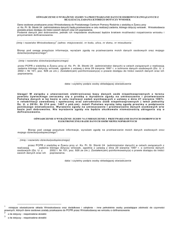 OŚWIADCZENIE O WYRAŻENIU ZGODY NA PRZETWARZANIE DANYCH OSOBOWYCH ZWIĄZANYCH Z REALIZACJĄ ZADANIA KTÓREGO DOTYCZY WNIOSEK Dane osobowe przekazane przez Wnioskodawcę do Powiatowego Centrum Pomocy Rodzinie z siedzibą w Żywcu przy ul. Ks. Pr. St. Słonki 24 (administratora danych) będą przetwarzane w celu realizacji zadania, którego dotyczy wniosek. Wnioskodawca posiada prawo dostępu do treści swoich danych oraz ich poprawiania. Podanie danych jest dobrowolne, jednak ich niepodanie skutkować będzie brakiem m ożliwości rozpatrzenia wniosku i przyznaniem dofinansowania. ............................................................................................................................. ............... (imię i nazwisko Wnioskodawcy) 1 (adres: miejscowość, nr kodu, ulica, nr domu, nr mieszkania Biorąc pod uwagę powyższe informacje, wyrażam zgodę na przetwarzanie moich danych osobowych oraz mojego dziecka/podopiecznego 2: ................................................................ (imię i nazwisko dziecka/podopiecznego) przez PCPR z siedzibą w Żywcu przy ul. Ks. Pr. St. Słonki 24 (administrator danych) w celach związanych z realizacją zadania którego dotyczy wniosek, zgodnie z ustawą z dnia 29 sierpnia 1997 r. o ochronie danych osobowych (Dz. U. z 2002 r. Nr 101, poz. 926 ze zm.). Zostałem(am) poinformowany(a) o prawie dostępu do treści swoich danych oraz ich poprawiania. ............................................................. data i czytelny podpis osoby składającej oświadczenie U w a g a ! W z w i ą z k u z u t w o r z e n i e m e l e k t r o n i c z n e j b a z y d a n yc h o s ó b n i e p e ł n o s p r a w n yc h z t e r e n u p o w i a t u ż yw i e c k i e g o z w r a c a m y s i ę z p r o ś b ą o w yr a ż e n i e z g o d y n a u m i e s z c z e n i e i p r z e t w a r z a n i e P a ń s t w a d a n yc h w t e j b a z i e w c e l u r e a l i z a c j i z a d a ń w yn i k a j ą c yc h z u s ta w y z d n i a 2 7 s i e r p n i a 1 9 9 7 r. o r e h a b i l i ta c j i z a w o d o w e j i s p o ł e c z n e j o r a z z a t r u d n i a n i u o s ó b n i e p e ł n o s p r a w n yc h ( t e k s t j e d n o l i t y D z . U . z 2 0 1 0 r. N r 2 1 4 p o z . 1 4 0 7 z p ó ź . z m ) . J e ż e l i P a ń s t w o w yr a ż ą ta k ą z g o d ę p r o s i m y o p o dp i s a n i e p o n i ż s z e g o o ś w i a d c z e n i a . W yr a ż e n i e z g o d y n a u m i e s z c z e n i e i p r z e t w a r z a n i e d a n yc h o s o b o w yc h w / w b a z i e j e s t d o b r o w o l n e . N i e w yr a ż e n i e z g o d y n i e b ę d z i e s k u t k o w a ł o n i e m o ż n o ś c i ą u b i e g a n i a s i ę o dofinansowania. OŚWIADCZENIE O WYRAŻENIU ZGODY NA UMIESZCZENIE I PRZETWARZANIE DANYCH OSOBOWYCH W ELEKTRONICZNEJ BAZIE DANYCH OSÓB NIEPEŁNOPSRAWNYCH Biorąc pod uwagę powyższe informacje, wyrażam zgodę na przetwarzanie moich danych osobowych ora z mojego dziecka/podopiecznego 3: ................................................................ (imię i nazwisko dziecka/podopiecznego) przez PCPR z siedzibą w Żywcu przy ul. Ks. Pr. St. Słonki 24 (administrator danych) w celach związanych z realizacją zadania którego dotyczy wniosek, zgodnie z ustawą z dnia 29 sierpnia 1997 r. o ochronie danych osobowych (Dz. U. z 2002 r. Nr 101, poz. 926 ze zm.). Zostałem(am) poinformowany(a) o prawie dostępu do treści swoich danych oraz ich poprawiania. ............................................................. data i czytelny podpis osoby składającej oświadczenie 1 niniejsze oświadczenie składa Wnioskodawca oraz dodatkowo i odrębnie - inne pełnoletnie osoby posiadające zdolność do czynności prawnych, których dane osobowe zostały przekazane do PCPR przez Wnioskodawcę we wniosku o dofinansowanie 2 o ile dotyczy - niepotrzebne skreślić 3 o ile dotyczy - niepotrzebne skreślić DO WNISOKU O DOFINANSOWANIE UCZESTNICTWA W TURNUSIE REHABILITACYJNYM NALEŻY DOŁĄCZYĆ: 1. wniosek lekarza, pod opieką, którego znajduje się osoba niepełnoprawna o skierowanie na turnus rehabilitacyjny, wystawiony czytelnie, w języku polskim. (druk w załączeniu) 2. kopię orzeczenia o stopniu niepełnosprawności lub orzeczenia równoważnego (oryginał do wglądu), 3. kopię dowodu osobistego (oryginał do wglądu) 4. oświadczenie o pobieraniu nauki w przypadku osoby niepełnosprawnej w wieku do 16 lat lub w wieku do 24 roku życia uczącej się i niepracującej (oświadczenie dołączone poniżej w przypadku osoby do 24 roku życia) 5. kopię dokumentu stanowiącego opiekę prawna nad podopiecznym – dotyczy opiekunów prawnych, lub pełnomocnictwo (oryginał do wglądu), 6. prośbę o zwiększenie dofinansowania, w przypadku uzasadnionym szczególnie trudną sytuacją życiową osoby niepełnosprawnej. miejscowość, dnia........................................... .............................................................................. imię i nazwisko ............................................................................. ........................................................................... adres OŚWIADCZENIE (dotyczy osób w wieku do 24 roku życia) Ja niżej podpisana/y, pouczona/y o odpowiedzialności karnej z art. 233 § 1 Kodeksu Karnego* za składanie fałszywych zeznań, składam, stosownie do art. 75 § 2 Kodeksu Postępowania Administracyjnego oświadczenie następującej treści: Wnioskodawca/dziecko/podopieczny nie jest osoba ucząca się jest osobą uczącą się w szkole.......................................................................... ................................................................................................................................... podać miejsce szkoły Wnioskodawca/dziecko/podopieczny zatrudniony w zakładzie pracy w...................................................................................... na czas nieokreślony określony do dnia ................