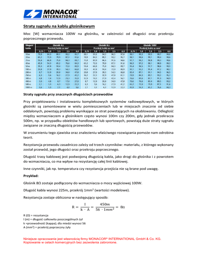 Straty sygnału na kablu głośnikowym Moc [W] wzmacniacza 100W na głośniku, w zależności od długości oraz przekroju poprzecznego przewodu. Straty sygnału przy znacznych długościach przewodów Przy projektowaniu i instalowaniu kompleksowych systemów radiowęzłowych, w których głośniki są zamontowane w wielu pomieszczeniach lub w miejscach znacznie od siebie oddalonych, powstają problemy wynikające ze strat powstających na okablowaniu. Odległość między wzmacniaczem a głośnikiem często wynosi 100m czy 200m, gdy jednak przekracza 500m, np. w przypadku obiektów handlowych lub sportowych, powstają duże straty sygnału związane ze znaczną długością przewodów. W zrozumieniu tego zjawiska oraz znalezieniu właściwego rozwiązania pomoże nam odrobina teorii. Rezystancja przewodu zasadniczo zależy od trzech czynników: materiału, z którego wykonany został przewód, jego długości oraz przekroju poprzecznego. Długość trasy kablowej jest podwojoną długością kabla, jako drogi do głośnika i z powrotem do wzmacniacza, co ma wpływ na rezystancję całej linii kablowej. Inne czynniki, jak np. temperatura czy rezystancja przejścia nie są brane pod uwagę. Przykład: Głośnik 8Ω zostaje podłączony do wzmacniacza o mocy wyjściowej 100W. Długość kabla wynosi 225m, przekrój 1mm2 (wartości modelowe). Rezystancja zostaje obliczona w następujący sposób: R= I 450 = k ∙ A 56 ∙ 1 = 8Ω R (Ω) = rezystancja l (m) = długość całkowita poszczególnych żył k =przewodność (kappa); dla miedzi wynosi 56 A (mm2) = przekrój poprzeczny żyły Niniejsze opracowanie jest własnością firmy MONACOR® INTERNATIONAL GmbH & Co. KG. Kopiowanie w celach komercyjnych bez zezwolenia zabronione. Wzmacniacz dostarcza następujące wartości wyjściowe 100W przy 8Ω: napięcie wyjściowe = 28.3V natężenie wyjściowe = 3.53A Całkowita rezystancja układu wynosi 8Ω dla zestawu głośnikowego i 8Ω dla podłączonego kabla. Oznacza to, że impedancja obciążeniowa wzmacniacza zostaje podwojona, zatem natężenie wyjściowe zostanie zmniejszone o połowę. Ponieważ w naszym przykładzie wartość rezystancji liniowej oraz impedancji głośnika jest taka sama, do głośnika dochodzi jedynie połowa napięcia. Tym samym do głośnika dojdzie tylko 25W lub 25% mocy wzmacniacza. Użycie przewodów o przekroju poprzecznym 4mm2 spowoduje zwiększenie tej wartości do 44%, takiego rozwiązania jednak się nie stosuje ze względu na wysokie koszty. Moc wyjściowa znacznie się zmieni, jeżeli użyty zostanie układ 100V – przy mocy na wyjściu 100W impedancja obciążeniowa zestawu głośnikowego wyniesie 100Ω. Wartość rezystancji liniowej będzie nadal wynosić 8Ω, ma ona znacznie mniejszy wpływ na opór całkowity w stosunku do impedancji głośników. Według naszych obliczeń natężenie całkowite wynosi 100V/(100Ω + 8Ω) = 926mA. moc na głośniku wynosi P = I2 x R = 0.926A2 x 100Ω = 85.75W. Moc wyjściowa wynosi 85.75W lub 85.75%. Aby otrzymać taką samą moc wyjściową w systemie 8Ω, przekrój poprzeczny kabla musiałby wynosić 16mm2. Niniejsze opracowanie jest własnością firmy MONACOR® INTERNATIONAL GmbH & Co. KG. Kopiowanie w celach komercyjnych bez zezwolenia zabronione.