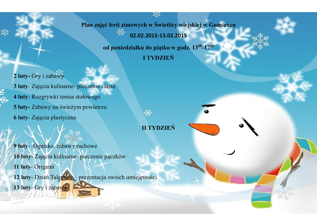 Plan zajęć ferii zimowych w Świetlicy wiejskiej w Gumieńcu 02.02