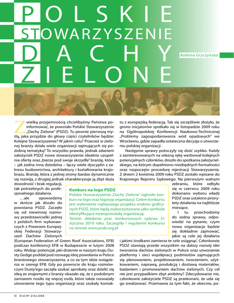P O L S KIE STOWARZYSZENIE D A C H Y ZIELONE Z Balbina Gryczyńska wielką przyjemnością chcielibyśmy Państwa po- tu z europejską federacją. Tak się szczęśliwie złożyło, że informować, że powstało Polskie Stowarzyszenie grono inicjatorów spotkało się w listopadzie 2009 roku „Dachy Zielone” (PSDZ). Tu pewnie pierwszą my- na Ogólnopolskiej Konferencji Naukowo-Technicznej ślą, jaka przyjdzie do głowy części czytelników będzie: „Problemy zagospodarowania wód opadowych” we Kolejne Stowarzyszenie? W jakim celu? Przecież w zielo- Wrocławiu, gdzie zapadła ostateczna decyzja o utworzenej branży działa wiele organizacji zajmujących się po- niu polskiej organizacji . dobną tematyką? To wszystko prawda, jednak zdaniem Następnie sprawy potoczyły się dość szybko. Każdy założycieli PSDZ nowe stowarzyszenie idealnie uzupeł- z zainteresowanych na własną rękę werbował kolejnych nia ofertę oraz „bierze pod swoje skrzydła” branżę, która potencjalnych członków, doszło do spotkania założyciel– jak żadna inna dziedzina – łączy wiele dyscyplin z za- skiego, na którym dopełniono niezbędnych formalności kresu budownictwa, architektury i kształtowania krajo- oraz rozpoczęto procedurę rejestracji Stowarzyszenia. brazu. Branżę, która z jednej strony bardzo dynamicznie Z dniem 2 kwietnia 2009 roku PSDZ zostało wpisane do się rozwija, z drugiej jednak charakteryzuje ją zbyt duża Krajowego Rejestru Sądowego. Na pierwszym walnym dowolność i brak regulacji, zebraniu, które odbyło tak potrzebnych do profesię w czerwcu 2009 roku Konkurs na logo PSDZ sjonalnego działania. dokonano wyboru władz Polskie Stowarzyszenie „Dachy Zielone” ogłosiło kon…ale opowiedzmy PSDZ oraz ustalono priorykurs na logo oraz logotyp organizacji. Celem konkursu w skrócie jak doszło do tety działania na najbliższe jest wyłonienie najlepszego projektu znaków graficzpowstania PSDZ. Zaczęło miesiące. nych PSDZ, które będą wykorzystywane jako symbole się od niewinnej rozmoI tu przechodzimy identyfikujące nowopowstałą organizację. wy przedstawicielki jednej do sedna sprawy, odpoTermin składania prac konkursowych upływa 31 z polskich firm wykonawwiedzi na pytanie, czym stycznia 2010 roku. Szczegóły i regulamin konkursu czych z Prezesem Europejnowa organizacja będzie na stronie www.psdz.org.pl skiej Federacji Stowarzysię dokładnie zajmować, szeń Dachów Zielonych jakie są cele jej działania (European Federation of Green Roof Associations, EFB) i jakimi środkami zamierza te cele osiągnąć. Członkowie podczas konferencji EFB w Budapeszcie w lutym 2008 PSDZ stawiają przede wszystkim na dalszy rozwój idei roku. Widząc potencjał, jaki drzemie w naszym kraju Du- tworzenia dachów zielonych w Polsce oraz utworzenie sty Gedge poddał pod rozwagę ideę powołania w Polsce platformy i sieci współpracy podmiotów zajmujących branżowego stowarzyszenia, a co za tym idzie wstąpie- się planowaniem, projektowaniem, tworzeniem, użytnia w szeregi EFB. Gdy po powrocie do kraju rozmów- kowaniem, naprawą, produkcją i dostawą materiałów, czyni Dusty’ego zaczęła szukać aprobaty oraz dzielić się badaniem i promowaniem dachów zielonych. Czy cel ideą ze znajomymi z branży okazało się, że z podobnym nie jest przypadkiem zbyt ambitny? Zdecydowanie nie, zamiarem nosiło się więcej osób, które także rozważały członkowie założyciele PSDZ są przekonani, że uda się utworzenie tego typu organizacji oraz szukały kontak- go zrealizować. Przemawia za tym fakt, że obecnie, po52 Inicjatywy mimo iż stowarzyszenie skupia jeszcze niewielką liczbę 24 członków założycieli, to ma już w swoich szeregach przedstawicieli różnych branż (zajmujących się tematyką dachów zielonych) - od środowisk naukowo-badawczych począwszy, przez architektów, producentów, dystrybutorów po firmy wykonawcze. Chcą oni wspólnie wypracować wytyczne tworzenia dachów zielonych oraz dążyć do ich normalizacji, promując jednocześnie zasady uczciwej konkurencji. Liczą na to, iż będą w stanie upowszechnić wiedzę na temat dachów zielonych, co znajdzie bezpośrednie przełożenie na rozwój świadomości ekologicznej społeczeństwa. PSDZ zamierza inicjować projekty naukowo-badawcze w dziedzinach związanych z dachami zielonymi oraz służyć upowszechnianiu ich wyników. Stowarzyszenie planuje również organizowanie konferencji, seminariów i szkoleń, których uczestnicy będą mogli uzyskać fachową wiedzę w tej szerokiej i ciekawej dziedzinie. Ważnym punktem programu działania będzie także współpraca z administracją publiczną i samorządową oraz instytucjami i organizacjami zainteresowanymi działalnością Stowarzyszenia w kraju i zagranicą. Dzięki członkostwu w Europejskiej Federacji Stowarzyszeń Dachów Zielo- TIn April 2009, the Polish Green Roof Association (PSDZ) was launched. According to its founders, the new Association supplements the offer as well as ‘takes under its wings’ the branch which (unlike others) links many disciplines within construction, architecture and landscape formation. The branch on the one hand develops very quickly. However, on the other hand its characteristic feature is too much flexibility and lack of organization - both necessary for professional activity. At the first meeting, held in June 2009, the management board of PSDZ was chosen as well as setting priority activities for the subsequent months. The members emphasize further development of the notion of creating green roofs in Poland, including launching a platform and net of co-operation among those dealing with the planning, design, creation and promotion of green roofs. Although the Association constitutes only 24 members, representatives of many branches focusing on green roofs are also involved. These range from environmental science researchers, architects, producers, distributors to specialize