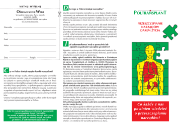 D WYTNIJ I WYPE£NIJ Nazwisko Imiê Pesel C Wyniki przeszczepiania narz¹dów s¹ coraz lepsze dziêki czemu rozszerzaj¹ siê wskazania do leczenia t¹ metod¹. Wzrasta liczba osób oczekuj¹cych na przeszczepienie i wyd³u¿a siê czas ich oczekiwania na operacjê co mo¿e stworzyæ zagro¿enie dla ¿ycia tych chorych. Wiedza spo³eczeñstwa o tym jak¹ wartoœæ dla setek œmiertelnie chorych ma przeszczepienie narz¹du jest nadal niewystarczaj¹ca. Sprzeciw na pobranie narz¹du wyra¿any przez rodzinê zmar³ego powoduje, ¿e nie mo¿na uratowaæ ¿ycia wielu chorym. Nale¿y prowadziæ sta³¹ kampaniê edukacyjn¹, informuj¹c¹ o potrzebach i wynikach przeszczepiania narz¹dów, która pomo¿e przekonaæ spo³eczeñstwo o skutecznoœci tej metody leczenia. J Adres Data OŒWIADCZENIE WOLI W nadziei ratowania ¯ycia innych wyra¿am zgodê na pobranie po œmierci moich narz¹dów do przeszczepiania. Podpis zy w Polsce istnieje ryzyko handlu narz¹dami? Aby unikn¹æ takiego ryzyka, obowi¹zuj¹ce przepisy przewiduj¹, ¿e pobranie narz¹du i jego przeszczepienie mo¿e mieæ miejsce jedynie w upowa¿nionych oœrodkach medycznych. Przeszczepianie jest skomplikowan¹ procedur¹, anga¿uj¹c¹ tak wielu wysokiej klasy specjalistów, ¿e pok¹tne przeszczepianie narz¹dów jest praktycznie niemo¿liwe. Pobrane narz¹dy rozdzielane s¹ zgodnie z kryteriami medycznymi. Ich losy, od pobrania a¿ do przeszczepienia znajduj¹ siê pod kontrol¹ upowa¿nionych oœrodków. Ustawa Transplantacyjna penalizuje wszelkie próby komercjalizacji przeszczepienia narz¹dów w Polsce. Tekst ten zawiera podstawowe informacje o pobieraniu i przeszczepianiu tkanek i narz¹dów. Ma pomóc w podjêciu niezale¿nej decyzji, dotycz¹cej sprzeciwu lub zgody na oddanie swych narz¹dów po œmierci, w celu ratowania ¿ycia innych. laczego w Polsce brakuje narz¹dów? POLTRANSPLANT PRZESZCZEPIANIE NARZ¥DÓW DAREM ¯YCIA ak zakomunikowaæ wolê o sprzeciwie lub zgodzie na pobranie narz¹dów po œmierci? Zgodnie z ustaw¹ z dnia 1 stycznia 2006 pobranie komórek, tkanek i narz¹dów ze zw³ok ludzkich mo¿na dokonaæ, je¿eli osoba zmar³a nie wyrazi³a za ¿ycia sprzeciwu. Sprzeciw nale¿y zg³osiæ osobiœcie lub listownie w Centralnym Rejestrze Sprzeciwów w Centrum Organizacyjno-Koordynacyjnym do spraw Transplantacji, ul. Lindleya 4, 02-005 Warszawa na formularzu, który mo¿na otrzymaæ w zak³adach opieki zdrowotnej lub na stronie internetowej www.poltransplant.org.pl. Po dokonaniu wpisu w Centralnym Rejestrze Sprzeciwów, osoba zg³aszaj¹ca otrzyma listem poleconym potwierdzenie wpisu. Sprzeciw jest skuteczny od daty wpisu do rejestru , która bêdzie uwidoczniona na potwierdzeniu. Je¿eli formularz bêdzie Ÿle wype³niony, sprzeciw nie zostanie zarejestrowany, o czym osoba zainteresowana zostanie powiadomiona listownie. Moc prawn¹ ma równie¿ noszone przy sobie w³asnorêcznie podpisane oœwiadczenie sprzeciwu lub oœwiadczenie ustne z³o¿one w obecnoœci dwóch œwiadków pisemnie przez nich potwierdzone. W przypadku ma³oletniego lub innej osoby, która nie ma pe³nej zdolnoœci do czynnoœci prawnych, sprzeciw mo¿e wyraziæ za ¿ycia przedstawiciel ustawowy tej osoby. Ma³oletni powy¿ej lat 16 lub inne osoby, które nie maj¹ pe³nej zdolnoœci do czynnoœci prawnych, mog¹ same wyraziæ sprzeciw. W ka¿dym przypadku bardzo wa¿ne jest zawiadomienie najbli¿szych o swojej decyzji. Osoba wyra¿aj¹ca zgodê na oddanie po œmierci swoich tkanek i narz¹dów do przeszczepienia dla ratowania ¿ycia i przywracania zdrowia ludziom chorym mo¿e tak¿e nosiæ przy sobie w³asnorêcznie podpisane oœwiadczenie woli. Takie oœwiadczenie woli ma charakter informacyjny i nie zwalnia lekarzy, maj¹cego zamiar pobraæ narz¹dy z obowi¹zku sprawdzenia w Centralnym Rejestrze Sprzeciwów, czy osoba ta nie wyrazi³a sprzeciwu za ¿ycia. Co ka¿dy z nas powinien wiedzieæ o przeszczepianiu narz¹dów?
