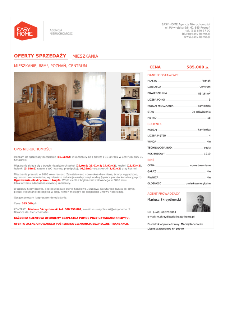 EASY-HOME Agencja Nieruchomości ul. Półwiejska 9/8, 61-885 Poznań tel. (61) 670 37 00 [email protected] www.easy-home.pl OFERTY SPRZEDAŻY MIESZKANIA MIESZKANIE, 88M 2, POZNAŃ, CENTRUM CENA 585.000 ZŁ DANE PODSTAWOWE MIASTO Poznań DZIELNICA Centrum 88.16 m 2 POWIERZCHNIA LICZBA POKOI 3 RODZAJ MIESZKANIA STAN kamienica Do odświeżenia PIĘTRO 1p BUDYNEK RODZAJ kamienica LICZBA PIĘTER 4 WINDA OPIS NIERUCHOMOŚCI Polecam do sprzedaży mieszkanie (88,16m2) w kamienicy na I piętrze z 1910 roku w Centrum przy ul. Kwiatowej. Mieszkanie składa się z trzech niezależnych pokoi (22,9m2; 23,01m2; 17,92m2), kuchni (11,52m2), łazienki (3,68m2) razem z WC i wanną, przedpokoju (6,28m2) oraz skrytki (1,81m2) przy kuchni. Mieszkanie przeszło w 2006 roku remont. Zainstalowano nowe okna drewniane, ściany wygładzono, wyremontowano łazienkę, wymieniono instalacje elektryczną i wodną (oprócz pionów kanalizacyjnych). Ogrzewanie elektryczne- II taryfa. Woda ciepła z bojlera zainstalowanego w 2008 roku. Kilka lat temu odnowiono elewację kamienicy. W pobliżu Stary Browar, deptak z bogatą ofertą handlowo-usługową. Do Starego Rynku ok. 8min. pieszo. Mieszkanie do objęcia w ciągu trzech miesięcy od podpisania umowy notarialnej. Gorąco polecam i zapraszam do oglądania. Nie TECHNOLOGIA BUD. cegła ROK BUDOWY 1910 INNE OKNA nowe drewniane GARAŻ Nie PIWNICA Nie GŁOŚNOŚĆ umiarkownie głośne AGENT PROWADZĄCY Mariusz Skrzydlewski Cena: 585 000 pln KONTAKT: Mariusz Skrzydlewski tel. 608 298 861, e-mail: [email protected] Doradca ds. Nieruchomości. KAŻDEMU KLIENTOWI OFERUJEMY BEZPŁATNĄ POMOC PRZY UZYSKANIU KREDYTU. OFERTA LICENCJONOWANEGO POŚREDNIKA GWARANCJĄ BEZPIECZNEJ TRANSAKCJI. tel.: (+48) 608298861 e-mail: [email protected] Pośrednik odpowiedzialny: Maciej Karwowski Licencja zawodowa nr 10940