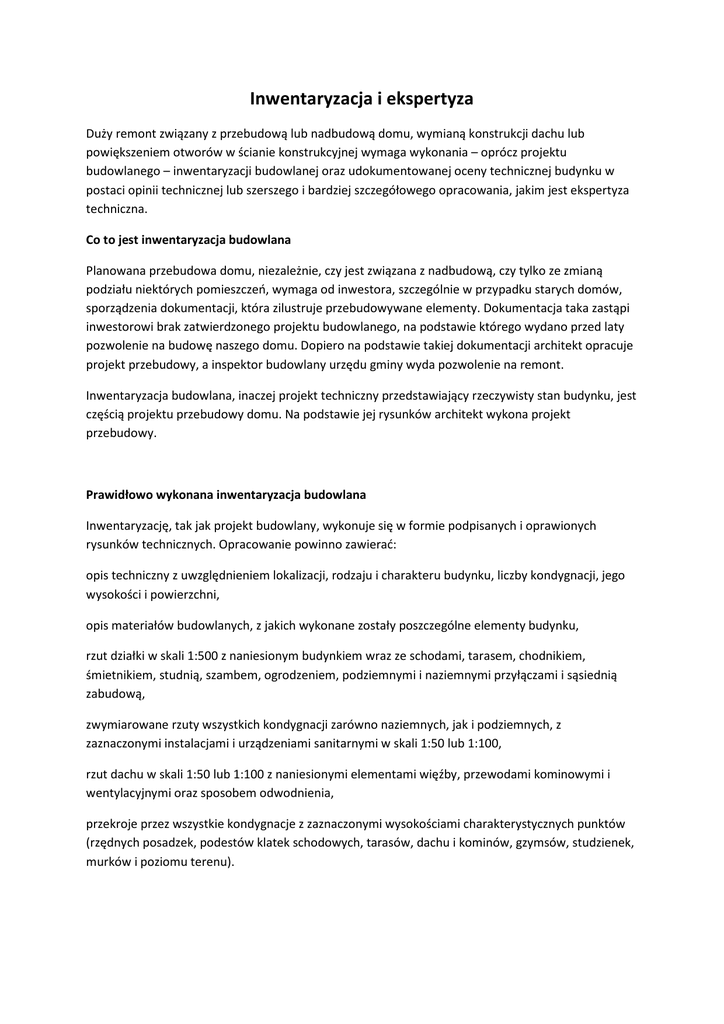 Inwentaryzacja i ekspertyza Duży remont związany z przebudową lub nadbudową domu, wymianą konstrukcji dachu lub powiększeniem otworów w ścianie konstrukcyjnej wymaga wykonania – oprócz projektu budowlanego – inwentaryzacji budowlanej oraz udokumentowanej oceny technicznej budynku w postaci opinii technicznej lub szerszego i bardziej szczegółowego opracowania, jakim jest ekspertyza techniczna. Co to jest inwentaryzacja budowlana Planowana przebudowa domu, niezależnie, czy jest związana z nadbudową, czy tylko ze zmianą podziału niektórych pomieszczeń, wymaga od inwestora, szczególnie w przypadku starych domów, sporządzenia dokumentacji, która zilustruje przebudowywane elementy. Dokumentacja taka zastąpi inwestorowi brak zatwierdzonego projektu budowlanego, na podstawie którego wydano przed laty pozwolenie na budowę naszego domu. Dopiero na podstawie takiej dokumentacji architekt opracuje projekt przebudowy, a inspektor budowlany urzędu gminy wyda pozwolenie na remont. Inwentaryzacja budowlana, inaczej projekt techniczny przedstawiający rzeczywisty stan budynku, jest częścią projektu przebudowy domu. Na podstawie jej rysunków architekt wykona projekt przebudowy. Prawidłowo wykonana inwentaryzacja budowlana Inwentaryzację, tak jak projekt budowlany, wykonuje się w formie podpisanych i oprawionych rysunków technicznych. Opracowanie powinno zawierać: opis techniczny z uwzględnieniem lokalizacji, rodzaju i charakteru budynku, liczby kondygnacji, jego wysokości i powierzchni, opis materiałów budowlanych, z jakich wykonane zostały poszczególne elementy budynku, rzut działki w skali 1:500 z naniesionym budynkiem wraz ze schodami, tarasem, chodnikiem, śmietnikiem, studnią, szambem, ogrodzeniem, podziemnymi i naziemnymi przyłączami i sąsiednią zabudową, zwymiarowane rzuty wszystkich kondygnacji zarówno naziemnych, jak i podziemnych, z zaznaczonymi instalacjami i urządzeniami sanitarnymi w skali 1:50 lub 1:100, rzut dachu w skali 1:50 lub 1:100 z naniesionymi elementami więźby, przewodami kominowymi i wentylacyjnymi oraz sposobem odwodnienia, przekroje przez wszystkie kondygnacje z zaznaczonymi wysokościami charakterystycznych punktów (rzędnych posadzek, podestów klatek schodowych, tarasów, dachu i kominów, gzymsów, studzienek, murków i poziomu terenu). Kto wykona inwentaryzację To samo biuro projektów, któremu się zleca wykonanie projektu przebudowy, na dodatkowe zlecenie może wykonać szczegółowe pomiary domu, na podstawie których sporządzi inwentaryzację budowlaną. O jej wykonanie można również poprosić doświadczonego inżyniera lub technika budowlanego mającego uprawnienia budowlane w specjalności konstrukcyjno-budowlanej. Stan techniczny budynku Inspektor budowlany właściwego urzędu gminy, przyjmując wniosek o pozwolenie na remont zmieniający którykolwiek z konstrukcyjnych elementów domu, zażąda przedstawienia opinii lub ekspertyzy technicznej. Opinia to ocena stanu budynku wystawiona na podstawie oględzin i dostępnej dokumentacji projektowej, ekspertyza techniczna to inaczej ocena stanu budynku poparta badaniami i wyliczeniami wytrzymałości jego fundamentów, ścian, stropów i innych elementów konstrukcji, elewacji oraz dachu. Szczegółowość i zakres oceny są ściśle związane z celem, jakiemu mają służyć wyniki badań. Ważne jest, aby zlecając wykonanie oceny stanu budynku, powiedzieć, do czego jest ona nam potrzebna. Jeśli kupujemy dom, warto poprosić fachowca o wydanie opinii o jego stanie technicznym przed podjęciem ostatecznej decyzji. Koszty opinii są zwykle niewspółmierne do ewentualnych strat kupującego w przypadku ujawnienia się później nieprzewidzianych wad. Jeśli zamierzamy istniejący budynek modernizować lub zmieniać sposób użytkowania, musimy zlecić wykonanie opinii lub ekspertyzy, bo jest ona wymagana przez prawo budowlane. Jeśli w budynku pojawiają się niepokojące zarysowania konstrukcji – takie jak: spękania ścian, widoczne rysy na stropach, przemieszczenia elementów konstrukcyjnych uniemożliwiające swobodne otwieranie drzwi lub okien – poprośmy o pomoc eksperta, który sprawdzi, czy została naruszona konstrukcja budynku, czy tylko pojawiły się naturalne oznaki zużycia materiału. Każda taka sytuacja jest indywidualna i ekspert podejmujący się wykonania zlecenia podczas swej pierwszej czynności, jaką musi wykonać – wizji lokalnej – decyduje o zakresie opracowania, czyli musi odpowiedzieć na pytanie, czy ekspertyza w tym przypadku jest konieczna, czy wystarczy tylko opinia. Kiedy opinia, a kiedy ekspertyza techniczna O szczegółowości oceny stanu budynku decyduje konkretna sytuacja. W ocenie stanu technicznego budynku mamy do czynienia z dwoma pojęciami stosowanymi często wymiennie – ekspertyzą i opinią techniczną. Opinia techniczna jest zwykle wydawana przez fachowca na podstawie oględzin obiektu budowlanego i po ewentualnym przestudiowaniu dostępnej dokumentacji. Diagnoza w takim opracowaniu jest zwykle stawiana na podstawie doświadczenia eksperta i nie zawsze może być jednoznaczna. Ekspertyza jest opracowaniem zwykle szerszym, w którym oprócz zaangażowania intuicji i doświadczenia eksperta występują elementy obiektywnych badań materiałów, pomiary ugięć, przemieszczeń konstrukcji i koniecznych obliczeń. Postawiona diagnoza jest w ten sposób uwiarygodniona obiektywnymi badaniami, pomiarami czy obliczeniami, które są sprawdzalne. Oczywiście tak rozumiana ekspertyza jest zwykle droższa od opinii. Prawidłowo wykonana ekspertyza techniczna zawiera: opis przedmiotu opracowania i celu, jakiemu ma służyć, opis badanych elementów i rozwiązań konstrukcyjnych, ich wymiary i materiały, z jakich są wykonane, opis sposobu posadowienia fundamentów, konstrukcji ścian, stropu i dachu, opis dokonanych odkrywek i badań, dokumentację rysunkową i fotograficzną badanych elementów, obliczenia dopusz