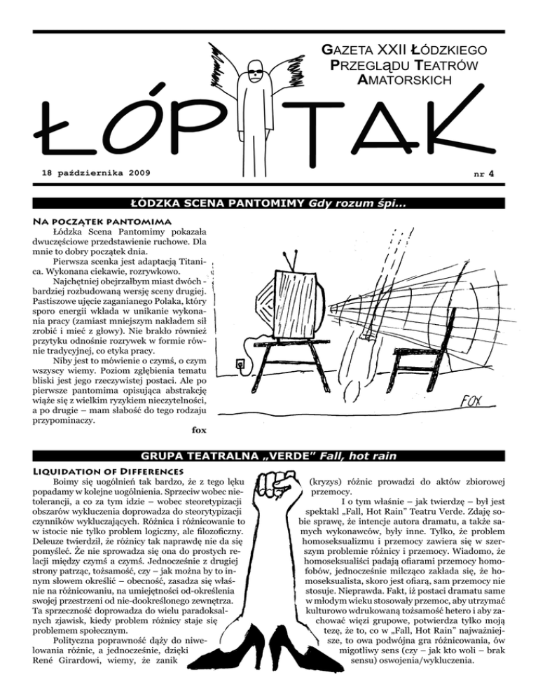 ŁÓDZKA SCENA PANTOMIMY Gdy rozum śpi… Na początek pantomima Łódzka Scena Pantomimy pokazała dwuczęściowe przedstawienie ruchowe. Dla mnie to dobry początek dnia. Pierwsza scenka jest adaptacją Titanica. Wykonana ciekawie, rozrywkowo. Najchętniej obejrzałbym miast dwóch bardziej rozbudowaną wersję sceny drugiej. Pastiszowe ujęcie zaganianego Polaka, który sporo energii wkłada w unikanie wykonania pracy (zamiast mniejszym nakładem sił zrobić i mieć z głowy). Nie brakło również przytyku odnośnie rozrywek w formie równie tradycyjnej, co etyka pracy. Niby jest to mówienie o czymś, o czym wszyscy wiemy. Poziom zgłębienia tematu bliski jest jego rzeczywistej postaci. Ale po pierwsze pantomima opisująca abstrakcję wiąże się z wielkim ryzykiem nieczytelności, a po drugie – mam słabość do tego rodzaju przypominaczy. fox GRUPA TEATRALNA „VERDE” Fall, hot rain Liquidation of Differences Boimy się uogólnień tak bardzo, że z tego lęku popadamy w kolejne uogólnienia. Sprzeciw wobec nietolerancji, a co za tym idzie – wobec steoretypizacji obszarów wykluczenia doprowadza do steorytypizacji czynników wykluczających. Różnica i różnicowanie to w istocie nie tylko problem logiczny, ale filozoficzny. Deleuze twierdził, że różnicy tak naprawdę nie da się pomyśleć. Że nie sprowadza się ona do prostych relacji między czymś a czymś. Jednocześnie z drugiej strony patrząc, tożsamość, czy – jak można by to innym słowem określić – obecność, zasadza się właśnie na różnicowaniu, na umiejętności od-określenia swojej przestrzeni od nie-dookreślonego zewnętrza. Ta sprzeczność doprowadza do wielu paradoksalnych zjawisk, kiedy problem różnicy staje się problemem społecznym. Polityczna poprawność dąży do niwelowania różnic, a jednocześnie, dzięki René Girardowi, wiemy, że zanik (kryzys) różnic prowadzi do aktów zbiorowej przemocy. I o tym właśnie – jak twierdzę – był jest spektakl „Fall, Hot Rain” Teatru Verde. Zdaję sobie sprawę, że intencje autora dramatu, a także samych wykonawców, były inne. Tylko, że problem homoseksualizmu i przemocy zawiera się w szerszym problemie różnicy i przemocy. Wiadomo, że homoseksualiści padają ofiarami przemocy homofobów, jednocześnie milcząco zakłada się, że homoseksualista, skoro jest ofiarą, sam przemocy nie stosuje. Nieprawda. Fakt, iż postaci dramatu same w młodym wieku stosowały przemoc, aby utrzymać kulturowo wdrukowaną tożsamość hetero i aby zachować więzi grupowe, potwierdza tylko moją tezę, że to, co w „Fall, Hot Rain” najważniejsze, to owa podwójna gra różnicowania, ów migotliwy sens (czy – jak kto woli – brak sensu) oswojenia/wykluczenia. Co do spraw czysto teatralnych. Realistyczna konwencja spektaklu nieco nużyła. Nie dlatego, że postaci były nieciekawe. Wręcz przeciwnie. Po prostu rzadko się widuje takie „regularne” przedstawienia na ŁóPTA. Aktorzy nb. mogliby popracować nad dykcją, bo tekst czasami gdzieś zanikał w niewyraźnej mowie. Siemion Karbovan twierdzić, że mamy do czynienia z prowokacją! Podejrzewamy, że spektakl przygotowany został przez seksistowską grupę heteryków, chcącą zdeprecjonować całe mniejszościowe środowisko. Czytelnicy tej noty, mogą oczywiście z oburzeniem zawołać: „Nie o tym, nie o tym ten spektakl!” Jasne, wszak był to spektakl o miłości – skomplikowanej, różnopoziomowej, choć nieco ekscentrycznej. Z zasłyszanego na foyer przedspektaklowego dialogu – dodam, że proroczego – wyciągnąć można zresztą podobne wnioski: Osoba 1: Szanuję ludzi, którzy robią teatr... z miłości do teatru. Osoba 2: Z miłości można też zabić (Ups!), albo zamordować sztukę. Zatem z miłości do miłości, powracamy do postawionej wcześniej tezy, że działania Teatru Verde, są krecią robotą sprytnie zakamuflowanej, spiskowej, antygejowskiej organizacji i to w co najmniej kilku przypadkach. Pytamy zatem: „Dlaczego spektakl pozbawiono sznytu reżyserskiego? Dlaczego inscenizację oparto na oklepanym kanonie zawodowej konwencji, tak odstającej od konwencji festiwalu offowego? Na czym oparto tę haniebną dyskredytację, deprecjację, zniechęcanie? Tymek Czy rzeczywiście miłość wszystko wybaczy? Sympatycy gejświata nie dopuściliby do takiej degrengolady, gdyż wiedzą, że idąc na bój z heteroheretykami, należy się gruntownie przygotować i przynajmniej z uwagą przeczytać tekst wystawianej sztuki (tutaj „Fall, hot rain”). Nigdy nie dopuściliby do lapsusów w postaci prezerwatywowej komunii, gdy zaraz potem padają słowa o gejowskich duszach idących do piekła. Przecież piekło to nie miejsce dla ludzi przyjmujących komunię? Oto, demaskujący kazus heretyckiej indolencji. Na szczęście czujny redakcyjny nos od razu zareagował, że coś jest nie-tego, nie-okey. Czujni na krzywdy mniejszości, ośmielamy się PRACOWNIA TEATRICK Cud Patatajec z Kopydłowa Początek zajścia napawał nadzieją na parodię. W krótkim czasie - gdzieś od momentu pierwszego wejścia księdza - wyjaśniło się jednak, że mamy do czynienia z grzeczną i wyrachowaną historyjką w całości wziętą ze „Spotkania z Balladą”, czy innego „Ranczo”, przeżenioną na dokładkę z postacią lokalnego japiego w pełnoortalio- nowym dresie. Czyli blady cień koncepcji z gorzkiej komedii Machulskiego. Raziło operowanie gwarą – stylizowanie jedynie fragmentów wypowiedzi. Gwara to nie łatwa sprawa, ale trudności jakiegoś zadania nie powinny stanowić usprawiedliwienia. Bo jak by było, gdyby taksówkarze skręcali jedynie w prawo? fox Stopnie zenitowe: I st. treść przedstawienia wywołujej nieodpartą chęć klinania długopisem Zenith II st. pojawia się chęć rzutu długopisem Zenith III st. objawia się pociągiem do użycia długopisu jako narzędzia do przebicia tętnicy szyjnej reżysera TAKI SOBIE TEATR Dotyk zła dzie
