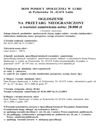 DOM POMOCY SPOŁECZNEJ W ŁUBIU ul. Pyskowicka 34 , 42-674 Łubie OGŁOSZENIE NA PRZETARG NIEOGRANICZONY o wartości zamówienia netto: 28.000 zł 1.Przedmiot zamówienia: Zakup róŜnych produktów spoŜywczych ( kasze, mąka, cukier, wyroby ciastkarskie i cukiernicze, makarony, kawy, przyprawy, syropy owocowe i aromaty) 2.Termin realizacji zamówienia : Od 02.01.2007 do 31.12.2007 r. 3.Kryteria oceny ofert : cena ( koszt ) – 100 % 4.Sposób uzyskania specyfikacji istotnych warunków zamówienia: Specyfikację istotnych warunków zamówienia moŜna odebrać w sekretariacie Domu Pomocy Społecznej w Łubiu, ul. Pyskowicka 34 , 42-674 Łubie od poniedziałku do piątku w godzinach od 8ºº do 14ºº oraz na stronie internetowej www.dpslubie.pl 5. Dopuszcza się składania ofert częściowych a) część I – pieczywo, b) część II- art. sypkie ( wyroby ciastkarskie, przyprawy, syropy, kasze itp.) 6. Miejsce i termin składania ofert : Dom Pomocy Społecznej w Łubiu, ul. Pyskowicka 34, 42-674 Łubie, sekretariat w godz. od 8ºº do 14 ºº do dnia 29.11.2006 do godz. 9ºº 7.Termin związania ofertą: 30 dni Termin wykonania zamówienia od 02.01.2007 do 31.12.2007r 8.Miejsce i termin otwarcia ofert: Dom Pomocy Społecznej w Łubiu, ul. Pyskowicka 34, 42-674 Łubie, sekretariat dnia 29.11.2006 r o godz. 10ºº. 9.Warunki uczestnictwa zawarte w Specyfikacji Istotnych Warunków Zamówienia O zamówienie mogą ubiegać się wykonawcy, którzy: a) spełniają warunki określone w art. 22, ust. 1 ustawy Prawo zamówień publicznych, b) nie podlegają wykluczeniu z postępowania na podstawie art. 24, ust. 1 i 2 ustawy Prawo zamówień publicznych, c) spełniają warunki zawarte w niniejszej specyfikacji. 10.Miejsce wykonania dostaw: Dom Pomocy Społecznej w Łubiu, ul. Pyskowicka 34, 42-674 Łubie 11.Nie jest wymagane wnoszenie wadium. 12.Zamawiający nie przewiduje zawarcia umowy ramowej. 13.Nie dopuszcza się składania ofert wariantowych. 14.Zamawiający nie ustanawia dynamicznego systemu zakupów. 15.Zamawiający nie przewiduje aukcji elektronicznej przy wyborze najkorzystniejszej oferty 16.Całkowity zakres zamówienia obejmuje dostawę róŜnych produktów spoŜywczych 17.Osoba uprawniona do kontaktu z dostawcą: Stefania Szpunar tel/ fax . 032-233-12-24 , w godz. od 8ºº do 14ºº , e-mail: [email protected]
