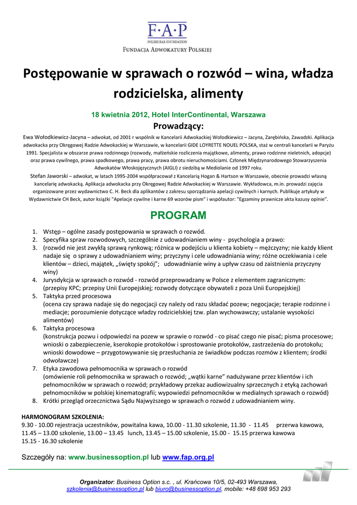 Postępowanie w sprawach o rozwód – wina, władza rodzicielska, alimenty 18 kwietnia 2012, Hotel InterContinental, Warszawa Prowadzący: Ewa Wołodkiewicz-Jacyna – adwokat, od 2001 r wspólnik w Kancelarii Adwokackiej Wołodkiewicz – Jacyna, Zarębińska, Zawadzki. Aplikacja adwokacka przy Okręgowej Radzie Adwokackiej w Warszawie, w kancelarii GIDE LOYRETTE NOUEL POLSKA, staż w centrali kancelarii w Paryżu 1991. Specjalista w obszarze prawa rodzinnego (rozwody, małżeńskie rozliczenia majątkowe, alimenty, prawo rodzinne nieletnich, adopcje) oraz prawa cywilnego, prawa spadkowego, prawa pracy, prawa obrotu nieruchomościami. Członek Międzynarodowego Stowarzyszenia Adwokatów Włoskojęzycznych (AIGLI) z siedzibą w Mediolanie od 1997 roku. Stefan Jaworski – adwokat, w latach 1995-2004 współpracował z Kancelarią Hogan & Hartson w Warszawie, obecnie prowadzi własną kancelarię adwokacką. Aplikacja adwokacka przy Okręgowej Radzie Adwokackiej w Warszawie. Wykładowca, m.in. prowadzi zajęcia organizowane przez wydawnictwo C. H. Beck dla aplikantów z zakresu sporządzania apelacji cywilnych i karnych. Publikuje artykuły w Wydawnictwie CH Beck, autor książki "Apelacje cywilne i karne 69 wzorów pism" i współautor: "Egzaminy prawnicze akta kazusy opinie". PROGRAM 1. Wstęp – ogólne zasady postępowania w sprawach o rozwód. 2. Specyfika spraw rozwodowych, szczególnie z udowadnianiem winy - psychologia a prawo: 3. (rozwód nie jest zwykłą sprawą rynkową; różnica w podejściu u klienta kobiety – mężczyzny; nie każdy klient nadaje się o sprawy z udowadnianiem winy; przyczyny i cele udowadniania winy; różne oczekiwania i cele klientów – dzieci, majątek, „święty spokój”; udowadnianie winy a upływ czasu od zaistnienia przyczyny winy) 4. Jurysdykcja w sprawach o rozwód - rozwód przeprowadzany w Polsce z elementem zagranicznym: (przepisy KPC; przepisy Unii Europejskiej; rozwody dotyczące obywateli z poza Unii Europejskiej) 5. Taktyka przed procesowa (ocena czy sprawa nadaje się do negocjacji czy należy od razu składać pozew; negocjacje; terapie rodzinne i mediacje; porozumienie dotyczące władzy rodzicielskiej tzw. plan wychowawczy; ustalanie wysokości alimentów) 6. Taktyka procesowa (konstrukcja pozwu i odpowiedzi na pozew w sprawie o rozwód - co pisać czego nie pisać; pisma procesowe; wnioski o zabezpieczenie, kserokopie protokołów i sprostowanie protokołów, zastrzeżenia do protokołu; wnioski dowodowe – przygotowywanie się przesłuchania ze świadków podczas rozmów z klientem; środki odwoławcze) 7. Etyka zawodowa pełnomocnika w sprawach o rozwód (omówienie roli pełnomocnika w sprawach o rozwód; „wątki karne” nadużywane przez klientów i ich pełnomocników w sprawach o rozwód; przykładowy przekaz audiowizualny sprzecznych z etyką zachowań pełnomocników w polskiej kinematografii; wypowiedzi pełnomocników w medialnych sprawach o rozwód) 8. Krótki przegląd orzecznictwa Sądu Najwyższego w sprawach o rozwód z udowadnianiem winy. HARMONOGRAM SZKOLENIA: 9.30 - 10.00 rejestracja uczestników, powitalna kawa, 10.00 - 11.30 szkolenie, 11.30 - 11.45 przerwa kawowa, 11.45 – 13.00 szkolenie, 13.00 – 13.45 lunch, 13.45 – 15.00 szkolenie, 15.00 - 15.15 przerwa kawowa 15.15 - 16.30 szkolenie Szczegóły na: www.businessoption.pl lub www.fap.org.pl Organizator: Business Option s.c. , ul. Krańcowa 10/5, 02-493 Warszawa, [email protected] lub [email protected], mobile: +48 698 953 293
