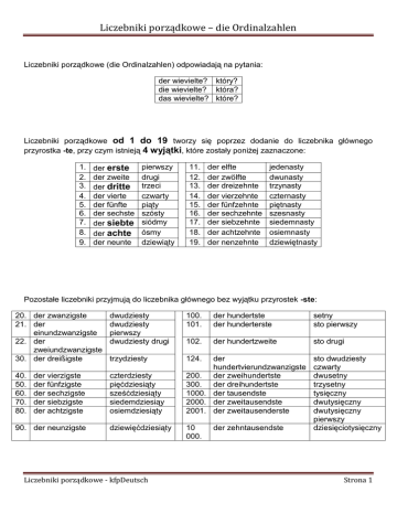 Liczebniki porządkowe – die Ordinalzahlen Liczebniki porządkowe (die Ordinalzahlen) odpowiadają na pytania: der wievielte? który? die wievielte? która? das wievielte? które? Liczebniki porządkowe od 1 do 19 tworzy się poprzez dodanie do liczebnika głównego przyrostka -te, przy czym istnieją 4 wyjątki, które zostały poniżej zaznaczone: 1. 2. 3. 4. 5. 6. 7. 8. 9. der erste der zweite der dritte der vierte der fünfte der sechste der siebte der achte der neunte pierwszy drugi trzeci czwarty piąty szósty siódmy ósmy dziewiąty 11. 12. 13. 14. 15. 16. 17. 18. 19. der elfte der zwölfte der dreizehnte der vierzehnte der fünfzehnte der sechzehnte der siebzehnte der achtzehnte der nenzehnte jedenasty dwunasty trzynasty czternasty piętnasty szesnasty siedemnasty osiemnasty dziewiętnasty Pozostałe liczebniki przyjmują do liczebnika głównego bez wyjątku przyrostek -ste: 20. der zwanzigste 21. der einundzwanzigste 22. der zweiundzwanzigste 30. der dreißigste dwudziesty dwudziesty pierwszy dwudziesty drugi 100. 101. der hundertste der hunderterste setny sto pierwszy 102. der hundertzweite sto drugi trzydziesty 124. 40. 50. 60. 70. 80. czterdziesty pięćdziesiąty sześćdziesiąty siedemdziesiąy osiemdziesiąty der vierzigste der fünfzigste der sechzigste der siebzigste der achtzigste 90. der neunzigste dziewięćdziesiąty Liczebniki porządkowe - kfpDeutsch der hundertvierundzwanzigste 200. der zweihundertste 300. der dreihundertste 1000. der tausendste 2000. der zweitausendste 2001. der zweitausenderste 10 000. der zehntausendste sto dwudziesty czwarty dwusetny trzysetny tysięczny dwutysięczny dwutysięczny pierwszy dziesięciotysięczny Strona 1 Liczebniki porządkowe – die Ordinalzahlen Liczebniki porządkowe występują z rodzajnikiem określonym, wskazującym oraz zaimkiem dzierżawczym i odmieniają się jak przymiotniki. Oto wzór odmiany po rodzajniku określonym i wskazującym: rodzaj męski der zweite rodzaj żeński rodzaj nijaki die zweite das zweite Nominativ mianownik Genitiv des zweiten der zweiten dopełniacz + końcówka „s” przy rzeczowniku Dativ dem zweiten der zweiten celownik Akkusativ den zweiten die zweite biernik des zweiten + końcówka „s” przy rzeczowniku dem zweiten das zweite UWAGA!!! Liczebniki porządkowe pisane cyfrą zawsze mają po sobie kropkę, co odróżnia je od liczebników głównych: Im 18. (achtzehnten) Jahrhundert. Wir treffen uns am 26. (sechsundzwanzigsten) Mai. Heute ist der 7. (siebte) November. Das ist das 1000. (tausendste) Gedicht von ihm. Dieses 4. (vierte) Bild ist echt toll. Dieser 1. (erste) rote Rock gefällt mir nicht. Wir leben im 21. (einundzwanzigsten) Jahrhundert. Liczebniki porządkowe - kfpDeutsch W osiemnastym wieku. Spotkamy się dwudziestego szóstego maja. Dzisiaj jest siódmy listopad. To jest jego tysięczny wiersz. Ten czwarty obraz jest naprawdę świetny. Ta pierwsza czerwona spódnica nie podoba mi się. Żyjemy w dwudziestym pierwszym wieku. Strona 2 Liczebniki porządkowe – die Ordinalzahlen Po zaimku dzierżawczym liczebniki porządkowe odmieniają się tak jak po rodzajniku nieokreślonym i otrzymują następujące końcówki: rodzaj męski mein vierter rodzaj żeński rodzaj nijaki meine vierte mein viertes Nominativ mianownik Genitiv meines vierten meiner vierten meines vierten dopełniacz + końcówka „s” + końcówka „s” przy rzeczowniku przy rzeczowniku Dativ meinem vierten meiner vierten meinem vierten celownik Akkusativ meinen vierten meine vierte mein viertes biernik Jeśli pytamy o datę, robimy to w następujący sposób: Der wievielte ist heute? Który dzisiaj jest? - Heute ist der 11. (elfte) Januar. -Dzisiaj jest pierwszy stycznia. Am wievielten fährst du nach Polen? Którego jedziesz do Polski? - Am 9. (neunten) September. -Dziewiątego września. Liczebniki porządkowe - kfpDeutsch Strona 3