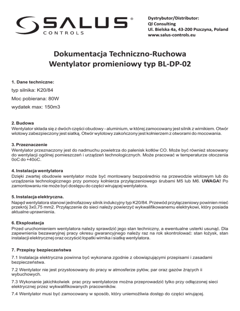Dystrybutor/Distributor: Ql Consulting Ul. Bielska 4a, 43-200 Pszczyna, Poland www.salus-controls.eu Dokumentacja Techniczno-Ruchowa Wentylator promieniowy typ BL-DP-02 1. Dane techniczne: typ silnika: K20/84 Moc pobierana: 80W wydatek max: 150m3 2. Budowa Wentylator sk³ada siê z dwóch czêœci obudowy - aluminium, w której zamocowany jest silnik z wirnikiem. Otwór wlotowy zabezpieczony jest siatk¹. Otwór wylotowy zakoñczony jest ko³nierzem z otworami do mocowania. 3. Przeznaczenie Wentylator przeznaczony jest do nadmuchu powietrza do palenisk kot³ów CO. Mo¿e byæ równie¿ stosowany do wentylacji ogólnej pomieszczeñ i urz¹dzeñ technologicznych. Mo¿e pracowaæ w temperaturze otoczenia 0oC do +40oC. 4. Instalacja wentylatora Dziêki zwartej obudowie wentylator mo¿e byæ montowany bezpoœrednio na przewodzie wlotowym lub do urz¹dzenia technologicznego przy pomocy ko³nierza przy³¹czeniowego œrubami M5 lub M6. UWAGA! Po zamontowaniu nie mo¿e byæ dostêpu do czêœci wiruj¹cej wentylatora. 5. Instalacja elektryczna. Napêd wentylatora stanowi jednofazowy silnik indukcyjny typ K20/84. Przewód przy³¹czeniowy powinien mieæ przekrój 3x0,75 mm2. Przy³¹czenie do sieci nale¿y powierzyæ wykwalifikowanemu elektrykowi, który posiada aktualne uprawnienia. 6. Eksploatacja Przed uruchomieniem wentylatora nale¿y sprawdziæ jego stan techniczny, a ewentualne usterki usun¹æ. Dla zapewnienia bezawaryjnej pracy okresu gwarancyjnego nale¿y raz na rok skontrolowaæ: stan ³o¿ysk, stan instalacji elektrycznej oraz oczyœciæ ³opatki wirnika i siatkê wentylatora. 7. Przepisy bezpieczeñstwa 7.1 Instalacja elektryczna powinna byæ wykonana zgodnie z obowi¹zuj¹cymi przepisami i zasadami bezpieczeñstwa. 7.2 Wentylator nie jest przystosowany do pracy w atmosferze py³ów, par oraz gazów ¿r¹cych ii wybuchowych. 7.3 Wykonanie jakichkolwiek prac przy wentylatorze mo¿na przeprowadziæ tylko przy od³¹czonej sieci elektrycznej przez wykwalifikowanych pracowników. 7.4 Wentylator musi byæ zamocowany w sposób, który uniemo¿liwia dostêp do czêœci wiruj¹cej. Informacja o pozbywaniu siê urz¹dzeñ elektrycznych i elektronicznych Przedstawiony symbol umieszczony na produktach lub do³¹czonej do nich dokumentacji informuje, ¿e niesprawnych urz¹dzeñ elektrycznych lub elektronicznych nie mo¿na wyrzucaæ razem z odpadami gospodarczymi. Prawid³owe postêpowanie w razie koniecznoœci utylizacji, powtórnego u¿ycia lub odzysku podzespo³ów polega na przekazaniu urz¹dzenia do wyspecjalizowanego punktu zbiórki, gdzie bêdzie przyjête bezp³atnie. W niektórych krajach produkt mo¿na oddac lokalnemu dystrybutorowi podczas zakupu innego urz¹dzenia. Prawid³owa utylizacja urz¹dzenia umo¿liwia zachowanie cennych zasobów i unikniêcie negatywnego wp³ywu na zdrowie i œrodowisko, które mo¿e byæ zagro¿one przez nieodpowiednie postêpowanie z odpadami. Szczegó³owe informacje o najbli¿szym punkcie zbiórki mo¿na uzyskaæ u w³adz lokalnych. Nieprawid³owa utylizacja odpadów zagro¿ona jest karami przewidzianymi w odpowiednich przepisach lokalnych. Data naprawy: Data naprawy: Podpis: GWARANCJA Producent zapewnia nabywcy prawid³owe dzia³anie urz¹dzenia przez okres 24 miesiêcy od daty sprzeda¿y. Gwarant zobowi¹zuje siê do naprawy urz¹dzenia, je¿eli wady wyst¹pi³y z winy producenta. Urz¹dzenie nale¿y dostarczyæ do miejsca zakupu, za³¹czaj¹c niniejsz¹ gwarancje z potwierdzon¹ dat¹ zakupu. Wszelkie zwi¹zane z tym koszty ponosi u¿ytkownik. Gwarancja nie obejmuje uszkodzeñ powsta³ych w wyniku niew³aœciwego u¿ytkowania, b¹dŸ z winy u¿ytkownika, uszkodzeñ mechanicznych lub powsta³ych w wyniku wy³adowañ atmosferycznych lub zwarcia. Gwarancja na sprzedany towar konsumpcyjny nie wy³¹cza, nie ogranicza ani nie zawiesza uprawnieñ kupuj¹cego wynikaj¹cych z niezgodnoœci towaru z umow¹. Gwarancja bez daty sprzeda¿y, daty dostawy oraz podpisów jest niewa¿na. .............................................. .............................................. pieczêæ sprzedawcy data sprzeda¿y