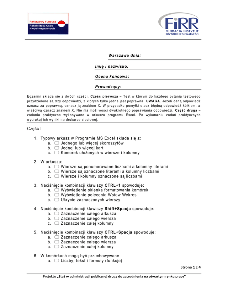 Warszawa dnia: Imię i nazwisko: Ocena końcowa: Prowadzący: Egzamin składa się z dwóch części. Część pierwsza – Test w którym do każdego pytania testowego przydzielone są trzy odpowiedzi, z których tylko jedna jest poprawna. UWAGA. Jeżeli daną odpowiedź uznasz za poprawną, oznacz ją znakiem X. W przypadku pomyłki otocz błędną odpowiedź kółkiem, a właściwą oznacz znakiem X. Nie ma możliwości dwukrotnego poprawiania odpowiedzi. Część druga – zadania praktyczne wykonywane w arkuszu programu Excel. Po wykona niu zadań praktycznych wydrukuj ich wyniki na drukarce sieciowej. Część I 1. Typowy arkusz w Programie MS Excel składa się z: a. Jednego lub więcej skoroszytów b. Jednej lub więcej kart c. Komorek ułożonych w wiersze i kolumny 2. W arkuszu: a. Wiersze są ponumerowane liczbami a kolumny literami b. Wiersze są oznaczone literami a kolumny liczbami c. Wiersze i kolumny oznaczone są liczbami 3. Naciśnięcie kombinacji klawiszy CTRL+1 spowoduje: a. Wyświetlenie okienka formatowania komórek b. Wyświetlenie polecenia Wstaw Wyk res c. Ukrycie zaznaczonych wierszy 4. Naciśnięcie kombinacji a. Zaznaczenie b. Zaznaczenie c. Zaznaczenie klawiszy Shift+Spacja spowoduje: całego arkusza całego wiersza całej kolumny 5. Naciśnięcie kombinacji a. Zaznaczenie b. Zaznaczenie c. Zaznaczenie klawiszy CTRL+Spacja spowoduje: całego arkusza całego wiersza całej kolumny 6. W komórkach mogą być przechowywane a. Liczby, tekst i formuły (funkcje) Strona 1 z 4 Projektu „Staż w administracji publicznej drogą do zatrudnienia na otwartym rynku pracy” b. Tylko liczby i tekst c. Tekst, cyfry, grafika i funkcje 7. Każda a. b. c. formuła w MS Excel zaczyna się od: Znaku / Znaku = Zawsze od znaku z zakresu 1..9 8. Który z poniższych zapisów jest poprawną formułą w Programie MS Excel: a. =Suma(a2:a10) b. =Suma(a2 a10) c. =suma(a2,a10) 9. Który z poniższych zapisó w jest poprawną formą funkcji JEŻELI a. =JEŻELI(A1>10,"Większe od 10","Mniejsze od 10") b. =JEŻELI(A1>10;Większe od 10;Mniejsze od 10) c. =JEŻELI(A1>10;"Większe od 10";"Mniejsze od 10") 10. Funkcja SUMA ma a. Tylko 3 parametry b. Tylko 2 parametry c. 2 i więcej parametrów 11. Aby obliczyć ilość miesięcy między dwoma datami posłużymy się funkcją a. DATA() b. DATA.RÓŻNICA() c. CZĘŚĆ.ROKU() 12. Które z poniższych wyrażeń jest Poprawnym oznaczeniem zakresu komórek a. (A5:B20) b. (A5,B20) c. (A5-B20) 13. By posortować zawartość tabeli w arkuszu należy: a. Skorzystać z polecenia Sortuj na wstążce Dane b. Skorzystać z polecenia Grupuj na wstążce Dane c. Skorzystać z polecenia Sortuj w menu kontekstowym komórki 14. By wygląd komórek zmieniał się zależnie od ich zawartości należy: a. Skorzystać z polecenia Format komórki b. Skorzystać z polecenia formatowanie warunkowe na wstążce Narzędzia główne c. Skorzystać z narzędzia Edytuj komórki Strona 2 z 4 Projektu „Staż w administracji publicznej drogą do zatrudnienia na otwartym rynku pracy” 15. W formatowaniu warunkowym danego obszaru maksymalna liczba warunków wynosi: a. 3 Warunki b. 4 Warunki c. Nie ma takich ograniczeń 16. By dodać komentarz do komórki należy a. Skorzystać z polecenia Format komórki b. Kliknąć prawym przyciskiem myszki i wybrać polecenie Wstaw Komentarz z Menu kontekstowego c. Skorzystać z polecenia Edycja Dodaj komentarz 17. Aby wyłączyć działanie filtru zaawansowanego należy a. Skorzystać z polecenia Sortuj i filtruj pokaż wszystko b. Skorzystać z polecenia wyczyść filtr w menu danego filtra c. Skorzystać ze skrótu klawiaturowego CTRL+A 18. Aby zaimportować dane z pliku txt należy a. Pobrać dane zewnętrze z pliku za pomocą narzędzi na wstążce Dane sekcja Dane zewnętrzne b. Skorzystać z menu Plik Otwórz c. Otworzyć plik tekstowy txt i skopiować z niego zawartość do arkusza Excela Część II Zadanie 1 W skoroszycie o nazwie zadanie1 w pliku Egzamin.xlsx znajduje się tabela do której zaimportuj dane z pliku oceny.txt (zwróć uwagę na polskie znaki). Sformatuj tabelę tak aby kolumny nagłówkowe oraz wiersze nagłówkowe były wyróżnione. Nazwy przedmiotów oraz lista uczniów mają być sformatowane według: Czcionka pogrubiona Kolor czcionki niebieski Wyśrodkowanie w pionie i poziomie Krój czcionki Tahoma Nad tabelą dodaj nowy wiersz i wstaw tam tytuł tabeli – „Oceny końcowe klasy VIb – przygotował/a Twoje Imię i nazwisko” – sformatuj tytuł według własnego pomysłu. W kolumnie N umieść formułę liczącą średnią z ocen danego ucznia. W wierszu o numerze 16 oblicz też średnią ocenę z danego przedmiotu. Ustal formatowanie Strona 3 z 4 Projektu „Staż w administracji publicznej drogą do zatrudnienia na otwartym rynku pracy” warunkowe tak by uczniowie ze średnią ocen większą niż 4,8 byli wyróżnieni kolorem zielonym, a uczniowie ze średnią mniejszą niż 3 byli wyróżnieni kolorem czerwonym . Sformatuj średnie dla poszczególnych przedmiotów. Kolorem czerwonym wyróżnij nazwy tych przedmiotów które mają średnią poniżej 4,1. Zadanie 2 W kolumnie „Czerwony Pasek” zastosuj formułę wpisującą do komórki słowo „TAK” pod warunkiem że średnia danego ucznia jest większa od 4,6. W pozostałych przypadkach powinno pojawiać się słowo „NIE” – zastosuj funkcję Jeżeli Zadanie 3 Wykorzystując dane z zadania1 posortuj listę uczniów tak by na jej początku byli Ci z najlepszą średnią ocen. Wydrukuj Tabelę. Zadanie 4 Utwórz w nowym arkuszu wykres kołowy rozsunięty obrazujący średnie oceny uczniów. Pokaż na wykresie etykiety danych wraz z wartościami. Pamiętaj aby zatytułować wykres „Średnie oceny uczniów klasy VI - przygotował/a Twoje Imię i nazwisko”. Legendę umieść pod wykresem. Sformatuj wygląd wykresu według własnego pomysłu. Wydrukuj Wykres. Strona 4 z 4 Projektu „Staż w administracji publicznej drogą do zatrudnienia