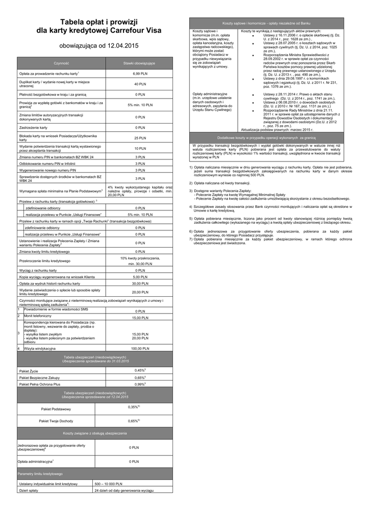 Tabela opłat i prowizji dla karty kredytowej Carrefour Visa obowiązująca od 12.04.2015 Czynność Opłata za prowadzenie rachunku karty Stawki obowiązujące 1 Koszty sądowe i komornicze (m.in. opłata skarbowa, wpis sądowy, opłata kancelaryjna, koszty zastępstwa radcowskiego), którymi może zostać obciążony Posiadacz w przypadku niewywiązania się ze zobowiązań wynikających z umowy. Koszty te wynikają z następujących aktów prawnych: Ustawy z 16.11.2006 r. o opłacie skarbowej (tj. Dz. U. z 2014 r., poz. 1628 ze zm.) , Ustawy z 28.07.2005 r. o kosztach sądowych w sprawach cywilnych (tj. Dz. U. z 2014, poz. 1025 ze zm.), Rozporządzenia Ministra Sprawiedliwości z 28.09.2002 r. w sprawie opłat za czynności radców prawnych oraz ponoszenia przez Skarb Państwa kosztów pomocy prawnej udzielonej przez radcę prawnego ustanowionego z Urzędu (tj. Dz. U. z 2013 r. , poz. 490 ze zm.), Ustawy z dnia 29.08.1997 r. o komornikach sądowych i egzekucji (tj. Dz. U. z 2011 r. Nr 231, poz. 1376 ze zm.). Opłaty administracyjne (m.in. urzędowe ustalenie danych osobowych i adresowych, zapytania do Urzędu Stanu Cywilnego) Ustawy z 28.11.2014 r. Prawo o aktach stanu cywilnego (Dz. U. z 2014 r., poz. 1741 ze zm.), Ustawa z 06.08.2010 r. o dowodach osobistych (Dz. U. z 2010 r. Nr 167, poz. 1131 ze zm.),) Rozporządzenie Rady Ministrów z dnia 21.11. 2011 r. w sprawie opłat za udostępnienie danych z Rejestru Dowodów Osobistych i dokumentacji związanej z dowodami osobistymi (Dz.U. z 2012 r., poz. 75 ze zm.). Aktualizacja podstaw prawnych: marzec 2015 r. 6,99 PLN Duplikat karty / wydanie nowej karty w miejsce utraconej 40 PLN Płatność bezgotówkowa w kraju i za granicą 0 PLN Prowizja za wypłatę gotówki z bankomatów w kraju i za granicą2 5% min. 10 PLN Zmiana limitów autoryzacyjnych transakcji dokonywanych kartą 0 PLN Zastrzeżenie karty 0 PLN Blokada karty na wniosek Posiadacza/Użytkownika karty 25 PLN Wydanie potwierdzenia transakcji kartą wystawionego przez akceptanta transakcji 10 PLN Zmiana numeru PIN w bankomatach BZ WBK 24 3 PLN Odblokowanie numeru PIN w Infolinii 3 PLN Wygenerowanie nowego numeru PIN 3 PLN Sprawdzenie dostępnych środków w bankomatach BZ WBK 24 3 PLN Wymagana spłata minimalna na Planie Podstawowym3 4% kwoty wykorzystanego kapitału oraz należne opłaty, prowizje i odsetki, min. 20,00 PLN zdefiniowanie odbiorcy 0 PLN realizacja przelewu w Punkcie „Usługi Finansowe” W przypadku transakcji bezgotówkowych i wypłat gotówki dokonywanych w walucie innej niż waluta rozliczeniowa karty (PLN) pobierana jest opłata za przewalutowanie do waluty rozliczeniowej karty (PLN) w wysokości 1% wartości transakcji, uwzględniona w kwocie transakcji wyrażonej w PLN 1) Opłata naliczana miesięcznie w dniu generowania wyciągu z rachunku karty. Opłata nie jest pobierana, jeżeli suma transakcji bezgotówkowych zaksięgowanych na rachunku karty w danym okresie rozliczeniowym wyniesie co najmniej 500 PLN. 3) Dostępne warianty Polecenia Zapłaty: - Polecenie Zapłaty na kwotę Wymagalnej Minimalnej Spłaty - Polecenie Zapłaty na kwotę całości zadłużenia umożliwiającą skorzystanie z okresu bezodsetkowego. 4) Szczegółowe zasady stosowania przez Bank czynności monitujących i naliczania opłat są określone w Umowie o kartę kredytową. 5% min. 10 PLN Przelew z rachunku karty w ramach opcji „Twoje Rachunki” (transakcja bezgotówkowa): zdefiniowanie odbiorcy 0 PLN realizacja przelewu w Punkcie „Usługi Finansowe” 0 PLN Ustanowienie i realizacja Polecenia Zapłaty / Zmiana wariantu Polecenia Zapłaty3 0 PLN Zmiana kwoty limitu kredytowego 0 PLN 10% kwoty przekroczenia, Przekroczenie limitu kredytowego Dodatkowe koszty w przypadku operacji wykonanych za granicą 2) Opłata naliczana od kwoty transakcji. Przelew z rachunku karty (transakcja gotówkowa): 3 min. 30,00 PLN Wyciąg z rachunku karty 0 PLN Kopia wyciągu wygenerowana na wniosek Klienta 5,00 PLN Opłata za wydruk historii rachunku karty 30,00 PLN Wydanie zaświadczenia o spłacie lub sposobie spłaty limitu kredytowego 20,00 PLN Czynności monitujące związane z nieterminową realizacją zobowiązań wynikających z umowy i nieterminową spłatą zadłużenia 4: 1 Powiadomienie w formie wiadomości SMS 0 PLN 2 Monit telefoniczny 15,00 PLN Korespondencja kierowana do Posiadacza (np. monit listowny, wezwanie do zapłaty, prośba o dopłatę): 3 - wysyłka listem zwykłym 15,00 PLN - wysyłka listem poleconym za potwierdzeniem 20,00 PLN odbioru 4 Koszty sądowe i komornicze - opłaty niezależne od Banku Wizyta windykacyjna 100,00 PLN Tabela ubezpieczeń (nieobowiązkowych) Ubezpieczenia sprzedawane do 31.03.2015 Pakiet Życie 0,45%5 Pakiet Bezpieczne Zakupy 0,65%5 Pakiet Pełna Ochrona Plus 0,99%5 Tabela ubezpieczeń (nieobowiązkowych) Ubezpieczenia sprzedawane od 12.04.2015 0,35%5) Pakiet Podstawowy 0,65%5) Pakiet Twoje Dochody Koszty związane z obsługą ubezpieczenia Jednorazowa opłata za przygotowanie oferty ubezpieczeniowej6 0 PLN Opłata administracyjna7 0 PLN Parametry limitu kredytowego Ustalany indywidualnie limit kredytowy 500 – 10 000 PLN Dzień spłaty 24 dzień od daty generowania wyciągu 5) Opłata pobierana miesięcznie, liczona jako procent od kwoty stanowiącej różnicę pomiędzy kwotą zadłużenia całkowitego (wykazanego na wyciągu) a kwotą opłaty ubezpieczeniowej z bieżącego okresu. 6) Opłata jednorazowa za przygotowanie oferty ubezpieczenia, pobierana za każdy pakiet ubezpieczeniowy, do którego Posiadacz przystępuje. 7) Opłata pobierana miesięcznie za każdy pakiet ubezpieczeniowy, w ramach którego ochrona ubezpieczeniowa jest świadczona.