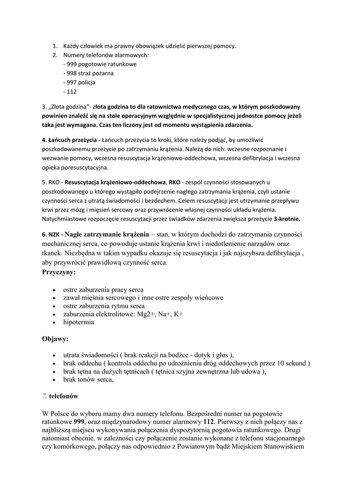 1. Każdy człowiek ma prawny obowiązek udzielić pierwszej pomocy. 2. Numery telefonów alarmowych: - 999 pogotowie ratunkowe - 998 straż pożarna - 997 policja - 112 3. „Złota godzina”- złota godzina to dla ratownictwa medycznego czas, w którym poszkodowany powinien znaleźć się na stole operacyjnym względnie w specjalistycznej jednostce pomocy jeżeli taka jest wymagana. Czas ten liczony jest od momentu wystąpienia zdarzenia. 4. Łańcuch przeżycia - Łańcuch przeżycia to kroki, które należy podjąć, by umożliwić poszkodowanemu przeżycie po zatrzymaniu krążenia. Należą do nich: wczesne rozpoznanie i wezwanie pomocy, wczesna resuscytacja krążeniowo-oddechowa, wczesna defibrylacja i wczesna opieka poresuscytacyjna. 5. RKO - Resuscytacja krążeniowo-oddechowa, RKO - zespół czynności stosowanych u poszkodowanego u którego wystąpiło podejrzenie nagłego zatrzymania krążenia, czyli ustanie czynności serca z utratą świadomości i bezdechem. Celem resuscytacji jest utrzymanie przepływu krwi przez mózg i mięsień sercowy oraz przywrócenie własnej czynności układu krążenia. Natychmiastowe rozpoczęcie resuscytacji przez świadków zdarzenia zwiększa przeżycie 3-krotnie. 6. NZK - Nagłe zatrzymanie krążenia – stan, w którym dochodzi do zatrzymania czynności mechanicznej serca, co powoduje ustanie krążenia krwi i niedotlenienie narządów oraz tkanek. Niezbędna w takim wypadku okazuje się resuscytacja i jak najszybsza defibrylacja , aby przywrócić prawidłową czynność serca. Przyczyny: ostre zaburzenia pracy serca zawał mięśnia sercowego i inne ostre zespoły wieńcowe ostre zaburzenia rytmu serca zaburzenia elektrolitowe: Mg2+, Na+, K+ hipotermia Objawy: utrata świadomości ( brak reakcji na bodźce - dotyk i głos ), brak oddechu ( kontrola oddechu po udrożnieniu dróg oddechowych przez 10 sekund ) brak tętna na dużych tętnicach ( tętnica szyjna zewnętrzna lub udowa ), brak tonów serca, 7. telefonów W Polsce do wyboru mamy dwa numery telefonu. Bezpośredni numer na pogotowie ratunkowe 999, oraz międzynarodowy numer alarmowy 112. Pierwszy z nich połączy nas z najbliższą miejscu wykonywania połączenia dyspozytornią pogotowia ratunkowego. Drugi natomiast obecnie, w zależności czy połączenie zostanie wykonane z telefonu stacjonarnego czy komórkowego, połączy nas odpowiednio z Powiatowym bądź Miejskiem Stanowiskiem Kierowania Straży Pożarnej lub Komendą Powiatową Policji. Jak wywnioskować można z powyższego, korzystniejsze będzie bezpośrednie połączenie z numerem 999, gdyż ze 112 połączenie będzie musiało zostać tak czy siak przekazane dyspozytorowi pogotowia ratunkowego. Docelowo numer 112 będzie łączył wzywających pomoc z Centrum Powiadamiania Ratunkowego skąd dyspozytorzy będą wysyłać odpowiednie służby. Przekazywane informacje Podczas wzywania pomocy musimy przekazać dyspozytorowi kilka informacji. Wbrew pozorom kolejność ich przekazywania jest bardzo ważna. Zawsze jako pierwsze powinniśmy podać gdzie zdarzenie ma miejsce. Ma to ogromne znaczenie w momencie, gdyby połączenie z numerem alarmowym zostało przerwana (rozładowana bateria telefonu komórkowego, zgubienie sieci, brak prądu w domu itp.). Co i w jakiej kolejności powinniśmy w takim razie podać wzywając karetkę? I. Miejsce zdarzenia Określamy najdokładniej jak potrafimy miejsce w którym doszło do zdarzenia. Jeśli sytuacja ma miejsce w domu/bloku przekazujemy dyspozytorowi dokładny adres: nazwa ulicy, numer domu, bloku, klatki, piętro. Podajemy także miejscowość gdyż zdarza się, że w dwóch pobliskich miasteczkach znajdują się dwie takie same ulice. Gdy sytuacja wydarzyła się na drodze także staramy się określić orientacyjny adres miejsca zdarzenia. Jeśli jest to niemożliwe podajemy charakterystyczne punkty orientacyjne. II. Powód wezwania Przekazujemy informacje o tym dlaczego dzwonimy, co się wydarzyło. Określamy czy jest to np. zachorowanie (ból w klatce piersiowej, napad duszności, drgawek itd), wypadek komunikacyjny, uraz, oparzenie etc. III. Ilość i stan poszkodowanych Staramy się określić ile jest osób potrzebujących pomocy i w jakim są stanie. Od tej informacji zależy, ile karetek i jakiego typu (zespół podstawowy, zespół specjalistyczny) zostanie od razu wysłanych na miejsce zdarzenia. Jeśli np. miał miejsce wypadek samochodowy, urazów w nim doznały 3 osoby będące obecnie nieprzytomne, to pewnikiem jest, że jeden Zespół Ratownictwa Medycznego nie wystarczy do udzielenia im wszystkim pomocy. Podajemy objawy które możemy zaobserwować (np. brak oddechu, krwotok z ręki, uraz głowy, drgawki), jak i te które podają sami poszkodowani (np. piekący ból w klatce piersiowej, duszność, zawroty głowy). IV. Dane poszkodowanego Przekazujemy dyspozytorowi czy osobą poszkodowaną jest dorosły czy dziecko, kobieta czy mężczyzna. Jeśli jest to możliwe podajemy jego wiek, imię i nazwisko. V. Dane wzywającego Na samym końcu, po przekazaniu wszystkich powyższych informacji, podajemy nasze imię i nazwisko, i numer telefonu spod którego dzwonimy. Kilka uwag W trakcie rozmowy uważnie słuchajmy tego, co mówi dyspozytor. Może on nam zadawać pytania, które ułatwią np. dojazd ZRM na miejsce zdarzenia, może także powiedzieć co możemy zrobić do czasu przyjazdu karetki. Nigdy nie kończymy rozmowy jako pierwsi, dyspozytor po potwierdzeniu przyjęcia wezwania pierwszy odkłada słuchawkę! Nie wolno dzwonić pod numery alarmowe dla zabawy, w tym czasie ktoś naprawdę potrzebujący może próbować wezwać pomocy! Fałszywe wezwania są zgłaszane na Policję, a ludzie je wykonujący pociągani do odpowiedzialności karnej. 1. Bezpieczeństwo własne ( przykł. Rękawiczki, maseczka, okulary ochronne ) 2. Bezpieczeństwo miejsca ( usunięcie nogą ostrych, niebezpiecznych przedmiotów, przeniesienie ofiary w bezpieczne miejsce ) 3. Sprawd