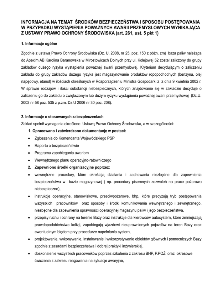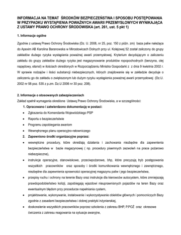 INFORMACJA NA TEMAT ŚRODKÓW BEZPIECZEŃSTWA I SPOSOBU POSTĘPOWANIA W PRZYPADKU WYSTĄPIENIA POWAŻNYCH AWARII PRZEMYSŁOWYCH WYNIKAJĄCA Z USTAWY PRAWO OCHRONY ŚRODOWISKA (art. 261, ust. 5 pkt 1) 1. Informacje ogólne Zgodnie z ustawą Prawo Ochrony Środowiska (Dz. U. 2008, nr 25, poz. 150 z późn. zm) baza paliw należąca do Apexim AB Karolina Baranowska w Mirostowicach Dolnych przy ul. Kolejowej 52 został zaliczony do grupy zakładów dużego ryzyka wystąpienia poważnej awarii przemysłowej. Kryterium decydującym o zaliczeniu zakładu do grupy zakładów dużego ryzyka jest magazynowanie produktów ropopochodnych (benzyna, olej napędowy, etanol) w ilościach określonych w Rozporządzeniu Ministra Gospodarki z z dnia 9 kwietnia 2002 r. W sprawie rodzajów i ilości substancji niebezpiecznych, których znajdowanie się w zakładzie decyduje o zaliczeniu go do zakładu o zwiększonym lub dużym ryzyku wystąpienia poważnej awarii przemysłowej (Dz.U. 2002 nr 58 poz. 535 z p.zm. Dz.U 2006 nr 30 poz. 208). 2. Informacje o stosowanych zabezpieczeniach Zakład spełnił wymagania określone Ustawą Prawo Ochrony Środowiska, a w szczególności: 1. Opracowano i zatwierdzono dokumentację w postaci: Zgłoszenia do Komendanta Wojewódzkiego PSP Raportu o bezpieczeństwie Programu zapobiegania awariom Wewnętrznego planu operacyjno-ratowniczego 2. Zapewniono środki organizacyjne poprzez: wewnętrzne procedury, które określają działania i zachowania niezbędne dla zapewnienia bezpieczeństwa w bazie magazynowej ( np. procedury pisemnych zezwoleń na prace pożarowo niebezpieczne), instrukcje operacyjne, stanowiskowe, przeciwpożarowe, bhp, które precyzują tryb postępowania wszystkich pracowników oraz sposoby i środki komunikowania wewnętrznego i zewnętrznego, niezbędne dla zapewnienia sprawności operacyjnej magazynu paliw i jego bezpieczeństwa, przepisy ruchu i ochrony na terenie Bazy oraz instrukcje dla kierowców autocystern, które zmniejszają prawdopodobieństwo kolizji, zapobiegają wjazdowi nieuprawnionych pojazdów na teren Bazy oraz ewentualnym błędom przy procedurze napełniania cystern, projektowanie, wykonywanie, instalowanie i wykorzystywanie obiektów głównych i pomocniczych Bazy zgodnie z zasadami bezpieczeństwa i dobrej praktyki inżynierskiej, doskonalenie wszystkich pracowników poprzez szkolenia z zakresu BHP, P.POŻ oraz okresowe ćwiczenia z zakresu reagowania na sytuacje awaryjne, regularne prace konserwacyjne i remonty obiektów, nadzór operacyjny, okresowe kontrole, przeglądy techniczne i audyty, które umożliwiają rozpoznanie nieprawidłowości oraz podejmowanie działań korygujących i zapobiegawczych, analizy i oceny Kierownika Bazy i pracowników specjalistycznych komórek PW Apexim AB zapewnienie niezbędnych uprawnień i kwalifikacji pracowników na stanowiskach związanych z obsługą urządzeń technicznych 3. Zapewniono techniczne środki bezpieczeństwa poprzez: 3.1. systemy monitorowania instalacji paliwowych komputerowy system wizualizacji procesów technologicznych, stały pomiar i sygnalizacja szczelności zbiorników paliwowych, stały pomiar ciśnienia cieczy w rurociągach technologicznych, systemy kontroli ilości, temperatury oraz przepełnienia zbiorników paliwowych. 3.2 systemy zabezpieczające przed powstaniem sytuacji awaryjnej układ wahadła gazowego, do którego podłączone są zbiorniki magazynowe benzyn oraz stanowiska nalewu do autocystern i rozładunku cystern kolejowych, który zapobiega uwalnianiu oparów benzyn do atmosfery – współpracując z układem odzysku oparów, blokadowy system uziemień autocystern przy napełnianiu oraz cystern kolejowych przy rozładunku , który eliminuje elektryczność statyczną jako źródło zapłonu i uniemożliwia napełnianie lub rozładunek bez podłączonego uziemienia, uziemienie instalacji technologicznej oraz zastosowanie ochrony odgromowej, które ogranicza możliwość wystąpienia dodatkowych źródeł zapłonu, zabezpieczenia antykorozyjne zbiorników magazynowych naziemnych , rurociągów technologicznych naziemnych i podziemnych, zastosowanie zaworów bezpieczeństwa na rurociągach doprowadzających paliwo ze zbiorników do pompowni, rurociągach przy froncie nalewczym, które zapobiegają potencjalnemu zniszczeniu aparatury wskutek nadciśnienia, zastosowanie zaworów oddechowych z przerywaczami ogniowymi na zbiornikach magazynowych, które zapobiegają potencjalnemu zniszczeniu aparatury wskutek nadciśnienia lub podciśnienia oraz przedostaniu się płomienia do wnętrza zbiornika. 3.2 systemy ochrony bazy paliw przed dostępem osób niepowołanych system telewizji przemysłowej nadzorowanej całodobowo przez służby ochrony elektroniczny system kontroli dostępu osób na teren bazy paliw ogrodzony teren nadzorowany całodobowo przez dozór fizyczny służb ochrony i specjalistów p.poż. 3.3. techniczne środki powstrzymania krytycznego rozwoju sytuacji awaryjnej oraz techniczne środki przeciwdziałania i zwalczania skutków awaryjnego uwolnienia paliw ropopochodnych, system awaryjnych ręcznych wyłączników przy stanowisku napełniania autocystern i w dyspozytorni, który umożliwia zatrzymanie procesu nalewu z każdego stanowiska frontu nalewczego oraz wyłączenie całej instalacji nalewu z dyspozytorni w momencie wystąpienia ewentualnego rozszczelnienia lub przelania autocysterny, system awaryjnych wyłączników na stanowisku rozładunku cystern kolejowych, w pompowniach technologicznych oraz w dyspozytorni, który umożliwia zatrzymanie procesu rozładunku cystern kolejowych zdalnie sterowane zawory odcinające na rurociągach technologicznych, które umożliwiają ograniczenie ilości uwolnionego paliwa w wypadku rozszczelnienia, agregat prądotwórczy, który zapewnia awaryjne zasilanie dla całej infrastruktury bazy, środki łączności i alarmowania przy stanowisku rozładowczym frontu kolejowego, froncie nalewczym, stanowiskach 