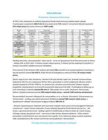 ŁSSE w 2012 roku Po pierwsze, tworzymy miejsca pracy W 2012 roku Inwestorzy w Łódzkiej Specjalnej Strefie Ekonomicznej zadeklarowali nakłady inwestycyjne na poziomie 682,9 mln zł oraz utworzenie 715 nowych i utrzymanie dotychczasowych 572 miejsc pracy (w sumie oznacza to 1287 osób). Konstantynów Łódzki Mabion 12 kw ietnia 2012 farmaceutyka 30 000 000,00 30 0 UOS 23 kw ietnia 2012 usługi remontow o-logistyczne 35 000 000,00 120 0 Łow icz Topsil 10 maja 2012 przetw órstw o silikonu 10 000 000,00 50 0 Skierniew ice Sevener Logistic 25 maja 2012 40 0 Tomaszów Mazow iecki 31 maja logistyka opakow ania 12 000 000,00 Aquila 440 000,00 4 62 Radomsko Fuji Seal 18 czerw ca opakow ania 25 986 000,00 25 245 Kutno Colex 4 lipca barwniki do tworzy w sztuczny ch 38 000 000,00 20 73 Konstantynów Łódzki Przykona Am bro Logistic 20 lipca logistyka 3 700 000,00 5 11 Beef Beef 11 października 2012 rozbiór mięsa/przetw órstw o 69 500 000,00 105 0 Kutno Ceram ika Paradyż 18 października 2012 płytki ceramiczne 50 000 000,00 15 0 Tomaszów Mazow iecki UMA Investm ents 15 listopada spożyw cza 225 808 000,00 40 7 Kutno Faller 22 listopada farmaceutyczna 20 867 815,00 35 0 Łódź Rena 22 listopada fotoelektryczny 12 932 640,00 10 138 Łódź SiA Piterucha 6 grudnia tw orzyw a sztuczne 1 200 000,00 6 36 Ksaw erów MP Production 17 grudnia gazy techniczne 102 500 000,00 10 0 Turek ILS 21 grudnia logistyka 45 000 000,00 200 0 Łódź 682 934 455,00 715 572 Łącznie w ydane Według dziennika „Rzeczpospolita” takie wyniki ‐ na tle 14 Specjalnych Stref Ekonomicznych w Polsce ‐ dałyby ŁSSE w 2012 roku: 2 miejsce (nowe miejsca pracy), 3 miejsce (liczba wydanych zezwoleń), 4 miejsce (wysokość zadeklarowanych nakładów). Przez ponad 15 lat istnienia ŁSSE wydano jak dotąd 218 zezwoleń oraz przeprowadzono inwestycje o łącznej wartości ponad 9,8 mld zł, dzięki którym przedsiębiorcy utworzyli blisko 26 tysięcy miejsc pracy. Oprócz tego w tym roku złożyliśmy i wkrótce trafi pod obrady rządu tzw. wniosek rozszerzeniowy (włączenie 59,5 ha oraz wyłączenie 38 ha), który spowoduje w sumie zwiększenie obszaru strefy z dotychczasowych 1276 do 1298 ha. Co oznacza tzw. wniosek rozszerzeniowy? Siedem nowych projektów inwestycyjnych na terenach prywatnych włączanych do ŁSSE. Przedsiębiorcy deklarują na nich inwestycje o wartości ponad 300 mln zł. Tylko dzięki nim w Łodzi, Strykowie, Kleszczowie, Kaliszu i Zelowie powstanie ponad 760 nowych miejsc pracy, a ponad 1100 zostanie utrzymanych. Na pozostałych terenach należących do samorządów, m.in. w Kutnie, Koluszkach, Ostrzeszowie czy Sochaczewie – według szacunków powstanie dodatkowo ponad 788 nowych miejsc pracy, a spodziewane nakłady inwestycyjne osiągną wielkość 290 mln zł. ‐ Naszym najważniejszym zadaniem jest tworzenie nowych miejsc pracy oraz przyciąganie kolejnych inwestorów – mówi Tomasz Sadzyński, Prezes Łódzkiej Specjalnej Strefy Ekonomicznej S.A. ‐ Ale kryzys i ogromna konkurencja –według raportu Ernst&Young na świecie działa ok. trzech tysięcy różnego rodzaju specjalnych stref – wymusza na Nas bardzo aktywne działania. I kilka nowych pomysłów na wyróżnienie się w tym gronie nam wyszło. Za to należą się słowa uznania zespołowi ŁSSE i podziękowania dla naszych partnerów samorządowych i biznesowych. Po drugie, bierzemy udział w prestiżowych rankingach Od czterech lat ŁSSE jest jedną z najlepiej ocenianych przez inwestorów stref ekonomicznych w Polsce – według raportów KPMG z lat 2009‐2012. Według raportu fDi Magazine (Grupa Financial Times) „Global Free Zones of the Future 2012/2013” – ŁSSE zajmuje 3 miejsce w Europie i 18 miejsce wśród stref ekonomicznych na świecie. Z kolei według innego rankingu „Digital Marketing Awards 2012” tego samego brytyjskiego prestiżowego dwumiesięcznika ‐ Łódzka Specjalna Strefa Ekonomiczna zajęła 1 miejsce w Europie oraz 4 miejsce na świecie w kategorii stref ekonomicznych. Po trzecie, pozyskujemy środki unijne Po raz pierwszy w historii ŁSSE zdobyliśmy dofinansowanie unijne i to aż dla trzech projektów. Pierwszy – „Łódzkie – Strefa Biznesu Szyta na Miarę” realizowaliśmy w tym roku. Dwa pozostałe – w 2013. W ramach projektu „Łódzkie – Strefa Biznesu Szyta na Miarę” zrealizowane były m.in. takie działania, jak: ‐ opracowanie wizualizacji marki wraz ze stworzeniem i produkcją materiałów promocyjnych (nowa strona internetowa z QR kodem; folder dedykowany na kraje niemieckojęzyczne oraz infokiosk z ekranem dotykowym z grafiką 3D) ‐ wdrożenie działań promocyjnych poprzez spoty reklamowe w mediach branżowych (polskich i niemieckich); ‐ działania marketingowe związane z udziałem w targach i eventach międzynarodowych (m.in. targi Expo Real w Monachium, Festiwal Maritim w Bremie); ‐ działania marketingowe związane z akcją promocyjna na terenie konsulatów Polski w Republice Federalnej Niemiec (m.in. Kolonia). • Spot promujący kampanię: Polska wersja: http://youtu.be/oWhNPxPxI‐E Angielska wersja: http://www.youtube.com/watch?v=lwm8qQCZom8&feature=share&list=ULlwm8qQCZom8 Niemiecka wersja: http://www.youtube.com/watch?v=eIm3K4jq4cA&feature=share&list=ULeIm3K4jq4cA • Film promujący kampanię: Polska wersja http://youtu.be/9quQ0_oLs‐8 Angielska wersja: http://youtu.be/VnpiAiAkfU4 Niemiecka wersja: http://youtu.be/4fQWo14I5‐A • Katalog niemieckojęzyczny: http://www.sse.lodz.pl/images/stories/inne/Die%20SONDERWIRTSCHAFTZONE%20LODZ%20‐ %20folder.pdf • Strona kampanii „Łódzkie – Strefa Biznesu Szyta na Miarę” www.lodzkie‐businesszone.eu Dwa projekty infrastrukturalne na 2013 rok: • Kompleksowe wyposażenie terenu inwestycyjnego Łódzkiej Specjalnej Strefy Ekonomicznej położonego w Łodzi przy ul. Telefonicznej 30/44 w infrastrukturę techniczną i usunięcie kolizyjnej napowietrznej linii energetycznej SN ‐ 15kV z tego