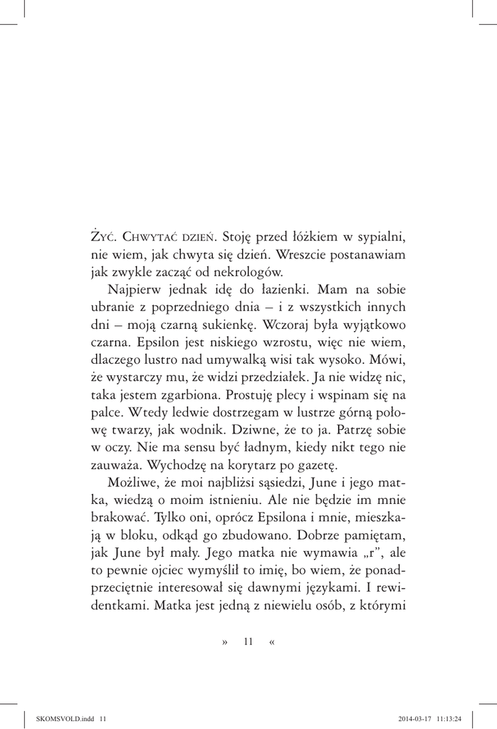 ŻYĆ. CHWYTAĆ DZIEŃ. Stoję przed łóżkiem w sypialni, nie wiem, jak chwyta się dzień. Wreszcie postanawiam jak zwykle zacząć od nekrologów. Najpierw jednak idę do łazienki. Mam na sobie ubranie z poprzedniego dnia – i z wszystkich innych dni – moją czarną sukienkę. Wczoraj była wyjątkowo czarna. Epsilon jest niskiego wzrostu, więc nie wiem, dlaczego lustro nad umywalką wisi tak wysoko. Mówi, że wystarczy mu, że widzi przedziałek. Ja nie widzę nic, taka jestem zgarbiona. Prostuję plecy i wspinam się na palce. Wtedy ledwie dostrzegam w lustrze górną połowę twarzy, jak wodnik. Dziwne, że to ja. Patrzę sobie w oczy. Nie ma sensu być ładnym, kiedy nikt tego nie zauważa. Wychodzę na korytarz po gazetę. Możliwe, że moi najbliżsi sąsiedzi, June i jego matka, wiedzą o moim istnieniu. Ale nie będzie im mnie brakować. Tylko oni, oprócz Epsilona i mnie, mieszkają w bloku, odkąd go zbudowano. Dobrze pamiętam, jak June był mały. Jego matka nie wymawia „r”, ale to pewnie ojciec wymyślił to imię, bo wiem, że ponadprzeciętnie interesował się dawnymi językami. I rewidentkami. Matka jest jedną z niewielu osób, z którymi » SKOMSVOLD.indd 11 11 « 2014-03-17 11:13:24 się witałam w czasach tuż po przeprowadzce, kiedy nie znałam się jeszcze na rzeczy. „Dzień dobry” – mówiłam po kilka razy dziennie. Prędko stało się to problemem. Rano szło nieźle, ale potem znów się spotykałyśmy, kiedy ona wracała z piwnicy, a ja z garażu na rowery. „Dzień dobry” – powtarzałam. Nieco później mogłyśmy natrafić na siebie pod pralnią, a często i parę godzin po tym. „Dobry wieczór” i „Miło znów panią widzieć” – mówiłam z wymuszonym uśmiechem. Jak wychodziłam wyrzucić śmieci, podczas gdy ona załatwiała bliżej nieokreślone sprawy, byłam zmuszona udawać, że słabo widzę po ciemku i jej nie zauważam. Rękoma wymacywałam sobie drogę do zsypu, aby nazajutrz rano znów powiedzieć jej „dzień dobry” i od nowa zacząć te żenujące uniki. Ulżyło mi, kiedy mąż zostawił ją dla rewidentki z piętra niżej, przez co przestała wychodzić z mieszkania. June był nadal nieletni, ale sam musiał wszystko załatwiać, więc może nic w tym dziwnego, że nie wyrósł na sympatycznego mężczyznę. Nigdy się nie wita, kiedy spotyka Epsilona i mnie, a i ja też się z nim nie witam. Odkąd z naszego bloku wyprowadziła się ta przygłucha, pozdrowienia zostawiam Epsilonowi. „Dobry” – mówi Epsilon, a June nie mówi nic, chociaż raz pokazał nam palec. – Dziwne – powiedział Epsilon, nie próbując ironizować. Epsilon nigdy nie ironizuje. – Nigdy nie widziałem takiego powitania. Chyba nauczył się tego w harcerstwie. Bywa, że June albo jego matka równocześnie ze mną wyglądają przez szparę w drzwiach, żeby rano podnieść » SKOMSVOLD.indd 12 12 « 2014-03-17 11:13:24 gazetę z wycieraczki, i za każdym razem jest to tak samo nieprzyjemne. Siadam przy kuchennym stole z moimi kromkami chleba. Za drugim razem otwieram gazetę na właściwej stronie. Kiedy jestem w centrum handlowym Tveita i kupuję drożdżówki z kokosem i budyniem, najpierw wyjadam ten żółty środek. I podczas gdy przegląd wszystkich plajt jest kokosową posypką gazety, nekrologi to żółte nadzienie z waniliowego budyniu. Dziś czuję ulgę, że mojego nazwiska tam nie ma. Aczkolwiek nekrolog byłby miłym dowodem na to, że istniałam. Zastanawia mnie, czy mogłabym zawczasu wysłać im swój własny i poprosić, żeby wydrukowali go w odpowiednim momencie. Wcześniej czytałam nekrologi jedynie po to, by napawać się kosztem tych, których przeżyłam. Teraz jednak myślę, że to bez znaczenia, bo i tak wszyscy żyjemy tylko chwilę. Jesteś taką godziną, która już nie wróci, stosem listów pożółkłych w głębinie szuflady, zapomnianym uśmiechem, który bardzo smuci, i wspomnieniem, na które nie ma żadnej rady. Ciekawe, czy ktoś będzie pamiętał, jaka byłam ładna, bystra i zabawna. Gdybym miała dzieci, mogłyby odziedziczyć moje talenty, jakiekolwiek by były, mogłabym też komuś przekazać swoje życiowe motto: „Droga córko, pamiętaj, żeby zawsze wydymać usta na lekkim wydechu, kiedy robią ci zdjęcie”. Ale przyroda interesuje się tylko zachowywaniem i podtrzymywaniem gatunków, gdzieś ma jednostki. Właściwie to przyroda chce, żeby jednostki żyły jak najkrócej, żeby » SKOMSVOLD.indd 13 13 « 2014-03-17 11:13:24 pokolenia prędko się wymieniały, a ewolucja szybciej szła naprzód, co daje przewagę w walce o istnienie. – Przyroda zachowuje się zatem w sposób sprzeczny z interesem jednostki – powiedział Epsilon. – Czy nie to zawsze mówiłam? – odparłam. Od śmierci Steina Epsilon zaczytywał się jedną książką. – Co ty właściwie czytasz? – spytałam. – Czytam, co Schopenhauer ma do powiedzenia o śmierci – powiedział Epsilon. – Próbuję pogodzić się z nieobecnością Steina. – Ale czy ty nie jesteś religijny? – Nie. – Więc masz nadzieję znaleźć dla Steina inne rozwiązanie? Epsilon skinął głową. – Możliwe. – To mówi coś rozsądnego ten Schopenhauer? – To, że Stein mógł przeżyć jako swego rodzaju wola świata, zdaje się lekko przesadzone – powiedział Epsilon. – Ale w tym, że przeżyje w postaci psiego gatunku, może już tkwić ziarno prawdy. – Więc jeśli wyobrażę sobie psa, który tysiąc lat temu stał w ogrodzie i jadł trawę, jakby to miało rozwiązać wszystkie jego problemy, w pewnym sensie będzie to ten sam pies, który je trawę dzisiaj? – zapytałam. – Marna pociecha. Stein był w końcu jeden. – Schopenhauer mówi, że musisz wykroczyć poza wyobrażenie Steina jako jednostki – rzekł Epsilon. – Musisz utożsamić go z całością, gdyż jako część całości czeka go długie życie w postaci psa. » SKOMSVOLD.indd 14 14 « 2014-03-17 11:13:24 Myślę sobie ter