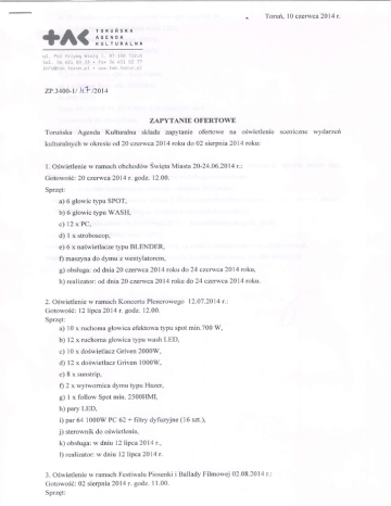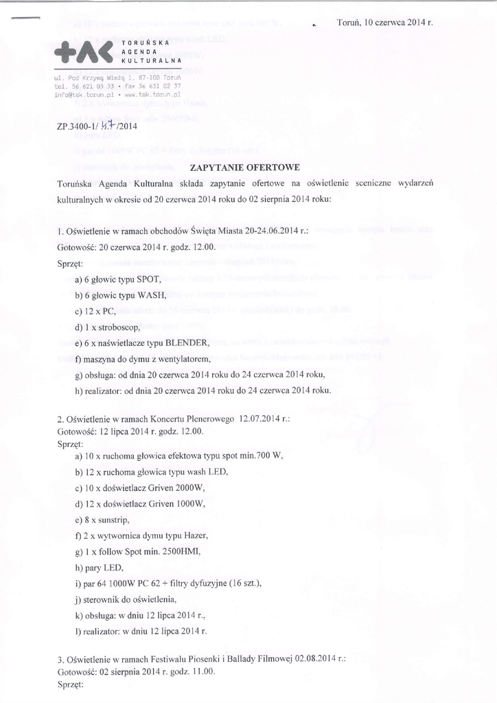 Toruriska Agenda Kulturalna sklada zapttanie ofertowe na o(wietlenie sceniczne v,rydarznft