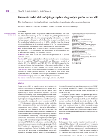 60 PRACE ORYGINALNE / ORIGINALS =QDF]HQLHEDGDñHOHNWURğ]MRORJLF]Q\FKZGLDJQRVW\FHJX]öZQHUZX9,,, 7KHVLJQLğFDQFHRIHOHFWURSK\VLRORJLFH[DPLQDWLRQVLQYHVWLEXODUVFKZDQQRPDVGLDJQRVLV .DWDU]\QD3LHUFKDïD.U]\V]WRI0RUDZVNL,]DEHODXNDZVND.D]LPLHU]1LHPF]\N 2WRODU\QJRO3RO D SUMMARY 7KHPRVWLPSRUWDQWIRUWKHGLDJQRVLVRIYHVWLEXODUVFKZDQQRPDLV05,WHFKQLFZKLFKDOORZVDVVHVVLQJLWVVL]HDQGVKDSH7KHJROGGLDJQRVWLFVWDQGDUG LQFOXGHVDOVR37$6'DQG$%5Q\VWDJPRJUDSK\ZLWKFDORULFVDQG9(03 1\VWDJPRJUDSK\ZLWKFDORULFVUHĠHFWVWKHVWDWXVRIVXSHULRUYHVWLEXODUQHUYH 7KHVHQVLWLYLW\RIFDORULFVDPRXQWVWRļ9(03VUHĠHFWWKHVWDWXVRI LQWHULRUYHVWLEXODUQHUYHLWVVHQVLWLYLW\LVDERXW7KHJUHDWHVWGLDJQRVWLF VHQVLWLYLW\VKRZV$%5PHWKRGZKLFKLVHVWLPDWHGIRUDERXWļ Aim:DQDO\VLVRI37$$%59(03DQGFDORULFVUHVXOWVLQVPDOOHU*≤PP DQGJUHDWHU*!PPWXPRUVDQGDVVHVVHPHQWRILQĠXHQFHRIWKHVL]H RIWKHWXPRUIRUDXGLWRU\DQGYHVWLEXODUIXQFWLRQ 0DWKHULDO37$$%59(03DQGFDORULFVUHVXOWVSHUIRUPHGLQSDWLHQWV ZLWK&3$WXPRUV 5HVXOWV&3$WXPRUVRULJLQDWHIURPLQIHULRUYHVWLEXODUQHUYHLQPRVWFDVHV WKHUHLVQRVWDWLVWLFDO37$GLIIHUHQFHVLQ*DQG*JURXSVVHQVLWLYLW\RI FDORULFV**DQG$%5**bGHSHQGRQWXPRUVL]HDQGWXPRUVL]HKDVVLJQLğFDQWLQĠXHQFHRQUHVXOWVRIERWKRIWKHVH PHWKRGVVHQVLWLYLW\RI9(03VLVVLPLODULQ*DQG*JURXSVDQG &RQFOXVLRQVWKHUHLVQRVWULFWFRUUHODWLRQEHWZHHQWXPRURULJLQDQGFDORULFVDQG$%5UHVXOWVJUHDWHVWVHQVLWLYLW\LQRXUPDWHULDOVKRZ9(03ZKDW LVSUREDEO\UHVXOWVRIIUHTXHQWWXPRUVRULJLQIURPLQIHULRUYHVWLEXODUQHUYH ŅE\3ROVNLH7RZDU]\VWZR2WRU\QRODU\QJRORJöZ ļ&KLUXUJöZ*ïRZ\L6]\L 2WU]\PDQR/Received: =DDNFHSWRZDQRGRGUXNX$FFHSWHG .OLQLND2WRODU\QJRORJLL:DUV]DZVNLHJR 8QLZHUV\WHWX0HG\F]QHJR .LHURZQLNSURIGUKDEQPHG.1LHPF]\N :NïDGSUDF\DXWRUöZ$XWKRUVFRQWULEXWLRQ :JNROHMQRĂFL .RQIOLNWLQWHUHVX&RQIOLFWVRILQWHUHVW $XWRU]\SUDF\QLH]JïDV]DMÈNRQIOLNWXLQWHUHVöZ $GUHVGRNRUHVSRQGHQFML/ $GGUHVVIRUFRUUHVSRQGHQFH LPLÚLQD]ZLVNR.DWDU]\QD3LHUFKDïD DGUHVSRF]WRZ\ .DWHGUDL.OLQLND2WRODU\QJRORJLL:DUV]DZVNL 8QLZHUV\WHW0HG\F]Q\ XO%DQDFKD$ :DUV]DZD WHOb ID[b +DVïDLQGHNVRZHJX]\QHUZX9,,,$%59(03SUöEDNDORU\F]QD .H\ZRUGVYHVWLEXODUVFKZDQQRPDWXPRUVRULJLQFDORULFV$%59(03 :VWÚS Guzy nerwu VIII to łagodne guzy, wywodzące się z osłonki mielinowej przedsionkowej części nerwu. Nerw przedsionkowy posiada 2 gałęzie; górną i dolną, które wyznaczają 2 piętra unerwienia błędnika [1]. Guzy nerwu VIII rozwijają się w znacznej większości w proksymalnej części przewodu słuchowego wewnętrznego, z górnej lub dolnej gałązki nerwu przedsionkowego, bardzo rzadko rozwijają się z nerwu słuchowego [2–5]. Potwierdzeniu obecności guza służy technika MRI z kontrastem, która pozwala także na wstępne oszacowanie jego wielkości i kształtu. Identyfikacji pochodzenia guza dokonuje się śródoperacyjnie. Do standardu diagnostycznego należy też audiometria tonalna i słowna oraz elektrofizjologiczne metody badania narządu słuchu i równowagi, takie jak nystagmografia (ENG, VNG), audiometria słuchowych odpowiedzi z pnia mózgu (ABR) oraz miogenne przedsionkowe potencjały wywołane (VEMP). Próba kaloryczna odzwierciedla stan czynnościowy nerwu przedsionkowego górnego. Około 61–87% chorych z guzem nerwu VIII przed operacją wykazuje osłabienie funkcji błędnika, a 30–60% jego porażenie [6]. Miogenne przedsionkowe potencjały wywołane oceniają funkcję nerwu przedsionkowego dolnego. Nieprawidłowe wyniki przedoperacyjne VEMP stwierdza się u około 80% chorych [7]. Czułość metody ABR w rozpoznawaniu guzów nerwu VIII ocenia się na 96–99% [8]. Pacjenci z guzami nerwu VIII prezentują zróżnicowane wyniki w poszczególnych badaniach diagnostycznych, także w przebiegu małych guzów. Niektórzy autorzy uważają, że istnieje korelacja między pochodzeniem guza, a wynikami testów przedsionkowych, inni stoją na stanowisku, że takiej korelacji nie ma [9–14,]. Ta rozbieżność poglądów wskazuje, że możliwość przewidywania pochodzenia guza na podstawie wyników testów przedsionkowych winna być traktowana ostrożnie. &HOSUDF\ Celem pracy była analiza wyników audiometrii tonalnej (PTA), słuchowych potencjałów wywołanych z pnia mózgu (ABR), próby kalorycznej wg Fiztgeralda-Hallpike’a (CP) oraz miogennych przedsionkowych potencjałów wywołanych (VEMP) w grupach małych (<1 cm) oraz większych (>1 cm) guzów nerwu VIII. 2 W R O D U \ Q J R O R J L D 3 R O V N D W R P Q U D Z U ] H V L H ñ PRACE ORYGINALNE / ORIGINALS Wykres ramkowy: AVE3: (500+1000+2000)/3 160 Wykres ramkowy: AT2_4000 140 120 120 100 AVE3 AT2_4000 80 40 80 60 40 0 20 -40 1 0 2 SIZE10 1 2 SIZE10 ±1.96*Odch. std. ±1.00*Odch. std. Średnia ±Odch. std. ±Błąd std. Średnia Ryc.1a.¥UHGQLSUöJVï\V]HQLD37$ZbJUXSLH*Lb* Ryc. 1b¥UHGQLSUöJVï\V]HQLDN+]ZbJUXSLH*Lb* Przedstawiono rozkład poszczególnych wyników w obu grupach, a następnie oceniono wpływ guza na funkcję słuchową i przedsionkową w zależności od jego wielkości. Do grupy małych guzów (G1) zaliczano te o najdłuższym wymiarze ≤10 mm (n=14, min.–max.: 5–10 mm, śr. 7,4±2,1mm). Do grupy G2 włączono guzy o najdłuższym wymiarze >11 mm (n=19, min.–max.:11–32 mm, śr. 19,5±6,4 mm). Tylko w trzech przypadkach guz był ≥30 mm. 0DWHULDïLbPHWRG\ Materiał pracy stanowią wyniki badań diagnostycznych 33 (20 K i 13 M) pacjentów o średniej wieku 48 lat (min. 23, max. 76), co odzwierciedla stosunkowo duży odsetek chorych w młodym i średnim wieku. Próg słuchu w audiometrii tonalnej przedstawiano jako średnią z trzech częstotliwości (PTA: 500 Hz, 1000 Hz, 2000 Hz). Oddzielną analizę przeprowadzono dla częstotliwości 4000 Hz. Badanie słuchowych odpowiedzi z pnia mózgu (ABR) prowadzono na systemie IHSys (SmartEP), wg typowej procedury, stosując trzask i bodźce specyficzne częstotliwościowo (1, 2, 4 kHz). Wyniki sklasyfikowano w 3 grupy odpowiedzi: norma, zaburzenie pozaślimakowe, brak odpowiedzi. Badanie miogennych przedsionkowych potencjałów wywołanych (VEMP) prowadzono na systemie IHSys (SmartEP) w pozycji siedzącej pacjenta, wg typowej procedury, stosują