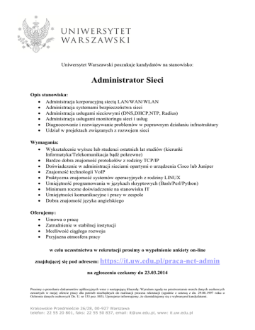 Uniwersytet Warszawski poszukuje kandydatów na stanowisko: Administrator Sieci Opis stanowiska: Administracja korporacyjną siecią LAN/WAN/WLAN Administracja systemami bezpieczeństwa sieci Administracja usługami sieciowymi (DNS,DHCP,NTP, Radius) Administracja usługami monitoringu sieci i usług Diagnozowanie i rozwiązywanie problemów w poprawnym działaniu infrastruktury Udział w projektach związanych z rozwojem sieci Wymagania: Wykształcenie wyższe lub studenci ostatnich lat studiów (kierunki Informatyka/Telekomunikacja bądź pokrewne) Bardzo dobra znajomość protokołów z rodziny TCP/IP Doświadczenie w administracji sieciami opartymi o urządzenia Cisco lub Juniper Znajomość technologii VoIP Praktyczna znajomość systemów operacyjnych z rodziny LINUX Umiejętność programowania w językach skryptowych (Bash/Perl/Python) Minimum roczne doświadczenie na stanowisku IT Umiejętności komunikacyjne i pracy w zespole Dobra znajomość języka angielskiego Oferujemy: Umowa o pracę Zatrudnienie w stabilnej instytucji Możliwość ciągłego rozwoju Przyjazna atmosfera pracy w celu uczestnictwa w rekrutacji prosimy o wypełnienie ankiety on-line znajdującej się pod adresem: https://it.uw.edu.pl/praca-net-admin na zgłoszenia czekamy do 23.03.2014 Prosimy o przesłanie dokumentów aplikacyjnych wraz z następującą klauzulą: Wyrażam zgodę na przetwarzanie moich danych osobowych zawartych w mojej ofercie pracy dla potrzeb niezbędnych do realizacji procesu rekrutacji (zgodnie z ustawą z dn. 29.08.1997 roku o Ochronie danych osobowych Dz. U. nr 133 poz. 883). Uprzejmie informujemy, że skontaktujemy się z wybranymi kandydatami. Krakowskie Przedmieście 26/28, 00-927 Warszawa telefon: 22 55 20 801, faks: 22 55 50 837, email: [email protected], www: it.uw.edu.pl