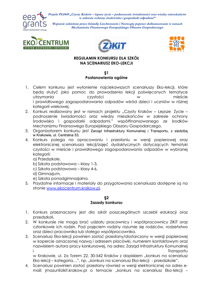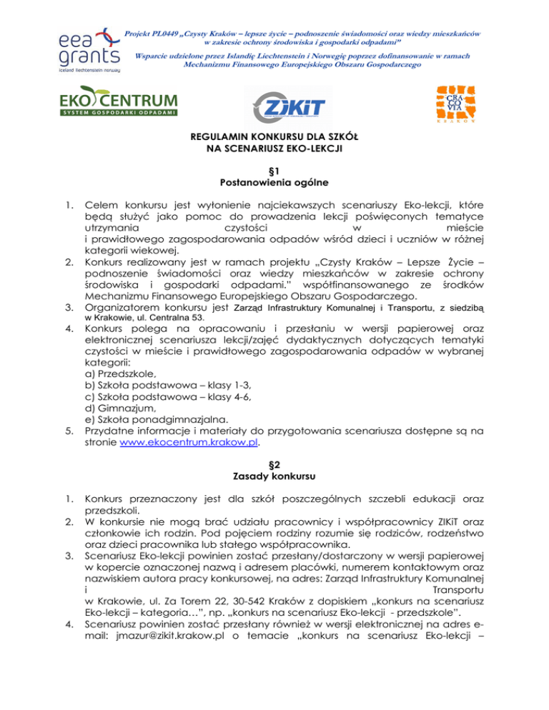 Projekt PL0449 „Czysty Kraków – lepsze Ŝycie – podnoszenie świadomości oraz wiedzy mieszkańców w zakresie ochrony środowiska i gospodarki odpadami” Wsparcie udzielone przez Islandię Liechtenstein i Norwegię poprzez dofinansowanie w ramach Mechanizmu Finansowego Europejskiego Obszaru Gospodarczego REGULAMIN KONKURSU DLA SZKÓŁ NA SCENARIUSZ EKO-LEKCJI §1 Postanowienia ogólne 1. 2. 3. Celem konkursu jest wyłonienie najciekawszych scenariuszy Eko-lekcji, które będą słuŜyć jako pomoc do prowadzenia lekcji poświęconych tematyce utrzymania czystości w mieście i prawidłowego zagospodarowania odpadów wśród dzieci i uczniów w róŜnej kategorii wiekowej. Konkurs realizowany jest w ramach projektu „Czysty Kraków – Lepsze śycie – podnoszenie świadomości oraz wiedzy mieszkańców w zakresie ochrony środowiska i gospodarki odpadami.” współfinansowanego ze środków Mechanizmu Finansowego Europejskiego Obszaru Gospodarczego. Organizatorem konkursu jest Zarząd Infrastruktury Komunalnej i Transportu, z siedzibą w Krakowie, ul. Centralna 53. 4. 5. Konkurs polega na opracowaniu i przesłaniu w wersji papierowej oraz elektronicznej scenariusza lekcji/zajęć dydaktycznych dotyczących tematyki czystości w mieście i prawidłowego zagospodarowania odpadów w wybranej kategorii: a) Przedszkole, b) Szkoła podstawowa – klasy 1-3, c) Szkoła podstawowa – klasy 4-6, d) Gimnazjum, e) Szkoła ponadgimnazjalna. Przydatne informacje i materiały do przygotowania scenariusza dostępne są na stronie www.ekocentrum.krakow.pl. §2 Zasady konkursu 1. 2. 3. 4. Konkurs przeznaczony jest dla szkół poszczególnych szczebli edukacji oraz przedszkoli. W konkursie nie mogą brać udziału pracownicy i współpracownicy ZIKiT oraz członkowie ich rodzin. Pod pojęciem rodziny rozumie się rodziców, rodzeństwo oraz dzieci pracownika lub stałego współpracownika. Scenariusz Eko-lekcji powinien zostać przesłany/dostarczony w wersji papierowej w kopercie oznaczonej nazwą i adresem placówki, numerem kontaktowym oraz nazwiskiem autora pracy konkursowej, na adres: Zarząd Infrastruktury Komunalnej i Transportu w Krakowie, ul. Za Torem 22, 30-542 Kraków z dopiskiem „konkurs na scenariusz Eko-lekcji – kategoria…”, np. „konkurs na scenariusz Eko-lekcji - przedszkole”. Scenariusz powinien zostać przesłany równieŜ w wersji elektronicznej na adres email: [email protected] o temacie „konkurs na scenariusz Eko-lekcji – Projekt PL0449 „Czysty Kraków – lepsze Ŝycie – podnoszenie świadomości oraz wiedzy mieszkańców w zakresie ochrony środowiska i gospodarki odpadami” Wsparcie udzielone przez Islandię Liechtenstein i Norwegię poprzez dofinansowanie w ramach Mechanizmu Finansowego Europejskiego Obszaru Gospodarczego 5. 6. 1. 2. 3. 4. 5. 6. 7. kategoria…”, np. „konkurs na scenariusz Eko-lekcji - przedszkole”. W przesłanym e-mailu powinny równieŜ znajdować się informacje o nazwie i adresie placówki, numerze kontaktowym oraz z danymi osobowymi autora pracy konkursowej. Nieprzekraczalny termin nadsyłania scenariuszy do konkursu to 17.12.2010 r. Organizator konkursu zastrzega sobie moŜliwość wykorzystana przesłanych w konkursie prac na stronie www.ekocentrum.krakow.pl podając ich autora. §3 Rozstrzygnięcie konkursu W konkursie zostaną przyznane 3 nagrody w kaŜdej kategorii: a) Przedszkole: 1 miejsce: aparat fotograficzny 2 miejsce: urządzenie wielofunkcyjne 3 miejsce: odtwarzacz DVD b) Szkoła podstawowa – klasy 1-3: 1 miejsce: aparat fotograficzny 2 miejsce: urządzenie wielofunkcyjne 3 miejsce: odtwarzacz DVD c) Szkoła podstawowa – klasy 4-6: 1 miejsce: mikroskop 2 miejsce: urządzenie wielofunkcyjne 3 miejsce: odtwarzacz DVD d) Gimnazjum: 1 miejsce: mikroskop 2 miejsce: urządzenie wielofunkcyjne 3 miejsce: odtwarzacz DVD e) Szkoła ponadgimnazjalna: 1 miejsce: mikroskop 2 miejsce: urządzenie wielofunkcyjne 3 miejsce: odtwarzacz DVD Autorzy prac, reprezentujący nagrodzone szkoły otrzymają upominki indywidualne. Zwycięzców wyłoni jury złoŜone z przedstawicieli ZIKiT w składzie: Teresa Kowalińska, Daria Nurkowska-Steliga, Marta Ekiert, Joanna Mazur, Michał Pyclik. Kryteria oceny prac konkursowych: a) Zgodność informacji zawartych w scenariuszu z fachową wiedzą tematyczną, b) Odpowiedni dobór zagadnień dostosowany do wieku dzieci/uczniów, c) Ciekawe i przystępne przedstawienie tematyki, d) Kreatywne, innowacyjne podejście do tematyki. Wyniki konkursu zostaną ogłoszone w dniu 21.12.2010 r. i zostaną udostępnione na stronie www.ekocentrum.krakow.pl oraz na stronie www.zikit.krakow.pl. Uzasadnienie werdyktu Jury jest jawne i zostanie opublikowane na stronie www.ekocentrum.krakow.pl, prowadzonej przez ZIKiT oraz na stronie www.zikit.krakow.pl. Nagrodzone szkoły proszone są o odbiór nagród do dnia 30.12.2010 r. w pokoju nr 32, w siedzibie ZIKiT przy ul. Za Torem 22. Nagrodę powinna odebrać osoba posiadająca imienne upowaŜnienie od dyrektora szkoły. Projekt PL0449 „Czysty Kraków – lepsze Ŝycie – podnoszenie świadomości oraz wiedzy mieszkańców w zakresie ochrony środowiska i gospodarki odpadami” Wsparcie udzielone przez Islandię Liechtenstein i Norwegię poprzez dofinansowanie w ramach Mechanizmu Finansowego Europejskiego Obszaru Gospodarczego §4 Postanowienia końcowe 1. 2. 3. 4. 5. 6. 7. Udział w konkursie jest równoznaczny ze zgodą na przetwarzanie danych osobowych przez Organizatora Konkursu w zakresie i w celach związanych z Konkursem oraz w celach marketingowych zgodnie z warunkami określonymi w Ustawie o ochronie danych osobowych z dnia 29.08.1997 roku. Uczestnicy Konkursu akceptując warunki Regulaminu przyjmują do wiadomości, iŜ zostali poinformowani o dobrowolności podania danych, prawie do wglądu i poprawiania danych oraz prawie Ŝądania zaprzestania przetwarzania swoich danych. Zgłoszenie scenariusza Eko-lekcji w konkursie jest równoznaczne ze zgod