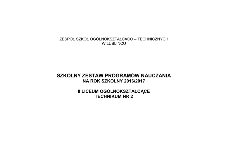 ZESPÓŁ SZKÓŁ OGÓLNOKSZTAŁCĄCO – TECHNICZNYCH W LUBLIŃCU SZKOLNY ZESTAW PROGRAMÓW NAUCZANIA NA ROK SZKOLNY 2016/2017 II LICEUM OGÓLNOKSZTAŁCĄCE TECHNIKUM NR 2 Numer w szkolnym zestawie programów nauczania Tytuł programu Nr dopuszczenia Autor Wydawnictwo P R Z E D M I O T Y O G ÓL N O K S Z T A Ł C Ą C E 1/ZSOT/np - Ponad słowami 2/ZSOT/np - Program nauczania języka angielskiego 2/a/ZSOT/np - 2/c/ZSOT - 3/ZSOT/np./p - 3/ZSOT/np./r - 4/ZSOT/np - 4b/ZSOT/np - 5/ZSOT/np - 6/ZSOT/np - 6a/ZSOT/np - 7/ZSOT/np - Program nauczania języka angielskiego. Kurs kontynuacyjny (IV.1 – zakres podstawowy i zakres rozszerzony) dla szkół ponadgimnazjalny z nową podstawą programową obowiązującą od 2012roku. Program nauczana języka angielskiego zgodny z nową podstawą programową dla IV etapu edukacyjnego Program nauczania języka niemieckiego w liceum ogólnokształcącym, liceum profilowanym i technikum. Kurs podstawowy dla rozpoczynających naukę na poziomie IV.0 lub ją kontynuujących na poziomie IV.I Program nauczania języka niemieckiego dla liceów ogólnokształcących, liceów profilowanych i techników. Zakres rozszerzony Program nauczania historii w klasie I szkoły ponadgimnazjalnej Poznać przeszłość. Program nauczania przedmiotu historia i społeczeństwo dla liceum ogólnokształcącego i technikum. Dziedzictwo epok Odkrywamy na nowo. Wiedza o społeczeństwie. Program nauczania dla szkół ponadgimnazjalnych Zakres podstawowy MATeMAtyka. Program nauczania matematyki dla szkół ponadgimnazjalnych kończących się maturą Matematyka w biznesie. program autorski opracowany dla klasy drugiej i trzeciej Liceum Ogólnokształcącego w Zespole Szkół Ogólnokształcąco - Technicznych w Lublińcu Program nauczania wraz z planem wynikowym Szkoła ponadgimnazjalna, zakres podstawowy przedmiot : fizyka Barbara Łabęcka Anna Sikorzyńska, Maria Kłos, Barbara Czarnecka-Cicha Wydawnictwo NOWA ERA Wydawnictwo Pearson Central Europe Magdalena Kłębowska Expres Publishing Milada Krajewska Macmillan Polska Krystyna Łuniewska, Urszula Tworek, Zofia Wąsik Wydawnictwa Szkolne i Pedagogiczne S.A. Paweł Piszczatowski Marek Jekel Katarzyna Panimasz Antonina Telicka-Bonecka Jarosław Bonecki Wydawnictwa Szkolne i Pedagogiczne S.A. Wydawnictwo NOWA ERA Wydawnictwo NOWA ERA Wydawnictwo Pedagogiczne OPERON Dorota Ponczek Wydawnictwo NOWA ERA Gabriela Patrzyk ------------ Adam Biernacik Małgorzata Klimczyk ZamKor Program nauczania wraz z planem wynikowym Szkoła ponadgimnazjalna, zakres rozszerzony przedmiot : fizyka „To jest chemia”. Program nauczania chemii w zakresie podstawowym dla szkół ponadgimnazjalnych. „Biologia na czasie” - Program nauczania biologii w zakresie podstawowym dla szkół ponadgimnazjalnych. Program nauczania biologii w zakresie rozszerzonym dla szkół ponadgimnazjalnych „Biologia na czasie” Program nauczania geografii w zakresie podstawowym Program nauczania geografii w zakresie rozszerzonym dla liceum ogólnokształcącego i technikum – Oblicza geografii Program nauczania wiedzy o kulturze „Spotkania z kulturą” w liceum i technikum w zakresie podstawowym. Program nauczania. Informatyka dla szkół ponadgimnazjalnych - zakres podstawowy Program nauczania informatyki na poziomie rozszerzonym Program wychowania fizycznego dla IV etapu edukacji Zarys przedsiębiorczości. Program nauczania podstaw przedsiębiorczości w zakresie podstawowym dla technikum, zasadniczych szkół zawodowych i liceuw ogólnokształcących. Program nauczania obowiązkowych zajęć edukacyjnych z zakresu podejmowania i prowadzenia działalności gospodarczej dla technikum, zasadniczych szkół zawodowych i szkół policealnych. 7a/ZSOT/np - 8/ZSOT/np - 9/ZSOT/np - 9a/ZSOT/np - 10/ZSOT/np - 10a/ZSOT/np - 11/ZSOT/np - 12/ZSOT/np - 12a/ZSOT/np - 13/ZSOT/np - 14a/ZSOT/np - 14b/ZSOT/np - 15a/ZSOT/np - Po prostu EDB. Edukacja dla bezpieczeństwa. 16/ZSOT/np - Wychowanie do życia w rodzinie. Program nauczania dla szkół ponadgimnazjalnych 17/ZSOT AZ-4-04/2 17a/ZSOT/np - 18/ZSOT/np - Religia Żyć, aby wierzyć i kochać Ludzkie ścieżki kompleksowy program nauczania etyki na II, III i IV poziomie edukacyjnym Program nauczania języka rosyjskiego do szkół ponadgimnazjalnych. Zakres podstawowy. Kurs dla Maria Fiałkowska, Barbara Sagnowska, Jadwiga Salach Romuald Hassa Aleksandra Mrzigod Janusz Mrzigod ZamKor Wydawnictwo NOWA ERA Marek Kaczmarzyk Wydawnictwo NOWA ERA Urszula Poziomek Wydawnictwo NOWA ERA Ewa Maria Tuz Wydawnictwo NOWA ERA Ewa Maria Tuz Dawid Szczypiński Wydawnictwo NOWA ERA Praca zbiorowa Wydawnictwo NOWA ERA Grażyna Koba Wydawnictwo MIGRA Marta Pulcer --------------------------------- Tomasz Jazienicki --------------------------------- Jacek Musiałkiewicz Wydawnictwo Ekonomik Jacek Musiałkiewicz Wydawnictwo Ekonomik B. Breitkopf Wydawnictwa Szkolne i Pedagogiczne Teresa Król Wydawnictwo Rubikon red. T. Śmiech Jedność, Kielce Anna Ziemska Łukasz Malinowski ORE Haliny Dąbrowska Mirosław Zybert Wydawnictwa Szkolne i Pedagogiczne początkujących. 19/ZSOT/np - Program nauczania języka francuskiego dla szkół ponadgimnazjalnych, kurs podstawowy Maria Szozda Wydawnictwo Lektor Klett 20/ZSOT/np - Program nauczania . Przedmiot uzupełniający Ekonomia w praktyce. Jolanta Kijakowska Operon Numer w szkolnym zestawie programów nauczania Nr w wykazie MEN Tytuł programu KSZTAŁCENIE Autorzy ZAWODOWE Sławomir Kościelny Jolanta Romańska Iwona Mazur - Majchrzyk Bogdan Szczepański Arkadiusz Stelmaszczyk Marta Pulcer Paweł Kolodziej Michał Bogacki 21/ZSOT/np - Program nauczania technik hotelarstwa 422402 22/ZSOT/np - Program nauczania technik informatyk 351203 23/ZSOT/np - Program nauczania technik budownictwa 311204 na podbudowie kwalifikacji B.18 w zawodzie murarz tynkarz Daniel Łodziński Maciej Siwiński 24a/ZSOT/np - Technik architektury krajobrazu Danuta Gajda 25/ZSOT/np - 25a/ZSOT/np - 25b/ZSOT/np - Program nauczania Technik Mecha