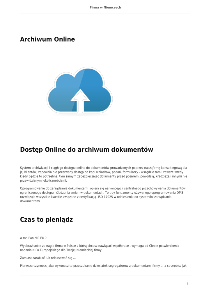 Firma w Niemczech Archiwum Online Dostęp Online do archiwum dokumentów System archiwizacji i ciągłego dostępu online do dokumentów prowadzonych poprzez nasząfirmę konsultingową dla jej klientów, zapewnia nie przerwany dostęp do kopi wniosków, podań, formularzy - wszędzie tam i zawsze wtedy kiedy będzie to potrzebne, tym samym zabezpieczając dokumenty przed pożarem, powodzią, kradzieżą i innymi nie przewidzianymi okolicznościami. Oprogramowanie do zarządzania dokumentami opiera się na koncepcji centralnego przechowywania dokumentów, ograniczonego dostępu i śledzenia zmian w dokumentach. Te trzy fundamenty używanego oprogramowania DMS rozwiązuje wszystkie kwestie związane z certyfikacją ISO 17025 w odniesieniu do systemów zarządzania dokumentami. Czas to pieniądz A ma Pan NIP EU ? Wyobraź sobie ze nagle firma w Polsce z którą chcesz nawiązać współprace , wymaga od Ciebie potwierdzenia nadania NIPu Europejskiego dla Twojej Niemieckiej firmy. Zamiast zarabiać lub relaksować się ... Pierwsza czynnosc jaka wykonasz to przeszukanie dziesiatek segregatorow z dokumentami firmy ... a co zrobisz jak 1 Firma w Niemczech nie znajdziesz tego dokokumentu lub nie masz czasu go szukac ? Gdzie jest ten dokument ? Zmarnowałeś czas i energie na poszukiwanie dokumentu, Twój poziom stresu znacząco się podnosi i nie masz wyjścia : wykonujesz następny krok - telefon lub e-mail do firmy konsultingowej która pomagała Ci założyć firmę w Niemczech. Pytania, stres i pytania Dzwonisz do firmy konsultingowej ale jest już po godzinach jej pracy wiec nie masz wyjścia , czekasz na kolejny dzień i wszystkie plany uzależniasz od uzyskanej w dniu następnym odpowiedzi związanej z poszukiwanym dokumentem . Czy ta firma go ma ? Kiedy go znajdzie ? Jutro jest sobota - może nie będą pracować ? ..a jak osoba związana z archiwizacja dokumentów pojechała na urlop bo rozpoczął się sezon urlopowy i będą dłużej go szukać niż 5 minut ? Uniknij tego co jest do przewidzenia Z naszym systemie elektronicznego obiegu i dystrybucji dokumentów - zawsze masz wszystko pod ręką bez względu na miejsce i czas . Wystarczy zalogować się do naszego systemu archiwum dokumentów który działa przez 24 godziny na dobę , 7 dni w tygodniu , 365 dni w roku - aby znaleźć w przeciągu kilku sekund : poszukiwany dokument , pobrać go lub wydrukować i uniknąć stresu oraz marnowania czasu który mógłbyś poświęcić na zarabianie pieniędzy w Niemczech lub najzwyklejszy relaks ,- właśnie poprzez unikniecie tego co jest do przewidzenia , czyli czynnika ludzkiego. Bezpiecznie, stabilnie, szybko. System dostępu Online do dokumentów jest utrzymywany na naszych serwerach z wysokim uptime, dostęp do niego odbywa się poprzez szyfrowane połączenie SSL a wszystkie dokumenty maja na bieżąco wykonywany kopie bezpieczeństwa. Czy stać Cię na to ? Zapewniamy ze TAK. Każdy z naszych klientów w ramach biuro serwisu lub w ramach realizacji innych powierzonych nam zadań, bez względu czy dotyczy to prowadzenia firmy na terenie Niemiec, odzyskania zwrotu nadpłaconego Podatku za prace w Niemczech, złożenia wniosków o Kindergeld, rozliczenia podatku dochodowego lub jakiejkolwiek innej sprawy prowadzonej przez naszą firmę to usługa dostępu Online do archiwum Twoich dokumentów jest zawsze - DARMOWA ! Potrzebujesz więcej informacji ? Aby zasięgnąć więcej informacji o systemie archiwizacji i udostępniania dokumentów przez nasz Consulting "Firma w Niemczech" - zapraszamy na stronę stworzoną specjalnie w tym celu pod adresem : www.emits-host.com. 2 Firma w Niemczech Można tam znaleźć wszystkie niezbędne informacje o systemie archiwizacji, jak się zalogować oraz jak z niego korzystać. Dodatkowo każdy z naszych klientów w trakcie kompletowania dokumentów np. rejestracji firmy w Niemczech , wniosków Kindergeld czy w ramach biuro serwisu na terenie Niemiec : otrzymuje dane dostępowe do w/w systemu w którym na bieżąco może śledzić spływające dokumenty dotyczące spraw prowadzonych przez "Firma w Niemczech". Informacje są przekazywane na adres e-mail który podał nam klient w formie instrukcji PDF z dołączoną instrukcją obsługi i kilkoma innymi istotnymi kwestiami. Wzór dokumentu który zostanie przesłany, można zobaczyć po kliknięciu TUTAJ. 3