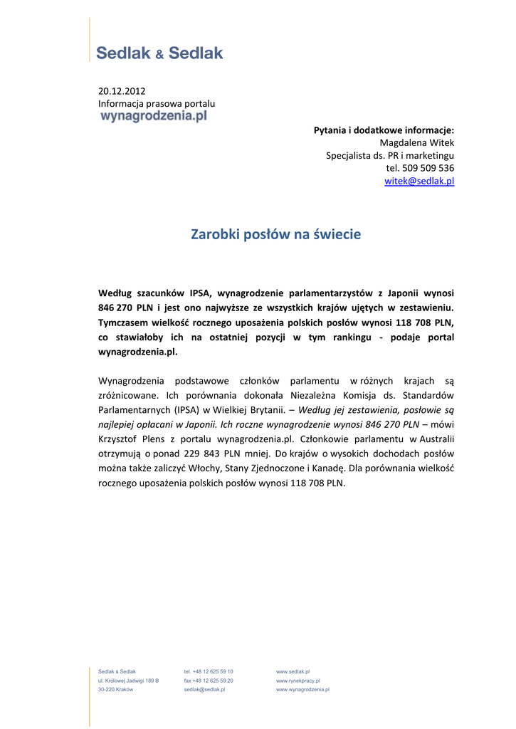 20.12.2012 Informacja prasowa portalu Pytania i dodatkowe informacje: Magdalena Witek Specjalista ds. PR i marketingu tel. 509 509 536 [email protected] Zarobki posłów na świecie Według szacunków IPSA, wynagrodzenie parlamentarzystów z Japonii wynosi 846 270 PLN i jest ono najwyższe ze wszystkich krajów ujętych w zestawieniu. Tymczasem wielkość rocznego uposażenia polskich posłów wynosi 118 708 PLN, co stawiałoby ich na ostatniej pozycji w tym rankingu - podaje portal wynagrodzenia.pl. Wynagrodzenia podstawowe członków parlamentu w różnych krajach są zróżnicowane. Ich porównania dokonała Niezależna Komisja ds. Standardów Parlamentarnych (IPSA) w Wielkiej Brytanii. – Według jej zestawienia, posłowie są najlepiej opłacani w Japonii. Ich roczne wynagrodzenie wynosi 846 270 PLN – mówi Krzysztof Plens z portalu wynagrodzenia.pl. Członkowie parlamentu w Australii otrzymują o ponad 229 843 PLN mniej. Do krajów o wysokich dochodach posłów można także zaliczyć Włochy, Stany Zjednoczone i Kanadę. Dla porównania wielkość rocznego uposażenia polskich posłów wynosi 118 708 PLN. Sedlak & Sedlak tel. +48 12 625 59 10 www.sedlak.pl ul. Królowej Jadwigi 189 B fax +48 12 625 59 20 www.rynekpracy.pl 30-220 Kraków [email protected] www.wynagrodzenia.pl Wykres 1. Porównanie rocznych podstawowych wynagrodzeń członków parlamentu w różnych krajach (w PLN) Opracowanie Sedlak & Sedlak na podstawie: IPSA, http://www.sejm.gov.pl/, dane NBP Warto również przyjrzeć się wartości wynagrodzenia posłów w relacji do średniego rocznego wynagrodzenia w danym kraju. W tym zestawieniu również przodują japońscy parlamentarzyści. Ich wynagrodzenie jest ponad pięciokrotnie wyższe, aniżeli wynosi średnia płaca w tym kraju. Mniej niż wynosi średnia krajowa otrzymują natomiast szwajcarscy parlamentarzyści. Wysokość wynagrodzenia polskich posłów stanowi prawie trzy średnie krajowe. – Warto zaznaczyć, że wynagrodzenia tego rzędu otrzymuje mniej niż 3% wszystkich zatrudnionych Polaków, a mniej więcej dwóch na trzech obywateli naszego kraju otrzymuje płace niższe od średniej krajowej – komentuje Plens. Sedlak & Sedlak tel. +48 12 625 59 10 www.sedlak.pl ul. Królowej Jadwigi 189 B fax +48 12 625 59 20 www.rynekpracy.pl 30-220 Kraków [email protected] www.wynagrodzenia.pl Wykres 2. Krotność średniego wynagrodzenia otrzymywanego przez parlamentarzystów w danym kraju Opracowanie Sedlak & Sedlak na podstawie: IPSA, http://www.sejm.gov.pl/, dane OECD i GUS Czy to całkowite zarobki parlamentarzystów? Uposażenie poselskie wynosi obecnie 9 892 zł 30 gr. brutto. – Na dodatkowe zarobki mogę liczyć przewodniczący i ich zastępcy zasiadający w komisjach, którzy otrzymują 10-20% dodatek zależny od rodzaju komisji i stanowiska. Uposażenie oraz dodatki, o których wyżej mowa są traktowane jako wynagrodzenie ze stosunku pracy. Posłom przysługuje również dieta (czyli środki finansowe na pokrycie kosztów związanych z wydatkami poniesionymi w związku z wykonywaniem mandatu na terenie kraju) w wysokości 25% uposażenia – a wiec 29 677 PLN rocznie. Co więcej, kwota ta jest wolna od podatku dochodowego od osób fizycznych – komentuje ekspert. Sprawdź, ile powinieneś zarabiać! Weź udział w Ogólnopolskim Badaniu Wynagrodzeń i porównaj swoje zarobki z innymi. Wypełnij ankietę! Redakcja portalu wynagrodzenia.pl Wszystko o wynagrodzeniach. Profesjonalna wiedza dla pracodawców i pracowników. Raporty, analizy, opracowania. Niezależne badania wynagrodzeń w Polsce. Sedlak & Sedlak tel. +48 12 625 59 10 www.sedlak.pl ul. Królowej Jadwigi 189 B fax +48 12 625 59 20 www.rynekpracy.pl 30-220 Kraków [email protected] www.wynagrodzenia.pl