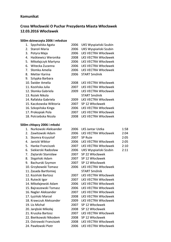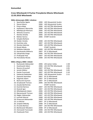 Komunikat Cross Włocławski O Puchar Prezydenta Miasta Włocławek 12.03.2016 Włocławek 500m dziewczęta 2006 i młodsze 1. Spychalska Agata 2. Staroń Maria 3. Potyra Maja 4. Haśkiewicz Weronika 5. Mikołajczyk Martyna 6. Witecka Zuzanna 7. Słomka Amelia 8. Metter Karina 9. Sztypka Barbara 10. Świder Amelia 11. Kozińska Julia 12. Słomka Gabriela 13. Rożek Nikola 14. Rafalska Gabriela 15. Kaczkowska Wiktoria 16. Szkopińska Kinga 17. Prokopiak Pola 18. Potrzebska Nicola 500m chłopcy 2006 i młodsi 1. Nurkowski Aleksander 2. Zawitowski Adam 3. Skomra Krzysztof 4. Janicki Wiktor 5. Hanke Franciszek 6. Siekierski Radosław 7. Ziętarski Stanisław 8. Stępiński Adam 9. Bachurski Szymon 10. Grzybowski Tomasz 11. Zasada Bartłomiej 12. Koziński Bartosz 13. Rutecki Igor 14. Mikołajewski Adam 15. Bajraszewski Tomasz 16. Nagler Aleksander 17. Łyziński Marcel 18. Krawczuk Aleksander 19. Lis Michał 20. Jarębski Mikołaj 21. Kruszka Bartosz 22. Bieńkowski Nikodem 23. Ostrowski Franciszek 24. Pawłowski Piotr 2006 2006 2006 2008 2006 2006 2006 2006 UKS Wyspiański Szubin UKS Wyspiański Szubin LKS VECTRA Włocławek LKS VECTRA Włocławek LKS VECTRA Włocławek LKS VECTRA Włocławek LKS VECTRA Włocławek START Smólnik 2008 LKS VECTRA Włocławek 2007 LKS VECTRA Włocławek 2009 LKS VECTRA Włocławek START Smólnik 2009 LKS VECTRA Włocławek 2007 SP 12 Włocławek 2006 LKS VECTRA Włocławek 2007 LKS VECTRA Włocławek 2008 LKS VECTRA Włocławek 2006 2006 2007 2006 2007 2006 2007 2007 2007 2006 2007 2007 2006 2006 2007 2008 2009 2007 2008 2007 2008 2008 2006 LKS Jantar Ustka LKS VECTRA Włocławek SP Ruże LKS VECTRA Włocławek LKS VECTRA Włocławek UKS Wyspiański Szubin SP 22 Włocławek SP 12 Włocławek SP 12 Włocławek LKS VECTRA Włocławek START Smólnik LKS VECTRA Włocławek LKS VECTRA Włocławek LKS VECTRA Włocławek LKS VECTRA Włocławek LKS VECTRA Włocławek LKS VECTRA Włocławek LKS VECTRA Włocławek SP 12 Włocławek SP 12 Włocławek LKS VECTRA Włocławek SP 12 Włocławek LKS VECTRA Włocławek LKS VECTRA Włocławek 1:58 2:04 2:05 2:05 2:10 2:11 25. Krzeszewski Dominik 26. Bajraszewski Wojciech 27. Bujak Konstanty 28. Główka Wiktor 29. Kruszka Marcel 30. Kruszka Jakub 31. Bielicki Michał 32. Witecki Jan 33. Rakowski Mateusz 34. Maciakiewicz Aleksander 2009 2008 2007 2008 2006 2007 2011 2008 2009 START SMÓLNIK LKS VECTRA Włocławek LKS VECTRA Włocławek LKS VECTRA Włocławek LKS VECTRA Włocławek LKS VECTRA Włocławek LKS VECTRA Włocławek LKS VECTRA Włocławek LKS VECTRA Włocławek LKS VECTRA Włocławek 800m dziewczęta 2005 1. Boniecka Kamila 2. Kowalewska Amelia 3. Rakowska Wiktoria 4. Balawejder Zuzanna 5. Zielińska Nikola 6. Nowakowska Aleksandra 7. Żakowiecka Vanessa 8. Rażewska Gabriela 9. Gawrońska Marta 2005 2005 2005 2005 2005 2005 2005 2005 2005 UKS Wiking Rychnowy LKS VECTRA Włocławek LKS VECTRA Włocławek LKS VECTRA Włocławek SP 12 Włocławek LKS VECTRA Włocławek LKS VECTRA Włocławek LKS VECTRA Włocławek LKS VECTRA Włocławek 3:54 3:55 4:05 4:09 4:13 4:21 800m chłopcy 2005 1. Lewandowski Paweł 2. Rożyński Miłosz 3. Brzezińki Jakub 4. Jeziorny Hubert 5. Mordzak Mateusz 6. Górny Szymon 7. Trzciński Igor 8. Maślankowski Michał 2005 2005 2005 2005 2005 2005 2005 2005 LUKS Start Nakło LKS VECTRA Włocławek LKS VECTRA Włocławek MLKS Nadwiślanin Chełmno LKS VECTRA /SP 12 LKS VECTRA Włocławek SP 12 Włocławek LKS VECTRA Włocławek 3:40 3:53 3:57 4:00 4:04 4:11 800m dziewczęta 2004 1. Wiatrowska Weronika 2. Konieczna Joanna 3. Cyrankowska Julia 4. Elsner Agata 5. Branicka Dominika 6. Gusiora Małgorzata 7. Schewe Liwia 8. Motyka Julia 9. Kopiczyńska Kinga 10. Teszner Vanessa 11. Nitka Karolina 12. Krawczak Zofia 13. Elsner Beata 14. Gościniak Nikola 15. Kucińska Matylda 16. Ryngwelska Zuzanna 17. Miłek Julia 2004 2004 2004 2004 2004 2004 2004 2004 2004 2004 2004 2004 2004 2004 2004 2004 2004 LKS VECTRA Włocławek LKS VECTRA Włocławek LKS VECTRA Włocławek UKS Wiking Rychnowy LKS VECTRA Włocławek LKS VECTRA Włocławek UKB Szubin UKB Szubin LKS VECTRA Włocławek LKS VECTRA Włocławek LUKS Start Nakło UKS Wiking Rychnowy UKS Wiking Rychnowy LKS VECTRA Włocławek LKS VECTRA Włocławek UKS Wiking Rychnowy LKS VECTRA Włocławek 3:53 4:00 4:03 4:04 4:07 4:09 18. Modrzejewska Julia 19. Jaworska Natalia 2004 LKS VECTRA Włocławek 2004 LKS VECTRA Włocławek 800m chłopcy 2004 1. Łabędź Maksymilian 2. Nowogrodzki Jakub 3. Winkowski Michał 4. Wawer Jakub 5. Jeziorny Norbert 6. Skonieczny Mateusz 7. Rafalski Michał 8. Święcikowski Filip 9. Tarazewicz Kacper 10. Czachorowski Szymon 2004 2004 2004 2004 2004 2004 2004 2004 2004 2004 CMKL Człuchów UKS Azymut Pabianice UKB Szubin LUKS Start Nakło MLKS Nadwiślanin Chełmno LKS VECTRA Włocławek LKS VECTRA Włocławek LKS VECTRA Włocławek LKS VECTRA Włocławek LKS VECTRA Włocławek 3:21 3:33 3:35 3:36 3:53 4:01 800m dziewczęta 2003 1. Osiowy Marcelina 2. Sitko Zuzanna 3. Bąkowska Karolina 4. Rybka Paulina 5. Siębar Wiktoria 6. Olach Laura 7. Szymańska Dominika 8. Klinger Weronika 9. Bągol Julia 10. Ulaszewska Maria 2003 2003 2003 2003 2003 2003 2003 2003 2003 2003 CMKL Człuchów KKL Rodło Kwidzyn LKS VECTRA Włocławek LKS VECTRA/SP 12 UKB Szubin LKS VECTRA Włocławek LKS VECTRA Włocławek UKS Wiking Rychnowy UKS WIKING Rychnowy LKS VECTRA Włocławek 3:28 3:38 3:40 3:46 3:51 3:54 800m chłopcy 2003 1. Sprenger Daniel 2. Sobczak Bartłomiej 3. Krzywdziński Dominik 4. Jeka Adam 5. Szcepaniak Przemysław 6. Hanke Szymon 7. Latański Kajetan 8. Chojnicki Hubert 9. Jędrzejewski Marcel 10. Bielicki Piotr 2003 2003 2003 2003 2003 2003 2003 2003 2003 2003 CMKL Człuchów LIUKS Kruszwica UK Szubin LKS VECTRA Włocławek CMKL Człuchów LKS VECTRA Włocławek MLKS Nadwiślanin Chełmno LKS VECTRA Włocławek LKS VECTRA Włocławek LKS VECTRA Włocławek 3:18 3:19 3:21 3:26 3:26 3:35 2000m juniorki młodsze 1. Królik Kinga 2. Mazu