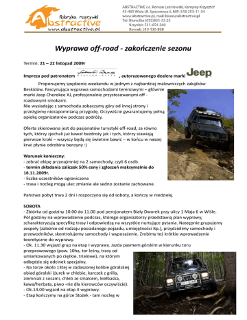 Wyprawa off-road - zakończenie sezonu Termin: 21 – 22 listopad 2009r Impreza pod patronatem , autoryzowanego dealera marki Proponujemy spędzenie weekendu w jednym z najbardziej malowniczych zakątków Beskidów. Fascynująca wyprawa samochodami terenowymi – głównie marki Jeep Cherokee XJ, profesjonalnie przystosowanymi off roadowymi smokami. Nie wysiadając z samochodu zobaczymy góry od innej strony i przeżyjemy niezapomnianą przygodę. Oczywiście gwarantujemy pełną opiekę organizatorów podczas podróży. Oferta skierowana jest do pasjonatów turystyki off-road, za równo tych, którzy zjechali już kawał bezdroży jak i tych, którzy stawiają pierwsze kroki – wszyscy będą się świetnie bawić – w końcu w naszej krwi płynie odrobina benzyny :) Warunek konieczny: - zebrać ekipę przynajmniej na 2 samochody, czyli 6 osób. - termin składania zaliczek 50% ceny i zgłoszeń maksymalnie do 16.11.2009r. - liczba uczestników ograniczona - trasa i nocleg mogą ulec zmianie ale sedno zostanie zachowane. Państwa pobyt trwa 2 dni i rozpoczyna się od soboty, a kończy w niedzielę. SOBOTA - Zbiórka od godziny 10.00 do 11.00 pod pensjonatem Biały Dworek przy ulicy 1 Maja 6 w Wiśle. Pół godziny na wprowadzenie podczas, którego organizatorzy przedstawią plan wyprawy, scharakteryzują specyfikę trasy i odpowiedzą na wszystkie nurtujące pytania. Następnie grupujemy zespoły (zależnie od rodzaju posiadanego pojazdu, umiejętności itp.), przydzielimy samochody i przewodników, skontrolujemy samochody i wyposażenie. Zrobimy też krótkie wprowadzenie teoretyczne do wyprawy. - Ok. 11.30 wyjazd grup na etap I wyprawy. Jazda pasmem górskim w kierunku toru przeprawowego (pow. 10ha, tor leśny, trasy od umiarkowanych po ciężkie, trialowe), na którym odbędzie się odcinek specjalny. - Na torze około 13tej w zadaszonej kolibie góralskiej obiad góralski (żurek w chlebie, karczek z grilla, ziemniak z sosami, chleb ze smalcem, kiełbaska, kawa/herbata, piwo -nie dla kierowców oczywiście). - Ok.14.00 wyjazd na etap II wyprawy. - Etap kończymy na górze Stożek - tam nocleg w schronisku, ognisko, Marek i Maciek z gitarami akustycznymi dadzą koncert country jakiego jeszcze nie słyszeliście (będzie można pośpiewać :) i kupić płytę). NIEDZIELA - Po śniadaniu ok. godz. 11.00 (do ustalenia dnia poprzedniego) -wykwaterowanie, grupowanie uczestników, kontrola pojazdów i wyposażenia. Opcjonalny dymek z papierosa... - o godz. 11.00 wyjazd na trasę etapu III z obiadem po drodze - wjazd do karczmy góralskiej na obiad na szczycie góry ( Menu zamawiacie na własny rachunek z karty). - Po obiedzie ok. 14tej ciąg dalszy off-roadu - kończymy ok. 16 pod Białym Dworkiem. - Żegnamy się ze łzami w oczach i umawiamy na kolejną imprezę :) . WAŻNE !!!!!!!!!!!!!! Do dyspozycji oddajemy profesjonalnie przygotowane wyprawowo Jeepy Cherokee XJ wraz z instruktorami. Oczywiście to Państwo prowadzicie pojazdy i nawigujecie w terenie. Na wyposażeniu każdego samochodu GPS, Roadbook, łączność radiowa, wyciągarki, podnośniki terenowe Hi-lift i pozostały, niezbędny sprzęt. Oferta jest aktualna niezależnie od warunków pogodowych, chyba że zima zaatakuje i wszelkie racjonalne przesłanki do odbycia wyprawy znikną... Cennik: 795pln/os 300pln/os - opcja z własnym samochodem Suma – 2385zł (kalkulacja dla 3 os./ jeden wynajęty samochód - w tym: samochód terenowy z instruktorem, nocleg ze śniadaniem w schronisku, obiad dnia pierwszego, ubezpieczenie NNW ) Marek i Maciek z gitarami - 3 godziny – 550zł – do podziału na wszystkich uczestników (czyli im więcej nas tym taniej wyjdzie granie, a chłopaki naprawdę wymiatają :) - oczywiście jak będzie super to się zrzucimy do kapelusza na ciąg dalszy. Chętnych prosimy o kontakt