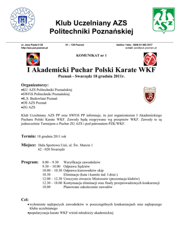 Klub Uczelniany AZS Politechniki Poznańskiej ul. Jana Pawła II 28 http://azs.put.poznan.pl 61 – 139 Poznań telefon / faks : 0048 61 665 2517 e-mail: [email protected] KOMUNIKAT nr 1 I Akademicki Puchar Polski Karate WKF Poznań - Swarzędz 18 grudnia 2011r. Organizatorzy: KU AZS Politechniki Poznańskiej SWFiS Politechniki Poznańskiej K.S. Budowlani Poznań OŚ AZS Poznań ZG AZS Klub Uczelniany AZS PP oraz SWFiS PP informuje, że jest organizatorem I Akademickiego Pucharu Polski Karate WKF. Zawody będą rozgrywane wg przepisów WKF. Zawody te są jednocześnie Turniejem o Puchar ZG AZS i pod patronatem PZK/WKF. Termin: 18 grudnia 2011 rok Miejsce: Hala Sportowa Unii, ul. Św. Marcin 1 62 - 020 Swarzędz Program: 8.00 – 9.30 9.30 – 10.00 10.00 – 10.30 10.30 12.00 – 12.30 12.30 – 18.00 18.00 Cel: Weryfikacja zawodników Odprawa Sędziów Odprawa kierowników ekip Eliminacje (kata i kumite ind. I druż.) Uroczyste otwarcie Mistrzostw (prezentacja klubów) Kontynuacja eliminacji oraz finały przeprowadzonych konkurencji Planowane zakończenie zawodów wyłonienie najlepszych zawodników w poszczególnych konkurencjach oraz najlepszego klubu uczelnianego popularyzacja karate WKF wśród młodzieży akademickiej Klub Uczelniany AZS Politechniki Poznańskiej ul. Jana Pawła II 28 http://azs.put.poznan.pl 61 – 139 Poznań telefon / faks : 0048 61 665 2517 e-mail: [email protected] Sposób przeprowadzenia zawodów: Zawody zostaną rozegrane wg przepisów WKF: dwa trzecie miejsca kata – system chorągiewkowy z repasażami kumite – czas walki trzy minuty dla mężczyzn, 2 minuty dla kobiet Konkurencje: kumite indywidualne mężczyzn: -60, -67, -75, -84, +84kg, Open kumite idywidualne kobiet: -50, -55, -61, -68, +68kg, Open kumite drużynowe mężczyzn kumite drużynowe kobiet kata indywidualne mężczyzn kata indywidualne kobiet kata drużynowe mężczyzn kata drużynowe kobiet Uczestnictwo w turnieju: posiadający stopień 6 kyu startujący w kata (wymagane ksero certyfikatu stopnia do weryfikacji) posiadający stopień 5 kyu startujący w kumite (wymagane ksero certyfikatu stopnia do weryfikacji) wymagana zgoda lekarza ubezpieczenie NNW ważna legitymacja AZS dokument potwierdzający afiliację do określonej szkoły wyższej (indeks, legitymacja studencka, legitymacja pracownicza) wszyscy zawodniczy zobowiązani są do posiadania ochraniaczy na stopy i golenia, napięstników i pasów w kolorach czeronym i niebieskim oraz ochraniaczy na zęby. Organizator nie zabezpiecza w/w sprzętu. Przypominamy, że wg regulaminu WKF kolor karategi może być wyłącznie biały. Klub Uczelniany AZS Politechniki Poznańskiej ul. Jana Pawła II 28 http://azs.put.poznan.pl 61 – 139 Poznań telefon / faks : 0048 61 665 2517 e-mail: [email protected] Informacje dodatkowe: Organizator zastrzega sobie prawo do odwołania konkurencji w przypadku niewystarczjącej liczby zawodników. Za zachowanie zawodnika lub wyrządzone szkody odpowiada opiekun grupy. Organizator nie odpowiada za rzeczy zaginione lub pozostawione w szatni. Ubezpieczenie oraz zgoda lekarza spoczywa na klubie macierzystym. Punktacja: Punkty w klasyfikacji indywidualnej i uczelnianej będą przydzielane wg zasady: I m. N + 1 pkt. II m. N – 1 pkt. III m. N – 2 pkt. Itd. (gdzie N oznacza ilość sklasyfikowanych zawodników). Każda uczelnia może wystawić dowolną ilość studentów i drużyn. Nagrody: Puchary (najlepszy zawodnik, zawodniczka, uczelnia) Statuetki: za 1 miejsce w poszczególnych konkurencjach Medale: miejsca 1-3 Dyplomy i nagrody rzeczowe: dla najlepszych zawodników, zawodniczek, uczelni: książki, pendrive'y, MP3, MP4, itd. Zgłoszenia: e-mail: [email protected] Zgłoszenia należy przesłać w nieprzekraczalnym terminie do 14 grudnia 2011 Istnieje możliwość rezerwacji noclegów. Udział w zawodach jest bezpłatny. Osoby odpowiedzialne za organizacje Mistrzostw: Koordynator Mariusz Siebert tel. 695 444 416 lub 608 331 944 FAX: 61-647-58-74 e-mail: [email protected] Sprawy Organizacyjne i Noclegi Jakub Walkowiak tel. 603 311 803 Klub Uczelniany AZS Politechniki Poznańskiej ul. Jana Pawła II 28 http://azs.put.poznan.pl 61 – 139 Poznań telefon / faks : 0048 61 665 2517 e-mail: [email protected] e-mail: [email protected] Sekretarz Bartosz Wiszniewski tel. 506 984 240 e-mail: [email protected]