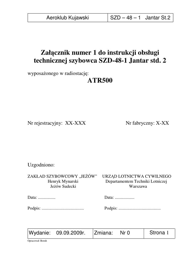 Aeroklub Kujawski SZD – 48 – 1 Jantar St.2 1. Strona tytułowa Załącznik numer 1 do instrukcji obsługi technicznej szybowca SZD-48-1 Jantar std. 2 wyposażonego w radiostację: ATR500 Nr rejestracyjny: XX-XXX Nr fabryczny: X-XX Uzgodniono: ZAKŁAD SZYBOWCOWY „JEŻÓW” Henryk Mynarski Jeżów Sudecki URZĄD LOTNICTWA CYWILNEGO Departamentem Techniki Lotniczej Warszawa Data: ................ Data: .................. Podpis: ....................................... Podpis: ....................................... Wydanie: Opracował: Boruh 09.09.2009r. Zmiana: Nr 0 Strona 1 Aeroklub Kujawski SZD – 48 – 1 Jantar St.2 2. Spis treści: 1. Strona tytułowa...............................................................................1 2. Spis treści:.......................................................................................2 2. Wykaz wprowadzonych zmian......................................................3 3. Dane techniczne:............................................................................4 4. Dane masowe zespołów radiostacji ATR500 ................................4 5. Schemat instalacji radiostacji ATR500 ........................................5 6. Czynności obsługowe radiostacji ATR500 ..................................6 8. Szkic usytuowania instalacji radiostacji ATR500 na szybowcu ...9 9. Wykaz elementów instalacji radiostacji ATR500 ........................9 10. Opis instalacji radiostacji ATR500...........................................10 11. Montaż i demontaż radiostacji ATR500...................................11 UWAGA! Niniejszy ZAŁĄCZNIK dotyczy wyłącznie instalowania radiostacji ATR500 w szybowcu SZD – 48 -1 Jantar St. 2 oraz jej uruchomienia. Wydanie: Opracował: Boruh 09.09.2009r. Zmiana: Nr 0 Strona 2 Aeroklub Kujawski SZD – 48 – 1 Jantar St.2 2. Wykaz wprowadzonych zmian UWAGA! Miejsca, w którym tekst uległ zmianie, jest zaznaczone pionową linią po lewej stronie tekstu oraz numerem zmiany. Lp. Strona Wydanie: Opracował: Boruh Zmiana 09.09.2009r. Zmiana: Data Nr 0 Podp is Strona 3 Aeroklub Kujawski SZD – 48 – 1 Jantar St.2 3. Dane techniczne: Odbiornik umieszczony jest w tablicy przyrządów w standardowym otworze 57mm. Rolę manipulatora spełniają przyciski i pokrętła umieszczone na przedniej ściance przyrządu. Odległość gwarantowanej łączności radiostacji ATR500 wynosi 90-100 km przy wysokości 1000 m. − − − − − zakres częstotliwości......................118,00-136,975 MHz separacja częstotliwości..................25KHz jest możliwe zaprogramowanie......760 kanałów moc nadajnika.................................6 W pobór mocy.....................................2,5 A 4. Dane masowe zespołów radiostacji ATR500 − − − − − − Radiostacja ATR500 Głośnik Rozgałęźnik Mikrofon Przewody Zasilacz bateryjny 0.49kg 0,25kg 0,01kg 0,22kg 0,10kg 2.30kg 3.28kg Razem Z powyższego zestawienia mas radiostacji ATR500 przesunięcie środka masy szybowca pustego z radiostacją mieści się w granicach dodatkowych załadowań szybowca. Wydanie: Opracował: Boruh 09.09.2009r. Zmiana: Nr 0 Strona 4 Aeroklub Kujawski SZD – 48 – 1 Jantar St.2 5. Schemat instalacji radiostacji ATR500 Wydanie: Opracował: Boruh 09.09.2009r. Zmiana: Nr 0 Strona 5 Aeroklub Kujawski SZD – 48 – 1 Jantar St.2 6. Czynności obsługowe radiostacji ATR500 Radiostację ATR500 należy obsługiwać zgodnie z wymaganiami producenta: - Producent nie podaje obowiązku wykonywania czynności obsługowych i nie określa ich zakresu. - Przed sezonem należy jedynie sprawdzić stan połączeń elektrycznych radiostacji i poprawność działania. Wydanie: Opracował: Boruh 09.09.2009r. Zmiana: Nr 0 Strona 6 Aeroklub Kujawski SZD – 48 – 1 Jantar St.2 7. Obsługa radiostacji ATR500 Poszczególne punkty, opisują jak należy posługiwać się radiostacją, w podstawowych funkcjach. Więcej zaawansowanych funkcji zawiera podręcznik użytkownika radiostacji Szczegółowy opis użytkowania radiostacji ATR500 znajduję się w instrukcji instalacji i obsługi dostarczonej wraz z urządzeniem. a) Manipulator (pulpit sterowania): 1. MEM/SET Pokrętło zmiany (wyboru) częstotliwości z pamięci urządzenia (M1...M9) 2. Pokrętło zmiany wartości aktualnych parametrów 3. VOL/SQ wybór parametrów pracy (VOL/SQ/VOX/DIM/CON) 4. STORE Przycisk zapamiętywania częstotliwości 5. ON włącznik / wyłącznik radiostacji 6. Wybór zakresu MHz/kHz 7. Zmiana częstotliwości Active/Stand-by Wydanie: Opracował: Boruh 09.09.2009r. Zmiana: Nr 0 Strona 7 Aeroklub Kujawski SZD – 48 – 1 Jantar St.2 b) Uruchomianie i obsługa radiostacji: 1. Włączanie radiostacji - W celu włączenia radiostacji przycisnąć klawisz ON (5).i przytrzymać około 0,5 sekundy 2. Wyłączanie radiostacji - W celu wyłączenia ponownie nacisnąć ON (5) i przytrzymać około 3 sekundy. 3. Ustawienie głośności – Przycisnąć VOL/SQ, (3) aż do uzyskania na wyświetlaczu napisu VOL:”wartość”. ustawić odpowiednią głośność pokręcając pokrętłem zmiany wartości (2). W zakresie od 01 do 16. 4. Redukcja szumów - przycisnąć VOL/SQ, (3) aż do uzyskania na wyświetlaczu napisu SQ:”wartość”. ustawić odpowiednią wartość pokręcając zmiany wartości (2). W zakresie od 01 do 10. UWAGA!!! Wartość SQ powyżej 03 może powodować tłumienie słabych sygnałów 5. Ręczne ustawianie częstotliwości – ustawić pokrętło MEM (1) w pozycji SET. Przekręcając pokrętło zmiany wartości (2). ustawić żądaną częstotliwość. W celu aktywacji ustawionej częstotliwości należy nacisnąć klawisz (7) z prawej strony pulpitu. Wybrana częstotliwość jest przeniesiona na górny panel i gotowa do użycia. 6. Ustawianie częstotliwości z pamięci radiostacji – Ustawić pokrętło MEM (1) w wybranej pozycji od M1 do M9 Zapisana częstotliwość jest od razu aktywna i gotowa do użycia 7. Zaprogramowanie nowej częstotliwości – Wybi