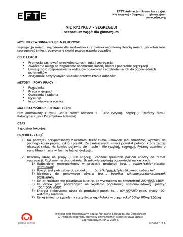 EFTE Animacje - Scenariusz zajęć Nie ryzykuj - Segreguj ::: gimnazjum www.efte.org NIE RYZYKUJ - SEGREGUJ! scenariusz zajęć dla gimnazjum MYŚL PRZEWODNIA/POJĘCIA KLUCZOWE segregacja śmieci, zagrożenie dla środowiska i człowieka nadmierną ilością śmieci, jak właściwie segregować śmieci, pozytywne skutki przetwarzania odpadów CELE LEKCJI • • • • Promocja zachowań proekologicznych- tutaj segregacja Zwrócenie uwagi na zagrożenie nadmierną ilością śmieci i potrzebie segregacji Umiejętność rozpoznawania rodzajów opakowań i rozdzielania ich do odpowiednich pojemników Znajomość pozytywnych skutków przetwarzania odpadów METODY I FOMY PRACY • • • • • Pogadanka Praca w grupach Ćwiczenia i zadania Dyskusja Improwizowana scenka MATERIAŁY/ŚRODKI DYDAKTYCZNE film animowany z cyklu „eFTe radzi” odcinek 1 - „Nie ryzykuj- segreguj” (twórcy filmu: Katarzyna Kijek i Przemysław Adamski) CZAS 1 godzina lekcyjna PRZEBIEG ZAJĘĆ 1. Na początek przypominamy z uczniami treść filmu. Człowiek jadł śniadanie, wyrzucił do jednego kosza papier, szkło i plastik. Ze zmieszanych śmieci powstał potwór, który zaczął niszczyć świat. Na koniec pojawiło się hasło - Nie ryzykuj, segreguj. Pytamy uczniów o sens filmu i hasła w formie luźnej dyskusji. 2. Dzielimy klasę na grupy (3 lub więcej). Zadanie sprawdza poziom wiedzy na temat segregacji. Czytamy na głos pytania. Uczniowie zapisują odpowiedzi na kartkach. 1) Najbardziej energochłonny w procesie produkcji jest... papier/szkło/plastik/ aluminium? 2) Boksyt jest potrzebny do produkcji... butelki/puszki/plastikowego kubeczka? 3) Idealna/y do ponownego użycia jest... butelka szklana/puszka/kubeczek plastikowy. 4) Ile lat rozkłada się plastikowa butelka po wyrzuceniu na śmietnisko? 200/500/1500? 5) Ile drzew jest potrzebnych na wydanie popularnej wielonakładowej gazety? 100/1000/4000? 6) Energia elektryczna użyta do produkcji puszki to... 10/100/250 godz. pracy 100watowej żarówki. 7) Ile kg śmieci przypada na statystycznego Polaka w ciągu roku? 50kg/100kg/250 kg Projekt jest finansowany przez Fundację Edukacja dla Demokracji w ramach programu pomocy zagranicznej Ministerstwa Spraw Zagranicznych RP w 2008 r. strona 1 z 6 EFTE Animacje - Scenariusz zajęć Nie ryzykuj - Segreguj ::: gimnazjum www.efte.org 3. Teraz w grupach ustalamy zasady segregowania – które śmieci wyrzucamy osobno oraz do jakich pojemników? co trzeba zrobić ze śmieciami przed wyrzuceniem? Poprawnie: żółty na plastik, metal i aluminum, niebieski na papier, zielony na szkło kolorowe, a biały na szkło bezbarwne. Niektóre opakowania myjemy i zgniatamy (szczegółowe informacje zawiera karta dla nauczyciela). 4. Kontynuacja pracy w grupach.Co się dzieje z posegregowanymi opakowaniami? Uczniowie powinni ustalić, że wszystkie odpady segregowane trafiają na linię sortowniczą, gdzie są mechanicznie lub poprzez ludzi jeszcze raz sortowane Co się dzieje dalej? Co się wytwarza z tych śmieci? Ze szkła można wytwarzać takie same opakowania – czyli np. z butelki butelkę, z papieru wytwarza się tektury, papierowe ręczniki, papier pakowy, papier toaletowy, a nawet papier biurowy, z plastiku powstają folie, opakowania, tacki na produkty, itp. 5. Następnie każda grupa ma uzupełnić zdanie (poprzez wypisanie argumentów) Dzięki segregacji… Uczniowie powinni podawać argumenty o zmniejszeniu ilości odpadów, wysypisk, itd. oraz o możliwości wytwarzania przedmiotów z surowców wtórnych – jeśli grupy nie dojdą do tego same - nauczyciel może uzupełnić, że tak wytwarzane przedmioty są tańsze w produkcji i oszczędzają środowisko – produkcja papieru z makulatury oszczędza drzewa i zmniejsza zanieczyszczenie wody i powietrza (w stosunku do produkcji normalnego papieru), szkło z odzysku zapobiega olbrzymim „dziurom” w krajobrazie, z których wydobywa się piasek metodą odkrywkową, a np. produkcja aluminium z odzysku oszczędza zasoby minerałów, które mogą się skończyć, ponieważ się nie odnawiają (głównie boksyt) oraz zmniejsza o ok. 90% zużycie energii w stosunku do produkcji „nowego” aluminium. 6. I ostatnie zadanie - ma polegać na przekonaniu odpowiednich osób do segregowania śmieci. Uczniowie losują karteczki z zadaniem na scenkę dla poszczególnej grupy lub wyznacza nauczyciel. Scenka może być improwizowana lub możemy dać uczniom czas na jej przygotowanie. Zależy to od możliwości czasowych. Ważne żeby uczniowie w scenkach użyli tych argumentów, które pokazują zagrożenie „śmieciowym potworem” i dla ludzi i zwierząt i społeczności lokalnej. Odpowiednio grupa I – ma przekonać rodziców; II – dyrektora szkoły, uczniowie występują w roli samorządu, III – samorząd szkoły. Uczniowie mają spośród siebie wybrać aktorów, którzy odegrają obydwie strony sporu. Grupy po kolei prezentują improwizowane scenki. Na koniec nauczyciel wspólnie z uczniami omawia scenki i pyta, czy łatwo przekonać innych do segregacji. 7. Praca domowa – uczniowie dostają zadanie zdobycia informacji na temat segregacji śmieci od firmy wywożącej odpady w ich domu. Nauczyciel zadaje uczniom pytania, na które powinni znaleźć odpowiedzi na stronie internetowej firmy, u osób odbierających odpady lub telefonicznie. 1. Jaką segregację śmieci zaleca dana firma? Jakie śmieci wrzucać do odpowiednich pojemników? (szczegółowa rozpiska na konkretne rodzaje opakowań) 2. Co się dzieje z posegregowanymi odpadami? Czy firma posiada własną sortownię, czy korzysta z usług innej firmy? Czy śmieci posegregowane są mieszane w samochodach, czy wrzucane są do odpowiednich przegród? 3. Jaki procent odpadów udaje się firmie wysegregować? (czyli ile odpadów trafia rzeczywiści do przetwarzania w stosunku do ogólnej ilości segregowanych odpadów ) Projekt jest finansowany przez Fundację Edukacja dla Demokracji w ramach programu 