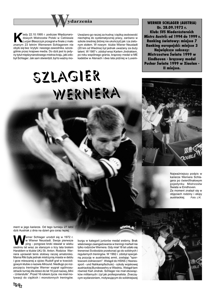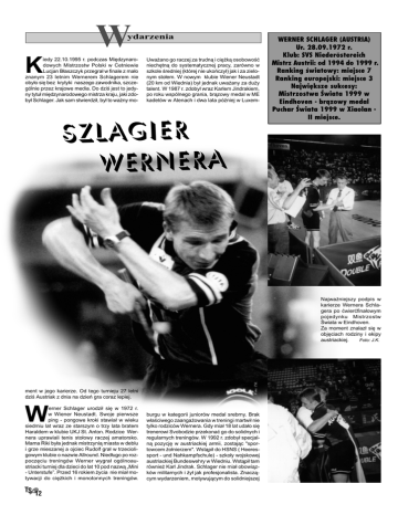 W ydarzenia K iedy 22.10.1995 r. podczas Miêdzynarodowych Mistrzostw Polski w Cetniewie Lucjan B³aszczyk przegra³ w finale z ma³o znanym 23 letnim Wernerem Schlagerem nie oby³o siê bez krytyki naszego zawodnika, szczególnie przez krajowe media. Do dzi jest to jedyny tytu³ miêdzynarodowego mistrza kraju, jaki zdoby³ Schlager. Jak sam stwierdzi³, by³ to wa¿ny mo- Uwa¿ano go raczej za trudn¹ i ciê¿k¹ osobowoæ niechêtn¹ do systematycznej pracy, zarówno w szkole redniej (której nie ukoñczy³) jak i za zielonym sto³em. W nowym klubie Wiener Neustadt (20 km od Wiednia) by³ jednak uwa¿any za du¿y talent. W 1987 r. zdoby³ wraz Karlem Jindrakiem, po roku wspólnego grania, br¹zowy medal w ME kadetów w Atenach i dwa lata póniej w Luxem- SZLAGIER WERNERA WERNER SCHLAGER (AUSTRIA) Ur. 28.09.1972 r. Klub: SVS Niederöstereich Mistrz Austrii: od 1994 do 1999 r. Ranking wiatowy: miejsce 7 Ranking europejski: miejsce 3 Najwiêksze sukcesy: Mistrzostwa wiata 1999 w Eindhoven - br¹zowy medal Puchar wiata 1999 w Xiaolan II miejsce. ment w jego karierze. Od tego turnieju 27 letni dzi Austriak z dnia na dzieñ gra coraz lepiej. W erner Schlager urodzi³ siê w 1972 r. w Wiener Neustadt. Swoje pierwsze ping - pongowe kroki stawia³ w wieku siedmiu lat wraz ze starszym o trzy lata bratem Haraldem w klubie UKJ St. Anton. Rodzice Wernera uprawiali tenis sto³owy raczej amatorsko. Mama Riki by³a jednak mistrzyni¹ miasta w deblu i grze mieszanej a ojciec Rudolf gra³ w trzecioligowym klubie o nazwie Allround. Nied³ugo po rozpoczêciu treningów Werner wygra³ ogólnoaustriacki turniej dla dzieci do lat 10 pod nazw¹ Mini - Unterstufe. Przed 16 rokiem ¿ycia nie mia³ motywacji do ciê¿kich i monotonnych treningów. TS 12 Foto: T.K. Najwa¿niejszy podpis w karierze Wernera Schlagera po æwieræfina³owym pojedynku Mistrzostw wiata w Eindhoven. Za moment znalaz³ siê w objêciach rodziny i ekipy Foto: J.K. austriackiej. burgu w kategorii juniorów medal srebrny. Brak w³aciwego zaanga¿owania w treningi martwi³ nie tylko rodziców Wernera. Gdy mia³ 18 lat uda³o siê trenerowi Svobodzie przekonaæ go do solidnych i regularnych treningów. W 1992 r. zdoby³ specjaln¹ pozycjê w austriackiej armii, zostaj¹c "sportowcem ¿o³nierzem". Wst¹pi³ do HSNS ( Heeressport - und Nahkampfschule) - szko³y wojskowej austriackiej Bundeswehry w Wiedniu. Wst¹pi³ tam równie¿ Karl Jindrak. Schlager nie mia³ obowi¹zków militarnych i ¿y³ jak profesjonalista. Znacz¹cym wydarzeniem, motywuj¹cym do solidniejszej Trener- koordynator austriackiego Zwi¹zku Fritz Svoboda (foto ni¿ej) by³ od pocz¹tku jednym z tych, którzy wierzyli w talent Wernera. Potrafi³ w trudnych chwilach umotywowaæ go do pracy. Ostatnie sukcesy Schlagera zwi¹zane s¹ osob¹ wêgierskiego trenera Ferenca Karsai. Do Mistrzostw wiata w Eindhoven najwiêksze sukcesy Werner Schlager osi¹ga³ w deblu wraz z Karlem Jindrakiem. S¹ jednym z najsilniejszych debli wiata. Foto: T.S. Trudno mi bêdzie powtórzyæ twoje sukcesy, ale przez najbli¿sze kilka lat bêdê do tego d¹¿y³ wydaje siê mówiæ Werner Schlager do Jana - Ove Waldnera na podium ostatnich Mistrzostw wiata. Foto: T.K. Serwis jest jednym z pewniejszych elementów w grze Wernera Schlagera. pracy by³o zwyciêstwo w 1993 r. w meczu Superligi nad aktualnym wtedy mistrzem wiata Jean - Phillippem Gatienem. Zwyciêstwo nad mistrzem wiata w wieku 20 lat utwierdzi³o mnie w przekonaniu, ¿e wszystko jest przede mn¹ otwarte stwierdzi³ w jednym z wywiadów. W 1994 roku zosta³ najlepszym singlist¹ Euroligi. Tu¿ przed Olimpiad¹ w Seulu Austriacki Zwi¹zek pod wodz¹ prezesa Weinmanna zacz¹³ stawiaæ na starszych zawodników chiñskiego pochodzenia: Ding Yi i Qian Qianli. Zaczê³o dochodziæ do napiêæ miêdzy nimi a Austriakami m³odszego pokolenia. Dla Chiñczyków bylimy wtedy za s³abi. Ding Yi stwierdzi³ nawet, ¿e mogê jedynie nosiæ mu torbê- wspomina Schlager. Sytuacja zmieni³a siê od mistrzostw Austrii w 1995 r. gdy Werner Schlager w pó³finale pokona³ Qian Qianli a w finale Ding Yi. Na Olimpiadzie w Atlancie nie odniós³ sukcesów. Zakoñczy³ swój udzia³ w kwalifikacjach grupowych. Nie za³ama³ siê i po olimpiadzie zdobywa dwa tytu³y Miêdzynarodowego Mistrza Australii: w singlu i deblu. Pomimo wielu zwyciêstw w deblu wci¹¿ marzy³ o sukcesach indywidualnych. W wiatowym rankingu po jawi³ siê w maju 1991 r. Nie stara³ siê wystêpowaæ w Bundeslidze, co pozwoli³o mu graæ w wiêkszej iloci miêdzynarodowych turniejów i zdobywaæ punkty do rankingu wiatowego. Pocz¹tkowo skupia³ siê na rozgrywkach w Europie rodkowej w Austrii, Czechach, S³owacji, Wêgrach. Wynika³o to m.in. z polityki Zwi¹zku, bazuj¹cej na wspó³pracy w regionie. Najwiêkszy awans Schlagera w wiatowym rankingu nast¹pi³ po starcie w cyklu imprez ITTF Pro Tour, w których aktywnie uczestniczy³. W 1998 r. startowa³ a¿ w 10 turniejach. W imprezach tych dociera³ jedynie do æwieræfina³ów (Malezja, Chiny, Jugos³awia). Najdalej, bo a¿ do pó³fina³u, zaszed³ w English Open w 1999 r. Pomimo ¿e Werner Schlager nie mia³ do ostatnich mistrzostw wiata wielkich sukcesów to mo¿e pochwaliæ siê zwyciêstwami z wieloma zawodnikami z czo³ówki wiatowego rankingu, m.in. Chiñczykami: Ding Songiem, Kong Linghuiem, Ma Linem, Yan Senem, a tak¿e Peterem Franzem, Jeanem Philiphem Gatienem, John- nym Huangiem, Jörgiem Rosskopfem, Jeanem Michelem Saivem, Patrickiem Chil¹. Podczas ostatnich Mistrzostw wiata w Eindhoven zaskoczy³ ca³y wiat tenisa sto³owego, awansuj¹c do pierwszej czwórki turnieju bêd¹c rozstawionym z numerem 15. Przedstawiciele Austriackiego Zwi¹zku g³ono mówili w Holandii, ¿e ich zawodnicy maj¹ wystarczaj¹cy potencja³ by zdobyæ medal. Myleli g³ównie o deblu Karl Jindrak i Werner Schlager. Mo¿na by³o to zobaczyæ w æwieræfina³owym pojedynku tej pary z rozstawionymi z nr 1 Chiñczykami Liu Guoliang/Kong Linghui. Austria