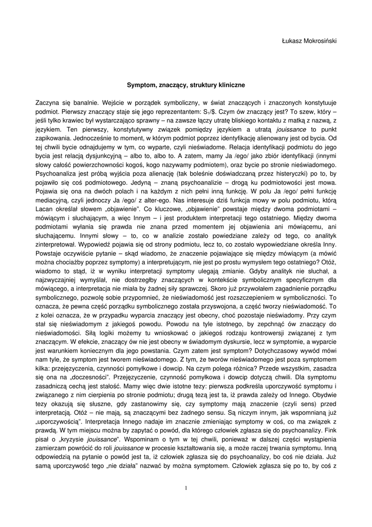 Łukasz Mokrosiński Symptom, znaczący, struktury kliniczne Zaczyna się banalnie. Wejście w porządek symboliczny, w świat znaczących i znaczonych konstytuuje podmiot. Pierwszy znaczący staje się jego reprezentantem: S1/$. Czym ów znaczący jest? To szew, który – jeśli tylko krawiec był wystarczająco sprawny – na zawsze łączy utratę bliskiego kontaktu z matką z nazwą, z językiem. Ten pierwszy, konstytutywny związek pomiędzy językiem a utratą jouissance to punkt zapikowania. Jednocześnie to moment, w którym podmiot poprzez identyfikację alienowany jest od bycia. Od tej chwili bycie odnajdujemy w tym, co wyparte, czyli nieświadome. Relacja identyfikacji podmiotu do jego bycia jest relacją dysjunkcyjną – albo to, albo to. A zatem, mamy Ja /ego/ jako zbiór identyfikacji (innymi słowy całość powierzchowności kogoś, kogo nazywamy podmiotem), oraz bycie po stronie nieświadomego. Psychoanaliza jest próbą wyjścia poza alienację (tak boleśnie doświadczaną przez histeryczki) po to, by pojawiło się coś podmiotowego. Jedyną – znaną psychoanalizie – drogą ku podmiotowości jest mowa. Pojawia się ona na dwóch polach i na każdym z nich pełni inną funkcję. W polu Ja /ego/ pełni funkcję mediacyjną, czyli jednoczy Ja /ego/ z alter-ego. Nas interesuje dziś funkcja mowy w polu podmiotu, którą Lacan określał słowem „objawienie”. Co kluczowe, „objawienie” powstaje między dwoma podmiotami – mówiącym i słuchającym, a więc Innym – i jest produktem interpretacji tego ostatniego. Między dwoma podmiotami wyłania się prawda nie znana przed momentem jej objawienia ani mówiącemu, ani słuchającemu. Innymi słowy – to, co w analizie zostało powiedziane zależy od tego, co analityk zinterpretował. Wypowiedź pojawia się od strony podmiotu, lecz to, co zostało wypowiedziane określa Inny. Powstaje oczywiście pytanie – skąd wiadomo, że znaczenie pojawiające się między mówiącym (a mówić można chociażby poprzez symptomy) a interpretującym, nie jest po prostu wymysłem tego ostatniego? Otóż, wiadomo to stąd, iż w wyniku interpretacji symptomy ulegają zmianie. Gdyby analityk nie słuchał, a najzwyczajniej wymyślał, nie dostrzegłby znaczących w kontekście symbolicznym specyficznym dla mówiącego, a interpretacja nie miała by żadnej siły sprawczej. Skoro już przywołałem zagadnienie porządku symbolicznego, pozwolę sobie przypomnieć, że nieświadomość jest rozszczepieniem w symboliczności. To oznacza, że pewna część porządku symbolicznego została przyswojona, a część tworzy nieświadomość. To z kolei oznacza, że w przypadku wyparcia znaczący jest obecny, choć pozostaje nieświadomy. Przy czym stał się nieświadomym z jakiegoś powodu. Powodu na tyle istotnego, by zepchnąć ów znaczący do nieświadomości. Siłą logiki możemy tu wnioskować o jakiegoś rodzaju kontrowersji związanej z tym znaczącym. W efekcie, znaczący ów nie jest obecny w świadomym dyskursie, lecz w symptomie, a wyparcie jest warunkiem koniecznym dla jego powstania. Czym zatem jest symptom? Dotychczasowy wywód mówi nam tyle, że symptom jest tworem nieświadomego. Z tym, że tworów nieświadomego jest poza symptomem kilka: przejęzyczenia, czynności pomyłkowe i dowcip. Na czym polega różnica? Przede wszystkim, zasadza się ona na „doczesności”. Przejęzyczenie, czynność pomyłkowa i dowcip dotyczą chwili. Dla symptomu zasadniczą cechą jest stałość. Mamy więc dwie istotne tezy: pierwsza podkreśla uporczywość symptomu i związanego z nim cierpienia po stronie podmiotu; drugą tezą jest ta, iż prawda zależy od Innego. Obydwie tezy okazują się słuszne, gdy zastanowimy się, czy symptomy mają znaczenie (czyli sens) przed interpretacją. Otóż – nie mają, są znaczącymi bez żadnego sensu. Są niczym innym, jak wspomnianą już „uporczywością”. Interpretacja Innego nadaje im znacznie zmieniając symptomy w coś, co ma związek z prawdą. W tym miejscu można by zapytać o powód, dla którego człowiek zgłasza się do psychoanalizy. Fink pisał o „kryzysie jouissance”. Wspominam o tym w tej chwili, ponieważ w dalszej części wystąpienia zamierzam powrócić do roli jouissance w procesie kształtowania się, a może raczej trwania symptomu. Inną odpowiedzią na pytanie o powód jest ta, iż człowiek zgłasza się do psychoanalizy, bo coś nie działa. Już samą uporczywość tego „nie działa” nazwać by można symptomem. Człowiek zgłasza się po to, by coś z 1 enigmatyczności symptomu zrozumieć. Jak napisała Soler - zgłasza się po interpretację. Co jednak ważne, jeśli od analityka oczekuje się interpretacji oznacza to, że w ogóle dopuszcza się istnienie drugiego znaczącego, który umożliwi pojawienie się sensu. Tym samym możemy mówić o istnieniu (nieświadomej) wiedzy, którą Lacan zapisywał jako S2/S1. A zatem, pacjent po pierwsze zgłasza się po interpretację, a po drugie – po wspomniane już „objawienie” kim on, jako podmiot jest. Symptomy, jak wszelkie twory nieświadomości, są czymś niekontrolowanym (może śmierć jest sposobem kontroli? - o to należałoby spytać obsesyjnych). A skoro są niekontrolowane, to „kto za tym wszystkim stoi?”. Otóż – podmiot. A to dlatego, że symptomy można odszyfrować. Kiedy się je odszyfruje, wylewa się z nich mowa, a symptomy się zmieniają. Ponieważ mamy tu do czynienia z pojawieniem się mowy oraz w ogóle z odszyfrowywaniem, w konsekwencji musimy wnioskować o obecności znaczącego. A jeśli jest znaczący, jest i podmiot – nie ma bowiem znaczącego bez podmiotu. A zatem: poprzez symptomy wyraża się podmiot – przy czym jest to podmiot bycia, a nie podmiot identyfikacji (że pozwolę sobie w ten sposób określić Ja /ego/). Chwila oddechu. Symptom konwersyjny często razi swoją banalnością. Pacjentka, o której miałem już okazję kilkukrotnie wsp