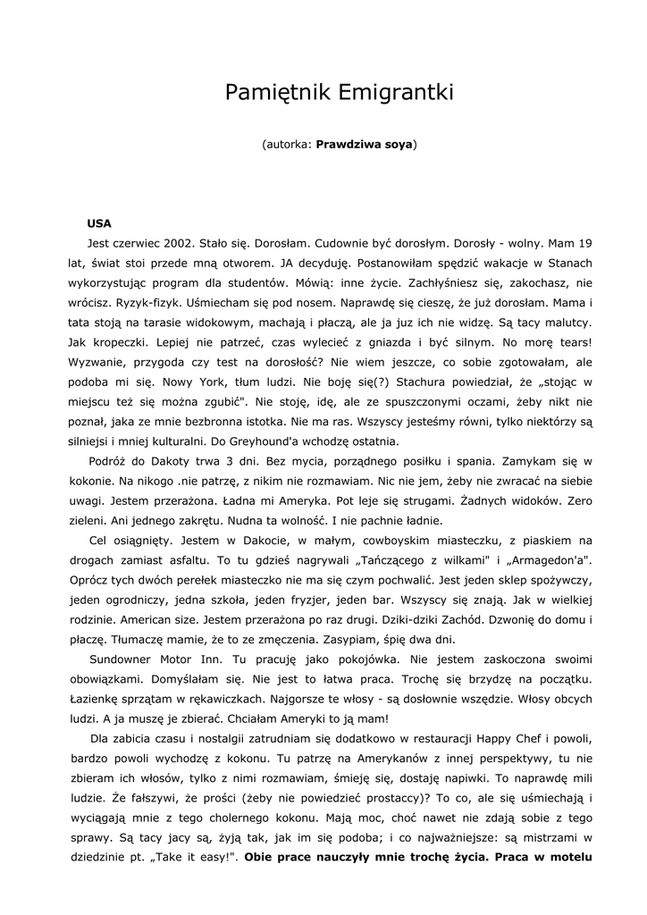 Pamiętnik Emigrantki (autorka: Prawdziwa soya) USA Jest czerwiec 2002. Stało się. Dorosłam. Cudownie być dorosłym. Dorosły - wolny. Mam 19 lat, świat stoi przede mną otworem. JA decyduję. Postanowiłam spędzić wakacje w Stanach wykorzystując program dla studentów. Mówią: inne życie. Zachłyśniesz się, zakochasz, nie wrócisz. Ryzyk-fizyk. Uśmiecham się pod nosem. Naprawdę się cieszę, że już dorosłam. Mama i tata stoją na tarasie widokowym, machają i płaczą, ale ja juz ich nie widzę. Są tacy malutcy. Jak kropeczki. Lepiej nie patrzeć, czas wylecieć z gniazda i być silnym. No morę tears! Wyzwanie, przygoda czy test na dorosłość? Nie wiem jeszcze, co sobie zgotowałam, ale podoba mi się. Nowy York, tłum ludzi. Nie boję się(?) Stachura powiedział, że „stojąc w miejscu też się można zgubić". Nie stoję, idę, ale ze spuszczonymi oczami, żeby nikt nie poznał, jaka ze mnie bezbronna istotka. Nie ma ras. Wszyscy jesteśmy równi, tylko niektórzy są silniejsi i mniej kulturalni. Do Greyhound'a wchodzę ostatnia. Podróż do Dakoty trwa 3 dni. Bez mycia, porządnego posiłku i spania. Zamykam się w kokonie. Na nikogo .nie patrzę, z nikim nie rozmawiam. Nic nie jem, żeby nie zwracać na siebie uwagi. Jestem przerażona. Ładna mi Ameryka. Pot leje się strugami. Żadnych widoków. Zero zieleni. Ani jednego zakrętu. Nudna ta wolność. I nie pachnie ładnie. Cel osiągnięty. Jestem w Dakocie, w małym, cowboyskim miasteczku, z piaskiem na drogach zamiast asfaltu. To tu gdzieś nagrywali „Tańczącego z wilkami" i „Armagedon'a". Oprócz tych dwóch perełek miasteczko nie ma się czym pochwalić. Jest jeden sklep spożywczy, jeden ogrodniczy, jedna szkoła, jeden fryzjer, jeden bar. Wszyscy się znają. Jak w wielkiej rodzinie. American size. Jestem przerażona po raz drugi. Dziki-dziki Zachód. Dzwonię do domu i płaczę. Tłumaczę mamie, że to ze zmęczenia. Zasypiam, śpię dwa dni. Sundowner Motor Inn. Tu pracuję jako pokojówka. Nie jestem zaskoczona swoimi obowiązkami. Domyślałam się. Nie jest to łatwa praca. Trochę się brzydzę na początku. Łazienkę sprzątam w rękawiczkach. Najgorsze te włosy - są dosłownie wszędzie. Włosy obcych ludzi. A ja muszę je zbierać. Chciałam Ameryki to ją mam! Dla zabicia czasu i nostalgii zatrudniam się dodatkowo w restauracji Happy Chef i powoli, bardzo powoli wychodzę z kokonu. Tu patrzę na Amerykanów z innej perspektywy, tu nie zbieram ich włosów, tylko z nimi rozmawiam, śmieję się, dostaję napiwki. To naprawdę mili ludzie. Że fałszywi, że prości (żeby nie powiedzieć prostaccy)? To co, ale się uśmiechają i wyciągają mnie z tego cholernego kokonu. Mają moc, choć nawet nie zdają sobie z tego sprawy. Są tacy jacy są, żyją tak, jak im się podoba; i co najważniejsze: są mistrzami w dziedzinie pt. „Take it easy!". Obie prace nauczyły mnie trochę życia. Praca w motelu pokazała mi, że nie jestem królewną, choć dziadek tak do mnie mówił odkąd pamiętam, i potem gdzieś to w człowieku siedzi. Słowo daję, że nie ma lepszego sposobu na temperowanie „książęcego" charakteru. Druga praca nauczyła mnie uśmiechu. I tego, że mogę innym rozjaśnić dzień. Słowem, miną, gestem, czymkolwiek, jakkolwiek. Sobą. Do kraju wracam z misją: będę otwarta i miła. W końcu wyszłam z kokonu. Uff! Nie zakochałam się, nie zachłysnęłam i wróciłam. Z wielkim bagażem, dosłownie i w przenośni. Z chęcią bycia dobrym, nawet jeśli ta moja dobroć ma graniczyć z naiwnością. Od 2002 wyznaję zasadę: „Dzień bez uśmiechu - dniem straconym!" Mam nadzieję, że mi nie minie. A jak minie, to znowu tam pojadę. ANGLIA Zapomniałam dodać, że Stany obudziły we mnie niespokojną duszę. Stałam się trochę takim Jasiem Wędrowniczkiem, co z całym dobytkiem na plecach przemierza kręte życiowe ścieżki. I nie straszne mu wielkie powalone konary drzew leżące na drodze. Połknęłam bakcyla i już nie mogłam usiedzieć w domu. Ba! Ja w ogóle zaczęłam się dusić we własnej ojczyźnie. Przykre, ale prawdziwe. Jedni chodzą na dyskoteki, inni łowią ryby, ja się pakuję i wyjeżdżam. Trzeba coś w życiu robić. Tym razem lato spędzam w Londynie, a dokładniej w Wimbledonie. Kiedy człowiek nie buduje wokół siebie jakiejś bezsensownej ściany, ale otacza się aurą przyjaźni, dobroci i ciepła, to nie ma siły, która zdołałaby go pokonać. Zawsze znajdzie się ktoś z podobną aurą, chętny do pomocy. Ja właśnie tylko takich ludzi spotykałam w Anglii. Może właśnie dlatego zamiast zostać trzy miesiące, zostałam pól roku i do dziś mam niedosyt. Nie wiem, czym wytłumaczyć mój sentyment do Londynu. Przecież też ciężko pracowałam. W ogóle nie korzystałam z życia, w ten powszechnie uznawany i utrwalany sposób: nie chodziłam do pubów, nie tańczyłam na barze, nie całowałam się z chłopakami, nawet za dużo nie pozwiedzałam...Wyciskałam marchewki. (Wiem, że to głupio-śmiesznie zabrzmiało). Sklepik, w którym pracowałam, o wdzięcznej nazwie „GertinTresh", specjalizował się w serwowaniu świeżych owoców i warzyw pod różną postacią. Produkowaliśmy soki, sałatki i kanapki na niewielką skalę. Miało być zdrowo, świeżo i miło. Cerę miałam jak pupa niemowlaka. Nie wiem czy to te soki, mgła, czy z radości tak wyładniałam. Lubiłam to miejsce. Tych ludzi. Znów utwierdziłam się w przekonaniu, że warto się uśmiechać. Podobno o charakterze ludzi decydują ich poranki. A ja zawsze pracowałam na ranną zmianę i to ja miałam ten zaszczyt, choć w maleńkim stopniu, wpływać na dzień zaspanych Brytyjczyków „obdarowując"ich papierowym kubkiem gorącej kawy i (po raz setny to napiszę) uśmiechem. Bo warto. Uwielbiam sie uśmiechać. Chyba robię to najlepiej. Czego oprócz uśmiechu nauczyła mnie Anglia? Nauczyła mnie wić gniazda. Myślę, że właśnie tam opanow