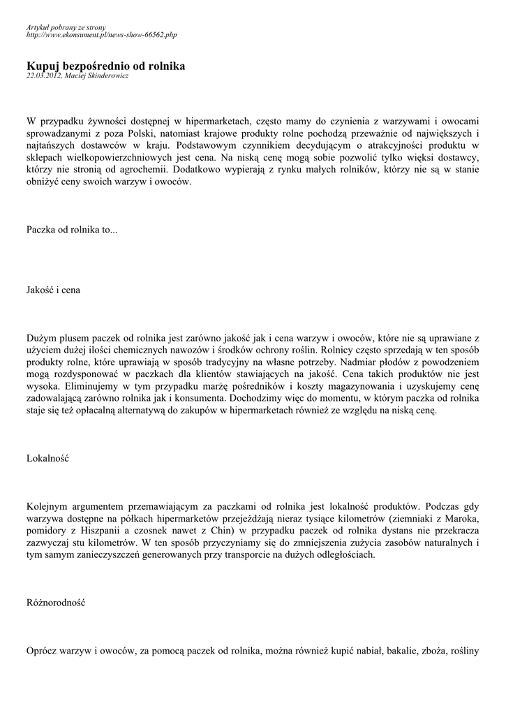 Artykuł pobrany ze strony http://www.ekonsument.pl/news-show-66562.php Kupuj bezpośrednio od rolnika 22.03.2012, Maciej Skinderowicz W przypadku żywności dostępnej w hipermarketach, często mamy do czynienia z warzywami i owocami sprowadzanymi z poza Polski, natomiast krajowe produkty rolne pochodzą przeważnie od największych i najtańszych dostawców w kraju. Podstawowym czynnikiem decydującym o atrakcyjności produktu w sklepach wielkopowierzchniowych jest cena. Na niską cenę mogą sobie pozwolić tylko więksi dostawcy, którzy nie stronią od agrochemii. Dodatkowo wypierają z rynku małych rolników, którzy nie są w stanie obniżyć ceny swoich warzyw i owoców. Paczka od rolnika to... Jakość i cena Dużym plusem paczek od rolnika jest zarówno jakość jak i cena warzyw i owoców, które nie są uprawiane z użyciem dużej ilości chemicznych nawozów i środków ochrony roślin. Rolnicy często sprzedają w ten sposób produkty rolne, które uprawiają w sposób tradycyjny na własne potrzeby. Nadmiar płodów z powodzeniem mogą rozdysponować w paczkach dla klientów stawiających na jakość. Cena takich produktów nie jest wysoka. Eliminujemy w tym przypadku marżę pośredników i koszty magazynowania i uzyskujemy cenę zadowalającą zarówno rolnika jak i konsumenta. Dochodzimy więc do momentu, w którym paczka od rolnika staje się też opłacalną alternatywą do zakupów w hipermarketach również ze względu na niską cenę. Lokalność Kolejnym argumentem przemawiającym za paczkami od rolnika jest lokalność produktów. Podczas gdy warzywa dostępne na półkach hipermarketów przejeżdżają nieraz tysiące kilometrów (ziemniaki z Maroka, pomidory z Hiszpanii a czosnek nawet z Chin) w przypadku paczek od rolnika dystans nie przekracza zazwyczaj stu kilometrów. W ten sposób przyczyniamy się do zmniejszenia zużycia zasobów naturalnych i tym samym zanieczyszczeń generowanych przy transporcie na dużych odległościach. Różnorodność Oprócz warzyw i owoców, za pomocą paczek od rolnika, można również kupić nabiał, bakalie, zboża, rośliny strączkowe oraz kiszonki. Dla osób bardziej wymagających są w ofercie certyfikowane ekologiczne warzywa i owoce. Sezonowość Spożywanie sezonowych warzyw i owoców pozytywnie wpływa na nasze zdrowie. Świeże, sezonowe warzywa zawierają bardzo dużo łatwo przyswajalnych witamin i mikroelementów. Żyjąc w danym klimacie, nasz organizm jest zestrojony z cyklami przyrody. Oczywiście dzisiejsze czasy umożliwiają nam dostęp do praktycznie każdego warzywa i owocu o każdej porze roku. Niestety są one odpowiednio spreparowane aby przetrwać transport i długi pobyt w magazynie. Dlatego konsumowanie żywności przechowywanej na zimę starymi sposobami takimi jak kiszenie ogórków i kapusty jest lepsze dla naszego organizmu niż spożywanie egzotycznych owoców cytrusowych. Spożywanie sezonowych warzyw i owoców umożliwia naszemu organizmowi skumulowanie i zmagazynowanie substancji niezbędnych dla jego prawidłowego funkcjonowania. Oszczędność czasu i eliminacja odpadów Taka forma zakupów oszczędza również nasz czas. Wystarczy zamówić paczkę przez internet a zostanie ona dostarczona na wskazany adres. Eliminujemy również tym sposobem zbyteczne opakowania, które są nieodzowne w przypadku zakupów w hipermarkecie. Relacje z producentem W dzisiejszych czasach, w którym relacje społeczne są zachwiane z powodu bezosobowych kontaktów w sklepach wielkopowierzchniowych, niemałe znaczenie ma kontakt z producentem. Bezpośrednio od rolnika, który dostarcza nam paczkę możemy się dowiedzieć skąd pochodzą produkty rolne, które nabywamy, w jaki sposób są uprawiane a nawet otrzymać informację na temat krowy, od której jest mleko: "Nabywaną bezpośrednio żywność można identyfikować z konkretnym już nie tylko rolnikiem ale polem na którym wyrosła (warzywa), drzewem z którego została zerwana (owoce), czy zwierzęciem od którego została pozyskana (mleko)".* Gdzie znaleźć i jak to działa? Projekt odrolnika.pl oferuje dostawy indywidualne na terenie: Krakowa, Katowic, Jaworzna i Tarnowa oraz miejscowości położonych w odległości do 30 km od tych miast są realizowane za pomocą transportu własnego. Do pozostałych województw, paczki są wysyłane przez kuriera. W województwach: dolnośląskim, mazowieckim, łódzkim, świętokrzyskim oraz podkarpackim w niedalekiej przyszłości będzie możliwość robienia zakupów prosto z gospodarstwa. Wszystkie produkty z "Zielonego pola" pochodzą z certyfikowanych upraw ekologicznych. Na terenie Krakowa i Zakopanego oraz wzdłuż trasy między tymi miastami istnieje możliwość dostawy do domu. W przypadku innych miejsc trzeba się umówić na dogodny sposób transportu - Aby kupować produkty trzeba się zarejestrować na stronie internetowej, wybrać pozycje, które nas interesują i zatwierdzić, podobnie jak to się odbywa w innych sklepach internetowych. Kooperatywy spożywcze Odrębną formą zakupów produktów roślinnych jest kooperatywa spożywcza. Takie inicjatywy funkcjonują już w Warszawie, Lublinie, Łodzi oraz Gdańsku, i są skierowane do ludzi, którzy chcą budować sprawiedliwą, demokratyczną i ekologiczną gospodarkę oraz chcą jeść zdrową żywność za sprawiedliwą cenę. Tym sposobem tworzą sieć współpracy producentów i konsumentów, w której celem jest zaspokajanie potrzeb, a nie zysk. Starają się, aby kupowane przez nich produkty w coraz większym stopniu pochodziły z upraw ekologicznych, spełniały standardy etyczne, omijały pośredników i zachowywały niską cenę. Kooperatywa to nie tylko tanie i ekologiczne zakupy - ale także przedsięwzięcie społeczno-polityczne. Oprócz zaspokajania potrzeb żywieniowych działa jako instytucja socjalno-oświatowa. Wspólne oszczędności - 10% od sumy zakupów każdej z osób - trafiają do funduszu gromadzkiego. Finansowana je