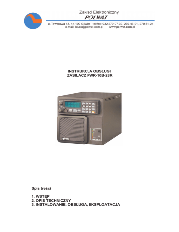 INSTRUKCJA OBSŁUGI ZASILACZ PWR-10B-28R Spis treści 1. WSTĘP 2. OPIS TECHNICZNY 3. INSTALOWANIE, OBSŁUGA, EKSPLOATACJA POLWAT Strona 2 z 8 IO-PWR-10B-28R 1. WSTĘP Niniejsza IO zawiera dane, oraz wskazówki niezbędne do zapoznania się z zasadami funkcjonowania, sposobem instalowania i obsługi zasilacza PWR-10B-28R. 2. OPIS TECHNICZNY 2.1. Przeznaczenie zasilacza. Zasilacz PWR-10B-28RR przeznaczony jest do zasilania odbiorników radiokomunikacyjnych i teleinformatycznych (MOTOROLA, ALCATEL, ICom, RADMOR, SEPURA, KENWOOD, YAESU itp.) o napięciu znamionowym 12V, z sieci jednofazowej 230V 50Hz, przy współpracy buforowej z wewnętrznym akumulatorem 28Ah. Zasilacz wyposażony jest w: układ odłączania baterii (zabezpieczenie przed głębokim rozładowaniem) układ regulacji napięcia ładowania sondą temperaturową układ ograniczenia prądu ładowania do 3A wskaźniki LED pokazujące stan zasilacza oraz stan naładowania akumulatora układ optycznej i akustycznej (z możliwością kasowania) sygnalizacji awarii: przejścia na pracę bateryjną, przekroczenia dopuszczalnych temperatur system montażu dodatkowego wewnętrznego głośnika (opcja) układ generujący sygnały alarmowe (opcja) system wentylacji wnętrza zasilacza sterowany dwoma sondami temperaturowymi 2.2. Dane techniczne. Nominalne parametry napięciowo-prądowe zasilacza PWR-10B28R 10V ÷14.2V 10A 3A - zakres zmian napięcia wyjściowego - prąd obciążenia (max.) - maksymalny prąd ładowania baterii - napięcie odłączenia baterii od systemu (zabezpieczenie przed głębokim rozładowaniem) - napięcie pracy buforowej (20°C) - kompensacja temperaturowa (sonda) 10V 13.6V. -20mV/°C. 2.2.1. Parametry elektryczne zasilacza (bez akumulatora). Napięcie zasilania 187V - 265V AC Pobór prądu < 1.2A Udar prądu przy załączeniu do sieci < 15A POLWAT IO-PWR-10B-28R Zakłócenia radioelektryczne Strona 3 z 8 EN-55022 klasa B Prąd upływu Częstotliwość przetwarzania < 2 mA 45 kHz ÷ 55 kHz Sprawność dla warunków nominalnych > 80% Stabilizacja napięcia wyjściowych od zmian napięcia zasilającego < 0.5% Stabilizacja napięcia wyjściowego od zmian prądu wyjściowego: < 2% Tętnienia napięcia wyjściowego < 10mV (RMS) < 100mV (p-p) Zabezpieczenie nadnapięciowe 14.5V ÷ 15V Zabezpieczenie nadprądowe 10A – 11A 2.2.2. Wytrzymałość elektryczna izolacji - pomiędzy zaciskami sieciowymi a zaciskiem ochronnym 2100 V= - pomiędzy zaciskami sieciowymi a zaciskami wyjściowymi 5300 V= - pomiędzy zaciskami wyjściowymi a zaciskiem ochronnym 500 V= Uwaga : Metodykę sprawdzania wytrzymałości elektrycznej izolacji uzgodnić z producentem. Strona 4 z 8 POLWAT IO-PWR-10B-28R 2.2.3. Parametry mechaniczne. Wymiary gabarytowe Maksymalne wymiary akumulatora Masa / masa z akumulatorem Rys.3 167x176x127 [mm] ok. 5 kg /14.8 kg 2.3. Opis warunków eksploatacji. Temperatura przechowywania Temperatura otoczenia przy obciążeniu nominalnym i konwekcji naturalnej Wilgotność względna Ciśnienie atmosferyczne Stopień agresywności korozyjnej środowiska wg. PN-71/H-04651 Udary w czasie pracy Wibracje i udary w czasie transportu -25°C ÷ +85°C -10°C ÷ 55°C 40% ÷ 95% 84 kPa ÷ 107 kPa B niedopuszczalne wg PN-83/T-42106 2.4. Funkcje przycisków i wskaźników LED. Rys.1. Opis wskaźników sygnalizacyjnych LED na płycie czołowej zasilacza PWR-10B-28R Wyłącznik powoduje załączenie lub wyłączenie całego systemu (z sieci zasilającej i akumulatora). SIEĆ – (zielony) świeci gdy zasilacz jest podłączony do sieci zasilającej POLWAT IO-PWR-10B-28R - Strona 5 z 8 BATERIA – (żółty) - praca z baterii - świeci gdy: zniknie sieć zasilająca moduł zasilający ulegnie uszkodzeniu zadziała zabezpieczenie termiczne – do czasu ostygnięcia. Wskaźniki LED (10V, 11V, 12V,13V) pokazują stopień naładowania akumulatora. AWARIA – (czerwony) – zawsze z sygnałem akustycznym - pojawia się w następujących przypadkach: - przejście na pracę bateryjną (można skasować przyciskiem razem z sygnałem akustycznym) - zadziałanie zabezpieczenia termicznego (można skasować sygnał akustyczny przyciskiem a wskaźnik gaśnie po ostygnięciu) - spadek napięcia na akumulatorze poniżej 10.5V (dodatkowo sygnalizowane miganiem wskaźnika naładowania baterii 10V, można skasować przyciskiem razem z sygnałem akustycznym ) 3.INSTALOWANIE, OBSŁUGA, EKSPLOATACJA. 3.1.Bezpieczeństwo pracy i obsługi. Zasilacz PWR-10B-28R jest urządzeniami I klasy według EN60950. Musi być przyłączony do sieci elektroenergetycznej, w której jako ochronę od porażeń prądem elektrycznym stosuje się uziemienie ochronne. Ponieważ w zasilaczu zastosowano filtr przeciwzakłóceniowy z kondensatorami klasy Y, wykazuje on prąd upływu (nie większy od 2 mA). 3.2.Instalowanie. Zasilacz należy ustawić w sposób umożliwiający swobodny przepływ powietrza poprzez szczeliny wentylacyjne w osłonie. Dopuszcza się trwałe połączenie z zaciskiem ochronnym sieci jednego z zacisków wyjściowych. 3.3 Uruchomienie Po podłączeniu zasilacza do sieci zasilającej zapali się wskaźnik SIEĆ Rys.1.. - Załączenie wyłącznika systemowego powoduje: uruchomienie zasilacza z sieci zasilającej (gdy świeci wskaźnik SIEĆ). uruchomienie zasilacza z akumulatora (przy braku sieci zasilającej) wskazanie aktualnego napięcia na akumulatorze (jeden ze wskaźników 10V-13V). uruchomienie zasilacza z akumulatora (przy braku sieci zasilającej) po jego wymianie. W przypadku zaniku sieci zasilającej lub uszkodzenia modułu zasilającego (przy sprawnym akumulatorze) zapalą się wskaźniki BATERIA, AWARIA oraz pojawi się sygnał akustyczny (wskaźnik AWARIA oraz sygnał dźwiękowy można skasować przyciskiem). Strona 6 z 8 POLWAT IO-PWR-10B-28R Gdy akumulator rozładuje się do ok. 10V zgasną wszystkie wskaźniki, a przekaźnik odłączy akumulator od systemu (zabezpieczenie przed głębokim rozładowaniem). Po powrocie sieci zasilającej zasilac