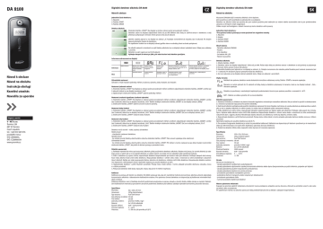 DA 8100 Digitální detektor alkoholu DA 8100 CZ Návod k obsluze Jednotlivé části detektoru: 1. Náustek 2. Tlačítko START 3. Tlačítko MODE Digitálny detektor alkoholu DA 8100 Návod na obsluhu SK Alcoscent DA-8100 slúži k meraniu alkoholu v krvi dychom. Jeho použitie je veľmi prehľadné a jednoduché na ovládanie. Detektor na alkohol môže byť použitý ako pre osobné použitie pred sadnutím za volant vašeho automobilu tak ia pre profesionálne užívanie vo firmách či iných organizácií. Vďaka novým technológiam v oblasti merania je tento detektor veľmi presný. Detekce alkoholu Stiskněte tlačítko „START“. Na displeji se krátce zobrazí počet provedených měření. Detektor začne na displeji odpočítávat číslice až po 000. Během této doby se zahřívá senzor v detektoru a celý přístroj se připravuje k činnosti. Tento proces trvá asi 20 sekund. Jakmile uslyšíte pípnutí a na displeji se zobrazí „0“, foukejte rovnoměrně do náustku (asi 5 sekund). Po dvojím pípnutí přestaňte foukat do detektoru. Po úspěšném foukání se na displeji zobrazí grafika vlevo na obrázky, která se bude pohybovat. Za několik sekund (v závislosti na výši hladiny alkoholu) se na displeji zobrazí výsledek testu. Údaje jsou udávány v promile. Detektor se sám vypne asi za 15-20 sekund. Vyčkejte alespoň 20 minut po jídle, pití nebo kouření než detektor použijete. Jednotlivé části detektoru: +Pre správnu funkciu prístroja je nutné používať len originálne náustky 1. Náustok 2. displej 3. tlačítko START 4. tlačítko MODE Obsah balenia - Detektor alkoholu DA8100 - Púzdro - 6 ks náustkov - 2x batérie AA 1,5V - Návod na použitie Informace zobrazované na displeji Nabité baterie Informace Návod k obsluze Návod na obsluhu Instrukcja obsługi Kezelési utasítás Navodila za uporabo Akce Baterie jsou slabé – Vybité baterie, slabé baterie mohou přístroj nebude ovlivnit výsledky fungovat. testů Krátké nebo přerušené foukání. Pokud do detektoru nefouknete do 30 sekund od výzvy, pak se na displeji zobrazí „Out“ Pokud zapnete detektor v prostředí neodpovídající provozní teplotě (5-+40°C), objeví se na displeji „OutC“ Vyměňte baterie Stiskněte „start“ a opakujte měření Stiskněte tlačítko „start“ k restartování a k novému odpočítávání Opakujte test v odpovídajícím prostředí Ihned vyměňte baterie Uživatelské nastavení Uživatel si může nastavit jednotky měření, zvukovou výstrahu, dobu foukání, sílu foukání. Nastavení jednotek měření 1. Stiskněte tlačítko „START“. Na displeji se zobrazí počet provedených měření a během odpočítávání stiskněte tlačítko „MODE“ a držte (asi 5 sekund), dokud se na displeji nezobrazí „Unit“. 2. Opakovaným stisknutím tlačítka „START“ vyberte jednotky měření. V - NET s.r.o. Šumice 139 687 31 Šumice Czech republic tel.: +420 572 639 076 [email protected] IČO: 26966034, DIČ: CZ26966034 www.promile.cz Chyby merania Nefúkali ste správne, detektor nemá dostatočné množstvo odobranej vzorky. Stlačte START a meranie opakujte. Meranie je nutné vykonať do 15 sekúnd od doby, kedy je detektor pripravený k meraniu, inak sa na displeji zobrazí ,,Out,,. Meranie opakujte. Detektor je používaný v nevhodných teplotných podmienkach, ktoré sú pre správne použitie v rozmedzí 0 - 40°C. BAT – Batérie sú slabé, vymeňte ich za nové alkalické. Nastavení zvukové signalizace (zvuková výstraha) 1. Stiskněte tlačítko „START“. Na displeji se zobrazí počet provedených měření a během odpočítávání stiskněte tlačítko „MODE“ a držte (asi 5 sekund), dokud se na displeji nezobrazí „Unit“. Dalším krátkým stisknutím tlačítka „MODE“ se na displeji zobrazí „BEEp“. 2. Stisknutím tlačítka „START“ vyberte úroveň zvukové výstrahy. Nastavení doby foukání 1. Stiskněte tlačítko „START“. Na displeji se zobrazí počet provedených měření a během odpočítávání stiskněte tlačítko „MODE“ a držte (asi 5 sekund), dokud se na displeji nezobrazí „Unit“. Dalším krátkým stisknutím tlačítka „MODE“ (2x) se na displeji zobrazí „bL-t“. 2. Stisknutím tlačítka „START“ nastavte dobu foukání. Import, servis: Detekcia alkoholu 1. Stlačte tlačítko ,,START 2. Detektor začne na displeji odpočítavať číslice až po 000. Počas tejto doby sa zahrieva senzor v detektore a celý prístroj sa pripravuje k činnosti. Tento proces trvá asi 18 sekúnd. 3. Akonáhle budete pouť pípnutie a na displaji sa zobrazí ,,0,, fúkajte rovnomerne do náustku pokiaľ budete pouť zvukové znamenie (asi 4 - 5 sekúnd). Po dvojitom pípnutí prestaňte fúkať do detektora. 4. Asi za 4 sekundy sa na displaji zobrazí výsledok testu. Údaje sú udávané v promilách Nastavení síly foukání 1. Stiskněte tlačítko „START“. Na displeji se zobrazí počet provedených měření a během odpočítávání stiskněte tlačítko „MODE“ a držte (asi 5 sekund), dokud se na displeji nezobrazí „Unit“. Dalším krátkým stisknutím tlačítka „MODE“ (3x) se na displeji zobrazí „FL-d“. 2. Stisknutím tlačítka „START“ nastavte sílu foukání Detektor má 3 úrovně – nízká, vysoká, uživatelská: Nízká úroveň - standardní nastavení detektoru Vysoká úroveň - ke změně úrovně hladiny vdechnutého vzduchu stiskněte tlačítko „START“. Tato úroveň vyžaduje silné vdechnutí. Uživatelská úroveň - ke změně úrovně hladiny vdechnutého vzduchu stiskněte tlačítko „START“. Při měření v tomto nastavení je po dobu foukání nutné držet stisknuté tlačítko „START“, aby došlo k aktivaci pumpy a provedení testu. Důležitá upozornění 1. Počkejte nejméně 30 minut po konzumaci alkoholu před používáním detektoru alkoholu. Budete 