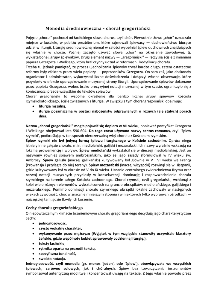 Monodia średniowieczna - chorał gregoriański Pojęcie „chorał" pochodzi od łacioskiego słowa chorus, czyli chór. Pierwotnie słowo „chór" oznaczało miejsce w kościele, w pobliżu prezbiterium, które zajmowali śpiewacy — duchowieostwo biorące udział w liturgii. Liturgię średniowieczną niemal w całości wypełniał śpiew duchownych znajdujących się właśnie w chórze. Później zaczęto używad słowa „chór" na określenie zawodowej, tj. wykształconej, grupy śpiewaków. Drugi element nazwy — „gregoriaoski" — łączy się ściśle z imieniem papieża Grzegorza I Wielkiego, który brał czynny udział w reformach i kodyfikacji chorału. Trzeba tu jednak pamiętad, że proces ujednolicania śpiewów trwał bardzo długo, zatem ostateczne reformy były efektem pracy wielu papieży — poprzedników Grzegorza. On sam zaś, jako doskonały organizator i administrator, wykorzystał liczne doświadczenia i dołączył własne obserwacje, które przyniosły w efekcie uporządkowanie muzycznej strony liturgii. Uporządkowanie śpiewów dokonane przez papieża Grzegorza, wobec braku precyzyjnej notacji muzycznej w tym czasie, ograniczyło się z konieczności przede wszystkim do tekstów śpiewów. Chorał gregoriaoski to wspólne określenie dla bardzo licznej grupy śpiewów Kościoła rzymskokatolickiego, ściśle związanych z liturgią. W związku z tym chorał gregoriaoski obejmuje: liturgię mszalną, iturgię pozamszalną w postaci nabożeostw odprawianych o różnych (ale stałych) porach dnia. Nazwa „chorał gregoriaoski" mogła pojawid się dopiero w VII wieku, ponieważ pontyfikat Grzegorza I Wielkiego obejmował lata 590-604. Do tego czasu używano nazwy cantus romanus, czyli 'śpiew rzymski', podkreślając w ten sposób nierozerwalną więź chorału z Kościołem rzymskim. Śpiew rzymski nie był jedyną formą śpiewu liturgicznego w Kościele zachodnim. Oprócz niego istniały inne gałęzie chorału, m.in. mediolaoski, galijski i mozarabski. Ich nazwy wyraźnie wskazują na lokalną proweniencję i wpływy. Śpiew mediolaoski wykształcił się w diecezji mediolaoskiej. Jest on nazywany również śpiewem ambrozjaoskim, jako że jego zasady sformułował w IV wieku św. Ambroży. Śpiew galijski (inaczej gallikaoski) kultywowany był głównie w V i VI wieku we Francji (Prowansja i przyległe do niej tereny). Śpiew mozarabski (inaczej wizygocki) rozwinął się w Hiszpanii, gdzie kultywowany był w okresie od V do IX wieku. Uznanie centralnego zwierzchnictwa Rzymu oraz rozwój notacji muzycznych przyniosły w konsekwencji dominację i rozpowszechnienie chorału rzymskiego na terenie całego Kościoła zachodniego. Chorał rzymski, czyli gregoriaoski, wchłonął z kolei wiele różnych elementów wykształconych na gruncie obrządków: mediolaoskiego, galijskiego i mozarabskiego. Pomimo dominacji chorału rzymskiego obrządki lokalne zachowały w następnych wiekach żywotnośd, chod w znacznie mniejszym stopniu i w niektórych tylko wybranych ośrodkach — najczęściej tam, gdzie tkwiły ich korzenie. Cechy chorału gregoriańskiego O niepowtarzalnym klimacie brzmieniowym chorału gregoriaoskiego decydują jego charakterystyczne cechy: jednogłosowośd, czysto wokalny charakter, wykonywanie przez mężczyzn (Wyjątek w tym względzie stanowiły oczywiście klasztory żeoskie, gdzie wspólnoty kobiet sprawowały codzienną liturgię.), teksty łacioskie, rytmika oparta na prozodii tekstu, specyficzna tonalnośd, swoista notacja. Jednogłosowośd, czyli monodia (gr. monos 'jeden', ode 'śpiew'), obowiązywała we wszystkich śpiewach, zarówno solowych, jak i chóralnych. Śpiew bez towarzyszenia instrumentów symbolizował autentyczną modlitwę i koncentrował uwagę na tekście. Z tego właśnie powodu przez długi czas zabraniano wręcz używania w kościele instrumentów. W związku z wokalnym charakterem chorału ambitus melodii był niewielki i z reguły nie przekraczał oktawy. Bardziej rozwinięty ambitus miały czasem śpiewy solowe. Melodie chorałowe cechuje płynny sposób ukształtowania ich przebiegu wysokościowego dzięki przewadze postępów sekundowych i tercjowych. W tak zorganizowanej melodii każda większa odległośd uzyskiwała silny walor napięciowy. Większe skoki interwałowe występowały również na styku fraz, oddzielając w ten sposób wyraziście całości znaczeniowe tekstu słownego. W związku z tym, że interwały te nie należały bezpośrednio do melodii chorałowej (pojawiały się po pauzach oddechowych), nazywano je interwałami „martwymi". Chorał gregoriaoski wykonywali wyłącznie mężczyźni. W roku 578 Kościół ogłosił zasadę mulier taceat in ecclesia („kobieta niechaj milczy w Kościele"), która zabraniała kobietom udziału w śpiewie liturgicznym. Wiąże się ona z fragmentem I Listu św. Pawła do Koryntian (rozdz. XIV, w. 33-35). Językiem tekstów liturgicznych jest łacina, którą wprowadzono do liturgii w III wieku. Zachowało się również kilka starszych słów hebrajskich (Alleluja, Amen, Hosanna) oraz greckie zawołanie Kyrie eleison. Wszelkie próby włączenia do liturgii tekstów w językach narodowych były przez Kościół surowo tępione. Dopiero w XX wieku Sobór Watykaoski II (1962-1965) zatwierdził sprawowanie liturgii w językach narodowych. Rytmika w chorale gregoriaoskim jest przejawem całkowitej dominacji tekstu słownego nad muzyką. Melodia chorałowa kształtuje się poprzez słowo i pozostaje w ścisłym związku z tekstem. Ów związek urzeczywistniają oddechy, dla których wyznacznikiem są słowa, zdania lub większe całości treściowe. Odzwierciedleniem sensu słów oraz różnych funkcji śpiewów liturgicznych jest ich zróżnicowane opracowanie. Tym samym melodia chorałowa staje się „udźwiękowieniem prawd wiary". W chorale gregoriaoskim istniały trzy podstawowe sposoby wzajemnego przyporządkowania sobie tekstu i melodii: sylabicz