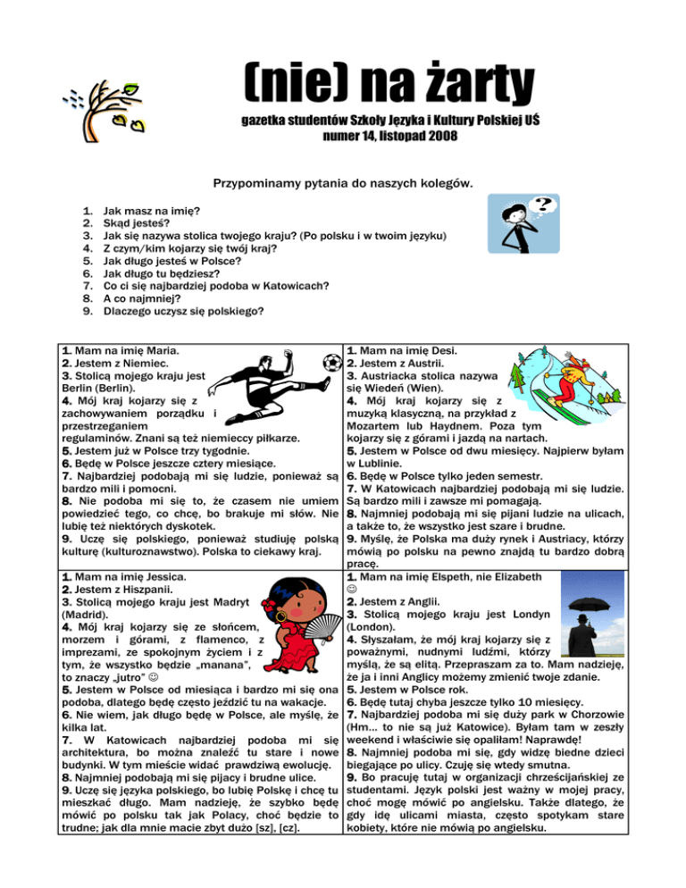 (nie) na Ŝarty gazetka studentów Szkoły Języka i Kultury Polskiej UŚ numer 14, listopad 2008 Przypominamy pytania do naszych kolegów. 1. 2. 3. 4. 5. 6. 7. 8. 9. Jak masz na imię? Skąd jesteś? Jak się nazywa stolica twojego kraju? (Po polsku i w twoim języku) Z czym/kim kojarzy się twój kraj? Jak długo jesteś w Polsce? Jak długo tu będziesz? Co ci się najbardziej podoba w Katowicach? A co najmniej? Dlaczego uczysz się polskiego? 1. Mam na imię Maria. 2. Jestem z Niemiec. 3. Stolicą mojego kraju jest Berlin (Berlin). 4. Mój kraj kojarzy się z zachowywaniem porządku i przestrzeganiem regulaminów. Znani są teŜ niemieccy piłkarze. 5. Jestem juŜ w Polsce trzy tygodnie. 6. Będę w Polsce jeszcze cztery miesiące. 7. Najbardziej podobają mi się ludzie, poniewaŜ są bardzo mili i pomocni. 8. Nie podoba mi się to, Ŝe czasem nie umiem powiedzieć tego, co chcę, bo brakuje mi słów. Nie lubię teŜ niektórych dyskotek. 9. Uczę się polskiego, poniewaŜ studiuję polską kulturę (kulturoznawstwo). Polska to ciekawy kraj. 1. Mam na imię Jessica. 2. Jestem z Hiszpanii. 3. Stolicą mojego kraju jest Madryt (Madrid). 4. Mój kraj kojarzy się ze słońcem, morzem i górami, z flamenco, z imprezami, ze spokojnym Ŝyciem i z tym, Ŝe wszystko będzie „manana”, to znaczy „jutro” ☺ 5. Jestem w Polsce od miesiąca i bardzo mi się ona podoba, dlatego będę często jeździć tu na wakacje. 6. Nie wiem, jak długo będę w Polsce, ale myślę, Ŝe kilka lat. 7. W Katowicach najbardziej podoba mi się architektura, bo moŜna znaleźć tu stare i nowe budynki. W tym mieście widać prawdziwą ewolucję. 8. Najmniej podobają mi się pijacy i brudne ulice. 9. Uczę się języka polskiego, bo lubię Polskę i chcę tu mieszkać długo. Mam nadzieję, Ŝe szybko będę mówić po polsku tak jak Polacy, choć będzie to trudne; jak dla mnie macie zbyt duŜo [sz], [cz]. 1. Mam na imię Desi. 2. Jestem z Austrii. 3. Austriacka stolica nazywa się Wiedeń (Wien). 4. Mój kraj kojarzy się z muzyką klasyczną, na przykład z Mozartem lub Haydnem. Poza tym kojarzy się z górami i jazdą na nartach. 5. Jestem w Polsce od dwu miesięcy. Najpierw byłam w Lublinie. 6. Będę w Polsce tylko jeden semestr. 7. W Katowicach najbardziej podobają mi się ludzie. Są bardzo mili i zawsze mi pomagają. 8. Najmniej podobają mi się pijani ludzie na ulicach, a takŜe to, Ŝe wszystko jest szare i brudne. 9. Myślę, Ŝe Polska ma duŜy rynek i Austriacy, którzy mówią po polsku na pewno znajdą tu bardzo dobrą pracę. 1. Mam na imię Elspeth, nie Elizabeth ☺ 2. Jestem z Anglii. 3. Stolicą mojego kraju jest Londyn (London). 4. Słyszałam, Ŝe mój kraj kojarzy się z powaŜnymi, nudnymi ludźmi, którzy myślą, Ŝe są elitą. Przepraszam za to. Mam nadzieję, Ŝe ja i inni Anglicy moŜemy zmienić twoje zdanie. 5. Jestem w Polsce rok. 6. Będę tutaj chyba jeszcze tylko 10 miesięcy. 7. Najbardziej podoba mi się duŜy park w Chorzowie (Hm… to nie są juŜ Katowice). Byłam tam w zeszły weekend i właściwie się opaliłam! Naprawdę! 8. Najmniej podoba mi się, gdy widzę biedne dzieci biegające po ulicy. Czuję się wtedy smutna. 9. Bo pracuję tutaj w organizacji chrześcijańskiej ze studentami. Język polski jest waŜny w mojej pracy, choć mogę mówić po angielsku. TakŜe dlatego, Ŝe gdy idę ulicami miasta, często spotykam stare kobiety, które nie mówią po angielsku. 1. Mam na imię Bahy. 2. Jestem z Egiptu, dokładnie z Kairu. 3. Stolica mojego kraju nazywa się po polsku Kair, a po arabsku El Kahira. 4. Egipt to piramidy. 5. Jestem w Polsce od dwóch tygodni. 6. Będę w Polsce cztery miesiące. 7. Lubię bardzo dyskoteki. Jest ich duŜo w Katowicach. Lubię teŜ Polaków, którzy są towarzyscy i przyjacielscy. DuŜo podróŜuję autobusami i to jest jak spacer po mieście. 8. Czego nie lubię w Katowicach? – Szarych budynków. 9. Uczę się języka polskiego, Ŝeby pracować jako przewodnik turystyczny z polskimi turystami w Egipcie. 1. Mam na imię Mohammed. 2. Jestem z Maroka. 3. Stolicą mojego kraju jest Rabat. 4. Mój kraj kojarzy się ze słońcem, ciepłem. Tam jest około 3700 kilometrów morza. Maroko kojarzy mi się takŜe z owocami, warzywami i górami. Niestety, jest tam duŜo trawki. W Maroku jest wielu turystów, poniewaŜ są tam piękne miasta i leŜy blisko Europy. 5. Jestem w Polsce osiem miesięcy. 6. Nie wiem tego. 7. W Katowicach najbardziej podoba mi się centrum. 8. Najmniej podobają mi się ulice i stare budynki, a takŜe zbyt duŜo alkoholików. 9. PoniewaŜ lubię języki obce. PRZEMÓWIENIE NA TEMAT ZACHOWANIA TRADYCJI DZIADÓW* Szanowni Państwo! Jest mi niezwykle miło powitać Państwa na dzisiejszym spotkaniu Towarzystwa Propagowania Kultury. Za nami 31 października, kiedy obchodzimy nie tylko komercyjne święto Halloween, ale przede wszystkim przypominamy sobie „Dziady” – ludowy zwyczaj, którego współczesnym odpowiednikiem są Zaduszki. Muszę tu dodać, Ŝe Halloween to, oczywiście, teŜ tradycja, ale – niestety – dziś za bardzo zamerykanizowana i nastawiona jedynie na imprezowanie i zabawy. Drogie Panie, Drodzy Panowie w tych waŜnych dla naszej kultury dniach czcimy i pamiętamy o naszych zmarłych przodkach. Dziady mają pogańskie korzenie, zostały potępione przez Kościół z powodu magicznych, odbywających się potajemnie rytuałów. Szanowni Państwo, jak wiemy w dzisiejszych czasach nadal kultywuje się niektóre z tych obyczajów – np. przynoszenie jadła na groby zmarłych – nie tylko we wschodniej Polsce, ale teŜ na Białorusi, Ukrainie i w Rosji. MoŜna powiedzieć, iŜ jest to część kultury słowiańskiej i powinniśmy pielęgnować tę tradycję. Jest to wyjątkowy czas, gdyŜ na wszystkich cmentarzach moŜna poczuć tę niesamowitą magiczną atmosferę. Oddajemy cześć naszym przodkom, częstując ich jedzeniem, modląc się za nich, chcemy jak najlepiej „ugościć” 