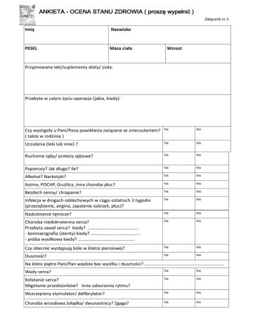 ANKIETA - OCENA STANU ZDROWIA ( proszę wypełnić ) Załącznik nr 3 Imię Nazwisko PESEL Masa ciała Wzrost Przyjmowane leki/suplementy diety/ zioła: Przebyte w całym życiu operacje (jakie, kiedy): Czy wystąpiły u Pani/Pana powikłania związane ze znieczuleniem? ( także w rodzinie ) Tak Nie Uczulenia (leki lub inne) ? Tak Nie Ruchome zęby/ protezy zębowe? Tak Nie Papierosy? Jak długo? Ile? Tak Nie Alkohol? Narkotyki? Tak Nie Astma, POCHP, Gruźlica, inna choroba płuc? Tak Nie Bezdech senny/ chrapanie? Tak Nie Infekcja w drogach oddechowych w ciągu ostatnich 3 tygodni (przeziębienie, angina, zapalenie oskrzeli, płuc)? Tak Nie Nadciśnienie tętnicze? Tak Nie Choroba niedokrwienna serca? Przebyty zawał serca? kiedy? ………………………………….... - koronarografia (stenty) kiedy? ………………………………...... - próba wysiłkowa kiedy? ………………………………………... Tak Nie Czy obecnie występują bóle w klatce piersiowej? Tak Nie Duszność? Tak Nie Na które piętro Pani/Pan wejdzie bez wysiłku i duszności? …........................................................... Wady serca? Tak Nie Kołatanie serca? Migotanie przedsionków? Inne zaburzenia rytmu? Tak Nie Wszczepiony stymulator/ defibrylator? Tak Nie Choroba wrzodowa żołądka/ dwunastnicy? Zgaga? Tak Nie ANKIETA - OCENA STANU ZDROWIA ( proszę wypełnić ) Załącznik nr 3 Bóle brzucha? Żółtaczka? Tak Nie Biegunki/wymioty w ciągu ostatnich 3 tygodni? Tak Nie Padaczka? Tak Nie Udar mózgu? - kiedy?............................................................................................. Tak Nie Niedowład kończyn górnych lub dolnych? Tak Nie Choroby kręgosłupa? Tak Nie Toczeń? Reumatyzm? Tak Nie Depresja/ nerwica? Inne zaburzenia? Tak Nie Cukrzyca? insulina? / leki doustne? -poziomy cukrów w pomiarach domowych na czczo/ po posiłku .......................................................................................................... Tak Nie Choroby tarczycy, nadnerczy? Tak Nie Choroby układu moczowego/nerek? Zakażenia ? Dializoterapia? Tak Nie Skłonność do krwawień/ siniaków? Anemia? Niedokrwistość? Tak Nie Choroby zakaźne? Wirusowe zapalenie wątroby? HIV ? Tak Nie Choroby nowotworowe? – jakie ............................................... -chemioterapia- kiedy? ............................................... -radioterapia- kiedy? ................................................ Tak Nie Zaburzenia widzenia? Jaskra? Tak Nie Czy kiedykolwiek miała Pani/Pan transfuzję krwi? preparatów? - czy były powikłania?..................................................................... Tak Nie Pytania do lekarza Oświadczam, że odpowiedziałam/em prawdziwie na zadawane mi w ankiecie pytania i nie zataiłam/em żadnej informacji o stanie mojego zdrowia. Data: Czytelny podpis pacjenta: BARDZO WAŻNE!!!!! proszę dostarczyć na wizytę do Poradni Anestezjologicznej wypełnioną ankietę i zaświadczenie od lekarza prowadzącego lub lekarza specjalisty o stanie zdrowia , w przypadku występowania chorób wymienionych w ankiecie oraz jeśli posiadają Państwo wypisy ze szpitala, dodatkowe badania np. ECHO serca, koronarografię, próbę wysiłkową, Holtera, hormony tarczycy, spirometrię i inne
