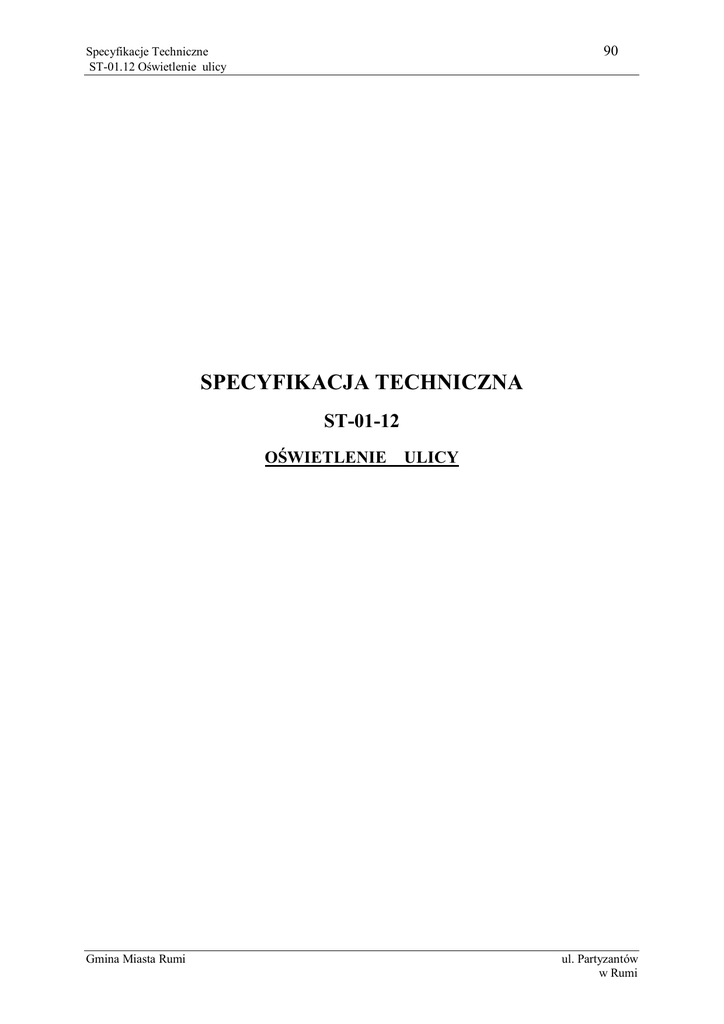 90 Specyfikacje Techniczne ST-01.12 Oświetlenie ulicy SPECYFIKACJA TECHNICZNA ST-01-12 OŚWIETLENIE Gmina Miasta Rumi ULICY ul. Partyzantów w Rumi 91 Specyfikacje Techniczne ST-01.12 Oświetlenie ulicy 1. WSTĘP 1.1. Przedmiot ST Przedmiotem niniejszej ogólnej specyfikacji technicznej (ST) są wymagania dotyczące wykonania i odbioru robót związanych z budową ulicy: Oświetlenie ul. Partyzantów w Rumii. 1.2. Zakres stosowania ST Specyfikacja techniczna (ST) jest stosowana jako dokument przetargowy i kontraktowy przy zlecaniu i realizacji robót na zadaniu wymienionemu w pkt. 1.1 . 1.3. Zakres robót objętych ST Zakres robót objętych Szczegółową Specyfikacją Techniczną obejmuje wszystkie czynności, w obszarze budowy ul. Partyzantów w Rumii, umożliwiające i mające na celu wykonanie oświetlenia ulicy. W zakres prac wchodzą: Montaż oświetlenia: - montaż szafy oświetleniowej na fundamencie prefabrykowanym, - wykopanie i zasypanie rowów kablowych, - ułożenie przepustów i rur ochronnych pod drogami oraz przy zbliżeniach i skrzyżowaniach, - nasypanie warstwy piasku na dnie rowów kablowych oraz na ułożonych kablach, - ułożenia kabli w rowach kablowych, - wciąganie kabli do rur ochronnych, - montaż fundamentów prefabrykowanych pod słupy oświetleniowe - wkopanie fundamentów i ustawienie słupów oświetleniowych, - wciąganie przewodów w słupy oświetleniowe, - montaż opraw oświetleniowych, - wykonanie uziemień słupów i szafy oświetleniowej, - prace pomiarowo-rozruchowe. Zasilanie oświetlenia i powiązanie z oświetleniem istniejącym (zgodnie z umową przyłączeniową) - montaż rur ochronnych na słupach stacji słupowej, - wciąganie kabli w rury ochronne, - pomiary elektryczne, - roboty pomocnicze( malowania, opisy, montaż tabliczek itp.). Demontaż oświetlenia istniejącego - demontaż opraw z wysięgników, - demontaż wysięgników ze słupów linii napowietrznej nn. - wywóz zdemontowanych materiałów 1.4. Określenia podstawowe Określenia podane w niniejszej SST są zgodne z obowiązującymi normami i określeniami podanymi w specyfikacji D-00.00.00. „Wymagania Ogólne”: 1.4.1. Słup oświetleniowy – konstrukcja wsporcza osadzona bezpośrednio w gruncie lub na fundamencie, służąca do zamocowania oprawy oświetleniowej (bezpośrednio lub na wysięgniku) na wysokości nie większej niż 14 m. 1.4.2. Oprawa oświetleniowa – urządzenia służące do rozdziału, filtracji i przekształcenia strumienia świetlnego wysyłanego przez źródło światła, zawierająca wszystkie niezbędne detale do przymocowania i połączenia z instalacją elektryczną. Gmina Miasta Rumi ul. Partyzantów w Rumi 92 Specyfikacje Techniczne ST-01.12 Oświetlenie ulicy 1.4.3. Kabel – przewód wielożyłowy izolowany, przystosowany do przewodzenia prądu elektrycznego, mogący pracować pod i nad ziemią. 1.4.4. Fundament – konstrukcja żelbetowa zagłębiona w ziemi, służąca do utrzymania słupa lub szafy oświetleniowej w pozycji pracy. 1.4.5. Szafa oświetleniowa – urządzenie rozdzielczo – sterownicze bezpośrednio zasilające instalacje oświetleniowe. 1.4.6. Linia kablowa – kabel wielożyłowy lub wiązka kabli jednożyłowych w układzie wielofazowym albo kilka kabli jedno- lub wielożyłowych połączonych równolegle, łącznie z osprzętem, ułożone na wspólnej trasie i łączące zaciski tych samych dwóch urządzeń elektrycznych jedno- lub wielofazowych. 1.4.7. Trasa kablowa – pas terenu, w którym ułożone są jedna lub więcej linii kablowych. 1.4.8. Osprzęt linii kablowej – zbiór elementów przeznaczonych do łączenia, rozgałęzienia lub zakończenia kabli. 1.4.9. Osłona kabla - konstrukcja przeznaczona do ochrony kabla przed uszkodzeniami mechanicznymi, chemicznymi i działaniem łuku elektrycznego. 1.4.10. Przykrycie – osłona ułożona nad kablem w celu ochrony przed mechanicznym uszkodzeniem z góry. 1.4.11. Przepust kablowy - konstrukcja o przekroju najczęściej okrągłym przeznaczona do ochrony kabla przed uszkodzeniami mechanicznymi, chemicznymi i działaniem łuku elektrycznego. 1.4.12. Skrzyżowanie – takie miejsca na trasie linii kablowej, w których jakakolwiek część rzutu poziomego linii kablowej przecina lub pokrywa jakąkolwiek część rzutu poziomego innej linii kablowej lub innego urządzenia podziemnego. 1.4.13. Zbliżenie- takie miejsca na trasie linii kablowej, w którym odległość między linią kablową, urządzeniem podziemnym lub drogą komunikacyjną itp. jest mniejsza niż odległość dopuszczalna dla danych warunków układania bez stosowania przegród lub osłon zabezpieczających i w których nie występuje skrzyżowanie. 1.4.14. Napięcie znamionowe linii – napięcie międzyprzewodowe, na które linia kablowa została zbudowana. 1.4.15. Średnie natężenie oświetlenia na jezdni - stosunek strumienia światła padającego na powierzchnię jezdni do jej pola. 1.4.16. Dodatkowa ochrona przeciwporażeniowa - ochrona części przewodzących, dostępnych w wypadku pojawienia się na nich napięcia w warunkach zakłóceniowych. 2. MATERIAŁY 2.1. Ogólne wymagania Ogólne wymagania dotyczące materiałów podano w ST-D-00.00.00. 2.2. Materiały budowlane 2.2.1. Cement. Do wykonania fundamentów betonowych pod słupy oświetleniowe zaleca się stosowanie cementu portlandzkiego marki 35 bez dodatków, spełniający wymagania norm PN-90/B-3000. Cement powinien być dostarczany w opakowaniach spełniających wymagania BN-88/6731-08. Gmina Miasta Rumi ul. Partyzantów w Rumi 93 Specyfikacje Techniczne ST-01.12 Oświetlenie ulicy 2.2.2. Piasek. Piasek do wykonania robót powinien spełniać wymagania normy BN-87/6774-04. 2.2.3. Żwir. Należy stosować żwir odpowiadający wymaganiom normy BN-66/6774-01. 2.2.4. Woda. Woda powinna być, “odmiany 1”, zgodnie z wymaganiami normy PN-88/B-32250. 2.2.5. Folia ostrzegawcza. Należy używać folii kalandrowanej z uplastycznionego PC