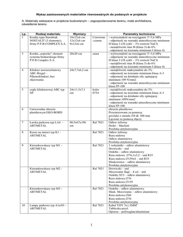 Wykaz zastosowanych materiałów równowaŜnych do podanych w projekcie A. Materiały wskazane w projekcie budowlanym – zagospodarowanie terenu, mała architektura, oświetlenie terenu Lp. 1 Rodzaj materiału Kostka typu Starobruk NOSTALIT (3 elementy), firmy P.P.B-COMPLEX S.A. Wymiary 18x12x6 cm 12x12x6 cm 9x12x6 cm Czerwono -czarna 3 Kostka „sopocka” element systemu brukarskiego firmy P.P.B Complex S.A. 20x20 cm szara 4 Klinkier nawierzchniowy ABC-Riegel – Pflasterklinkier, bez sfazowania 24x7,7x6,2 cm 5 cegły klinkierowej ABC typ NF 24x11,5x7,1 cm kolor 0754 6 Uniwersalne obrzeŜe plastikowym EKO-BORD 7 Ławka parkowa typ LA4 ARTMETAL 80,5x67x196 cm Ral 7021 8 Kosze na śmieci typ K1 ARTMETAL Ral 7021 9 Kierunkowskazy typ M1 ARTMETAL Ral 7021 Kierunkowskazy typ M2 ARTMETAL Ral 7021 Kierunkowskazy typ M3 ARTMETAL Ral 7021 Lampy parkowe typ A1a/03 ARTMETAL Ral 7021 10 1 Parametry techniczne - wytrzymałość na rozciąganie T>3,6 MPa - odporność na warunki atmosferyczne minimum D klasa 3 (28 cykli – 3% roztwór NaCl) - nasiąkliwość max B (klasa 3) do 6% - odporność na ścieranie minimum I (klasa 4) - wytrzymałość na rozciąganie T>3,6 MPa - odporność na warunki atmosferyczne minimum D klasa 3 (28 cykli – 3% roztwór NaCl) - nasiąkliwość max B (klasa 3) do 6% - odporność na ścieranie minimum I (klasa 4) - nasiąkliwość maksymalnie do 3% - odporność na ścieranie minimum klasa A-3 - odporność na działanie siły zginającej minimum 109 N/mm2 - odporność na warunki atmosferyczne minimum klasa FP-100 - nasiąkliwość maksymalnie do 3% - odporność na ścieranie minimum klasa A-3 - odporność na działanie siły zginającej minimum 109N/mm2 - odporność na warunki atmosferyczne minimum klasa FP-100 obrzeŜe plastikowe Przymocowane za pomocą: gwoździ z metalu ∅8 dł. 300 mm Łączone za pomocą złączy Odlew Ŝeliwny Deski – Machoń Powłoka antykorozyjna Odlew Ŝeliwny Rura stalowa Odlew aluminiowy Powłoka antykorozyjna 3 wskaźniki – odlew aluminiowy Drzwiczki – stal Ozdoba – odlew aluminiowy Rura stalowa ∅76,1x3,2 – stal R35 Rura stalowa ∅159x4 – stal R35 Maskownica – odlew aluminiowy Powłoka antykorozyjna Drzwiczki – stal Mocowanie flagi – 4 szt – stal Ozdoby ST3 – odlew aluminiowy Rura stalowa ∅76 Rura stalowa ∅159 Powłoka antykorozyjna Ozdoba – odlew aluminiowy Mask. Mocowania – odlew aluminiowy Rura stalowa ∅60 Rura stalowa ∅76 Powłoka antykorozyjna Kabel YDY 3x1,5MM2 Tabliczka przył. Oprawa – poliwęglan/aluminium 11 Lampy z projektorem rozświetlającym QBA 150W katalog THORN 12 Lampy do zamontowania w ściankach mostków (VIA2R, HSP-DE70 W, RX7s) katalog THORN 13 skrzynka pomiarowo rozdzielcza – ZKL 1/2 „ENBUD” Rura kanel ∅80 – aluminium Ozdoby – odlew aluminiowy Baza słupa – odlew aluminiowy Powłoka antykorozyjna Typ rozsyłu światła – asymetryczny Źródło światła HPS-DE 150W krzywa światłości wg katalogu THORN WysokopręŜna lampa sodowa 150W Trzonek Rx7s Obudowa z odlewanego ciśnieniowo aluminium malowanego proszkowo Przeznaczona do montaŜu w ścianie (licowane z pow. ściany) Klasa bezpieczeństwa II. Oprawa na źródło światła 70W, krzywa światłości wg katalogu THORN Złącze Licznikowe z trzema osobnymi segmentami 645mm x 795mm x 245mm B. Materiały równowaŜne: Lp. Nazwa materiału Wymiary ............................................ /miejscowość, data/ Parametry techniczne proponowanych materiałów .............................................................................. /pieczęć i podpis osób uprawnionych do reprezentowania wykonawcy/ 2