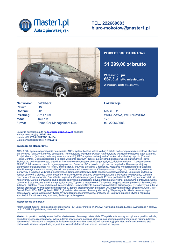 TEL. 222660683 [email protected] PEUGEOT 3008 2.0 HDi Active 51 299,00 zł brutto W leasingu już: 667.3 zł netto miesięcznie 36 miesięcy, opłata wstępna 10% Nadwozie: Paliwo: Rocznik: Przebieg: Moc: Firma: hatchback ON 2013 87117 km 150 KM Prime Car Management S.A. Lokalizacja: MASTER1 WARSZAWA, WILANOWSKA 178 tel. 222660683 Sprawdź bezpłatnie auto na historiapojazdu.gov.pl podając: Numer rejestracyjny: WD4232G Numer VIN: VF30URHE8DS144154 Datę pierwszej rejestracji: 14.08.2013 Wyposażenie standardowe: ABS, AFU - system wspomagania hamowania, ASR - system kontroli trakcji, Airbag 6 sztuk: poduszki powietrzne czołowe i boczne dla kierowcy i pasażera, kurtyny powietrzne, Automatyczne włączanie świateł, Automatyczne włączanie świateł do jazdy dziennej, Czujnik deszczu (automatycznie włączane wycieraczki), DRC - system redukcji wahań wokół osi wzdłużnej pojazdu (Dynamic Rolling Control), Deska rozdzielcza z konsolą w kolorze czarnym - Nacre, Elektryczna blokada otwarcia drzwi tylnych i szyb, Elektryczne podnoszenie szyb, przód i tył (sterowane sekwencyjnie z blokadą przycięcia), Felgi aluminiowe 17 z ogumieniem 225/50, Fotel kierowcy z mech. regulacją wysokości, Gniazda 12V: z przodu, z tyłu oraz w bagażniku, Hamulec postojowy elektryczny (FSE) z funkcją Hill Assist, Immobilizer, Kierownica skórzana, 3-ramienna, Kieszenie w oparciach foteli przednich, Klamki wewnętrzne chromowane, Klamki zewnętrzne w kolorze nadwozia, Klimatyzacja automatyczna, dwustrefowa, Kolumna kierownicy z regulacją w dwóch płaszczyznach, Komputer pokładowy, Koło zapasowe pełnowymiarowe, Lampki do czytania w konsoli sufitowej z przodu, Listwy boczne w kolorze czarnym, Lusterka boczne regulowane elektrycznie i ogrzewane, Lusterka boczne w kolorze nadwozia, Oświetlenie bagażnika, Oświetlenie progów (przód), Przedni podłokietnik, REF - system rozdziału sił hamowania, System domykania szyb podczas zamykania samochodu, Szyba przednia akustyczna, Szyba tylna ogrzewana, Szyby barwione, Szyby boczne tylne i tylna przyciemniane, Tapicerka materiałowa, Tempomat z organicznikiem prędkości, Tylne oparcie składane, dzielone, Tylny podłokietnik ze schowkiem, Uchwyty ISOFIX do mocowania fotelika dziecięcego - tył, Uchwyty na kubki w konsoli środkowej, WIP Bluetooth (gniazdo USB, zestaw głośnomówiący Bluetooth w f. przesyłania muzyki Streaming Audio), WIP Sound: Radio CD z MP3, gniazdo AUX, 6 głośników, sterowanie z kolumny kierownicy, Wspomaganie układu kierowniczego progresywne, Wycieraczka szyby tylnej, Wyświetlacz monochromatyczny, graficzny C-, Zagłówki przednie i tylne z regulacją wysokości, Zamek centralny z pilotem, Światła przeciwmgielne Wyposażenie dealerskie: Alarm, pakiet, Czujnik odległości przy parkowaniu - tył, Lakier metalik, WIP NAV: Nawigacja z mapą Europy, wyświetlacz 7-calowy, radio CD/MP3 6 głośników, bluetooth, Aux-In Master1 to punkt sprzedaży samochodów Masterlease, pierwszego właściciela. Wszystkie auta zostały zakupione w polskim salonie, posiadają wycenę rzeczoznawcy, były regularnie serwisowane podczas użytkowania i posiadają udokumentowaną historię zdarzeń serwisowych. W Master1.pl znajdziecie Państwo szeroki wachlarz ubezpieczeń komunikacyjnych. Nasza oferta skierowana jest zarówno do klientów indywidualnych jak i firm. Wszelkich formalności można dokonać na miejscu. Opis wygenerowano 16.02.2017 o 11:05 Strona 1 z 1