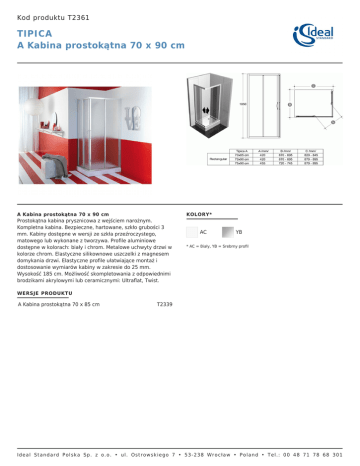 Kod produktu T2361 TIPICA A Kabina prostokątna 70 x 90 cm A Kabina prostokątna 70 x 90 cm KOLORY* Prostokątna kabina prysznicowa z wejściem narożnym. Kompletna kabina. Bezpieczne, hartowane, szkło grubości 3 mm. Kabiny dostępne w wersji ze szkła przeźroczystego, matowego lub wykonane z tworzywa. Profile aluminiowe dostępne w kolorach: biały i chrom. Metalowe uchwyty drzwi w kolorze chrom. Elastyczne silikownowe uszczelki z magnesem domykania drzwi. Elastyczne profile ułatwiające montaż i dostosowanie wymiarów kabiny w zakresie do 25 mm. Wysokość 185 cm. Możliwość skompletowania z odpowiednimi brodzikami akrylowymi lub ceramicznymi: Ultraflat, Twist. AC YB * AC = Biały, YB = Srebrny profil WERSJE PRODUKTU A Kabina prostokątna 70 x 85 cm T2339 Ideal Standard Polska Sp. z o.o. • ul. Ostrowskiego 7 • 53-238 Wrocław • Poland • Tel.: 00 48 71 78 68 301