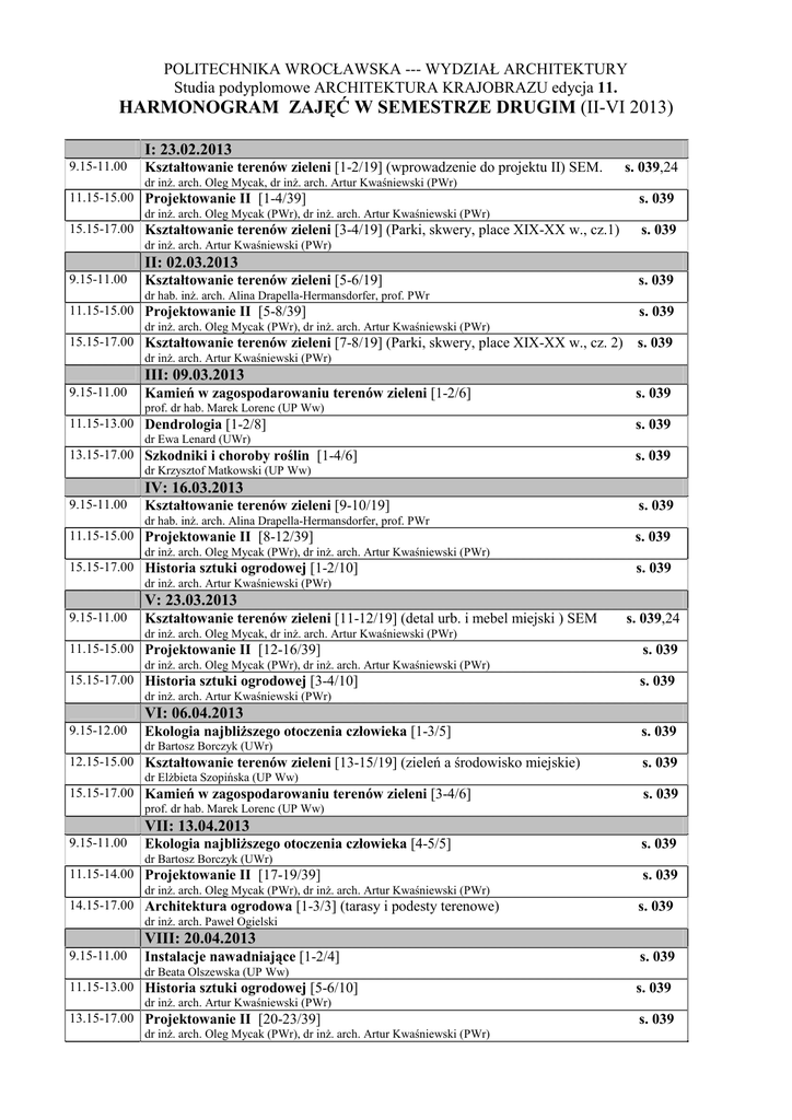 POLITECHNIKA WROCŁAWSKA --- WYDZIAŁ ARCHITEKTURY Studia podyplomowe ARCHITEKTURA KRAJOBRAZU edycja 11. HARMONOGRAM ZAJĘĆ W SEMESTRZE DRUGIM (II-VI 2013) I: 23.02.2013 9.15-11.00 Kształtowanie terenów zieleni [1-2/19] (wprowadzenie do projektu II) SEM. s. 039,24 dr inŜ. arch. Oleg Mycak, dr inŜ. arch. Artur Kwaśniewski (PWr) 11.15-15.00 Projektowanie II [1-4/39] s. 039 dr inŜ. arch. Oleg Mycak (PWr), dr inŜ. arch. Artur Kwaśniewski (PWr) 15.15-17.00 Kształtowanie terenów zieleni [3-4/19] (Parki, skwery, place XIX-XX w., cz.1) s. 039 dr inŜ. arch. Artur Kwaśniewski (PWr) II: 02.03.2013 9.15-11.00 Kształtowanie terenów zieleni [5-6/19] s. 039 dr hab. inŜ. arch. Alina Drapella-Hermansdorfer, prof. PWr 11.15-15.00 Projektowanie II [5-8/39] s. 039 dr inŜ. arch. Oleg Mycak (PWr), dr inŜ. arch. Artur Kwaśniewski (PWr) 15.15-17.00 Kształtowanie terenów zieleni [7-8/19] (Parki, skwery, place XIX-XX w., cz. 2) s. 039 dr inŜ. arch. Artur Kwaśniewski (PWr) III: 09.03.2013 9.15-11.00 Kamień w zagospodarowaniu terenów zieleni [1-2/6] s. 039 prof. dr hab. Marek Lorenc (UP Ww) 11.15-13.00 Dendrologia [1-2/8] s. 039 dr Ewa Lenard (UWr) 13.15-17.00 Szkodniki i choroby roślin [1-4/6] s. 039 dr Krzysztof Matkowski (UP Ww) IV: 16.03.2013 9.15-11.00 Kształtowanie terenów zieleni [9-10/19] s. 039 dr hab. inŜ. arch. Alina Drapella-Hermansdorfer, prof. PWr 11.15-15.00 Projektowanie II [8-12/39] s. 039 dr inŜ. arch. Oleg Mycak (PWr), dr inŜ. arch. Artur Kwaśniewski (PWr) 15.15-17.00 Historia sztuki ogrodowej [1-2/10] s. 039 dr inŜ. arch. Artur Kwaśniewski (PWr) V: 23.03.2013 9.15-11.00 Kształtowanie terenów zieleni [11-12/19] (detal urb. i mebel miejski ) SEM s. 039,24 dr inŜ. arch. Oleg Mycak, dr inŜ. arch. Artur Kwaśniewski (PWr) 11.15-15.00 Projektowanie II [12-16/39] s. 039 dr inŜ. arch. Oleg Mycak (PWr), dr inŜ. arch. Artur Kwaśniewski (PWr) 15.15-17.00 Historia sztuki ogrodowej [3-4/10] s. 039 dr inŜ. arch. Artur Kwaśniewski (PWr) VI: 06.04.2013 9.15-12.00 Ekologia najbliŜszego otoczenia człowieka [1-3/5] s. 039 dr Bartosz Borczyk (UWr) 12.15-15.00 Kształtowanie terenów zieleni [13-15/19] (zieleń a środowisko miejskie) s. 039 dr ElŜbieta Szopińska (UP Ww) 15.15-17.00 Kamień w zagospodarowaniu terenów zieleni [3-4/6] s. 039 prof. dr hab. Marek Lorenc (UP Ww) VII: 13.04.2013 9.15-11.00 Ekologia najbliŜszego otoczenia człowieka [4-5/5] s. 039 dr Bartosz Borczyk (UWr) 11.15-14.00 Projektowanie II [17-19/39] s. 039 dr inŜ. arch. Oleg Mycak (PWr), dr inŜ. arch. Artur Kwaśniewski (PWr) 14.15-17.00 Architektura ogrodowa [1-3/3] (tarasy i podesty terenowe) s. 039 dr inŜ. arch. Paweł Ogielski VIII: 20.04.2013 9.15-11.00 Instalacje nawadniające [1-2/4] s. 039 dr Beata Olszewska (UP Ww) 11.15-13.00 Historia sztuki ogrodowej [5-6/10] s. 039 dr inŜ. arch. Artur Kwaśniewski (PWr) 13.15-17.00 Projektowanie II [20-23/39] dr inŜ. arch. Oleg Mycak (PWr), dr inŜ. arch. Artur Kwaśniewski (PWr) s. 039 IX: 27.04.2013 9.15-11.00 Instalacje nawadniające [3-4/4] s. 039 dr Beata Olszewska (UP Ww) 11.15-13.00 Historia sztuki ogrodowej [7-8/10] s. 039 dr inŜ. arch. Artur Kwaśniewski (PWr) 13.15-15.00 Roślinoznawstwo [1-2/8] Ogród Botaniczny lub s. 039 dr Regina Dębicz (UP Ww) 15.15-17.00 Dendrologia [3-4/8] Ogród Botaniczny lub s. 039 dr Ewa Lenard (UWr) X: 11.05.2013 9.15-13.00 Roślinoznawstwo [3-6/8] Ogród Botaniczny lub s. 039 dr Regina Dębicz (UP Ww) 13.15-17.00 Projektowanie II [24-27/39] s. 039 dr inŜ. arch. Oleg Mycak (PWr), dr inŜ. arch. Artur Kwaśniewski (PWr) XI: 18.05.2013 9.15-11.00 Kształtowanie terenów zieleni [16-17/19] s. 039 dr hab. inŜ. arch. Alina Drapella-Hermansdorfer, prof. PWr 11.15-13.00 Dendrologia [5-6/8] Ogród Botaniczny lub s. 039 dr Ewa Lenard (UWr) 13.15-17.00 Projektowanie II [28-31/39] s. 039 dr Ewa Lenard (UWr), dr inŜ. arch. Oleg Mycak (PWr), dr inŜ. arch. Artur Kwaśniewski (PWr) XII: 25.05.2013 9.15-11.00 Kamień w zagospodarowaniu terenów zieleni [5-6/6] s. 039 prof. dr hab. Marek Lorenc (UP Ww) 11.15-15.00 Instalacje elektryczne i iluminacja terenów zieleni [1-4/4] s. 039 mgr inŜ. arch. Andrzej Pruszyński (pracownia projektowa Business Design, Wrocław) 15.15-17.00 Szkodniki i choroby roślin [5-6/6] s. 039 dr Krzysztof Matkowski (UP Ww) XIII: 08.06.2013 9.15-11.00 Kształtowanie terenów zieleni [18-19/19] s. 039 dr hab. inŜ. arch. Alina Drapella-Hermansdorfer, prof. PWr 11.15-13.00 Roślinoznawstwo [7-8/8] Ogród Botaniczny lub s. 039 dr Regina Dębicz (UP Ww) 13.15-17.00 Projektowanie II [32-35/39] s. 039 dr Regina Dębicz (UP Ww), dr inŜ. arch. Oleg Mycak (PWr), dr inŜ. arch. Artur Kwaśniewski (PWr) XIV: 15.06.2013 9.15-11.00 Dendrologia [7-8/8] Ogród Botaniczny lub s. 039 dr Ewa Lenard (UWr) 11.15-15.00 Projektowanie II [36-39/39] s. 039 dr Ewa Lenard (UWr), dr inŜ. arch. Oleg Mycak (PWr), dr inŜ. arch. Artur Kwaśniewski (PWr) 15.15-17.00 Historia sztuki ogrodowej [9-10/10] dr inŜ. arch. Artur Kwaśniewski (PWr) s. 039 ZASADY I SCHEMAT WYPEŁNIENIA INDEKSU NA SEMESTR 2. 1. Uczestnicy studiów uzyskują wpis do indeksu na ostatnich zajęciach danego cyklu zajęć w semestrze (o kolejności zajęć informuje szczegółowy harmonogram). Uczestnik, który nie zdobędzie wpisu w przewidzianym terminie (z powodu nieobecności itd.) zobowiązany jest samodzielnie skontaktować się z wykładowcą. 2. Zajęcia wykładowe są zaliczane na ocenę w formie zaliczenia lub egzaminu – na podstawie pisemnego kolokwium lub pracy, zaliczeniowej sprawdzających uzyskaną wiedzę (o terminach i innych szczegółach informuje wykładowca), bądź w oparciu o frekwencję na zajęciach (tj. na podstawie listy obecności, którą wykładowca przedkłada na zajęciach; do uzyskania zaliczenia wymagana jest frekwencja minimum 50procentowa). 3. Podstawą do zaliczenia zajęć projektowych (na ocenę) jest złoŜenie w określonym terminie projektu semestralnego. - Wszystkie przedmioty w semestrze 2. pogrupowane są w 