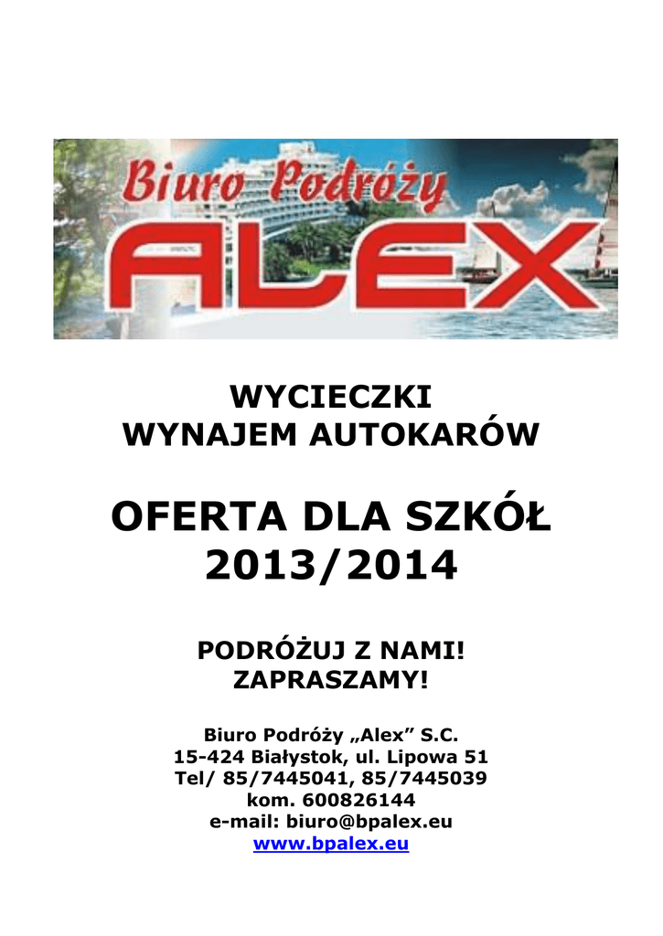WYCIECZKI WYNAJEM AUTOKARÓW OFERTA DLA SZKÓŁ 2013/2014 PODRÓŻUJ Z NAMI! ZAPRASZAMY! Biuro Podróży „Alex” S.C. 15-424 Białystok, ul. Lipowa 51 Tel/ 85/7445041, 85/7445039 kom. 600826144 e-mail: [email protected] www.bpalex.eu 3 DNI - GÓRY ŚWIĘTOKRZYSKIE: KIELCE – JASKINIA RAJ – KRZEMIONKI OPATOWSKIE RAMOWY PROGRAM: Kielce: Pałac Biskupów, kościół katedralny Wniebowzięcia NMP, Muzeum Zabawkarstwa, Kadzielnia – rezerwat przyrody nieożywionej. Jaskinia Raj – najbardziej znana jaskinia w kraju. Atrakcyjne formy stalaktytów, stalagmitów i stalagnatów Chęciny: zamek z XIII stalagnatów, kościół parafialny Nowa Słupia: Muzeum Starożytnego Hutnictwa, kamienny pielgrzym. Św. Krzyż: zabytkowe opactwo Benedyktynów z XII w. (klasztor, kościół), Muzeum Przyrodniczo – Leśne Świętokrzyskiego Parku Narodowego, Muzeum Misyjne Księży Oblatów – historia Św. Krzyża. Bodzentyn: kościół kolegiacki z XV w, ruiny zamku z XIV w, mini skansen - Chałupa Czernikiewiczów Św. Katarzyna: zespół klasztorny z 1471 r.- obecnie benedyktynek, źródełko i kapliczki św. Franciszka z XIX w, wejście na Łysicę (612 m). Bałtów: Park Dinozaurów Krzemionki Opatowskie: zwiedzanie Muzeum Krzemienia –dawna kopalnia Cena od osoby: 395 zł ŚWIADCZENIA: przejazd autokarem Lux, 2 noclegi, wyżywienie (2 śniadania, 2 obiadokolacje, 1 obiad), ubezpieczenie NNW, usługa pilota, usługi lokalnych przewodników, bilety wstępu, opłaty drogowe i parkingowe 2 DNI - KOZŁÓWKA– LUBLIN – KAZIMIERZ DOLNY – PUŁAWY RAMOWY PROGRAM: Kozłówka: zespół pałacowo-parkowy Zamojskich z XVIII w, Galeria Sztuki Socrealizmu Lublin: Stare Miasto z fragmentami XIV-wiecznych murów obronnych, Brama Krakowska, Grodzka, Ratusz i kamieniczki Zamek – muzeum ze zbiorami historycznymi, etnograficznymi, kolekcją malarstwa, m. in. Obraz Jana Matejki „Unia Lubelska”, kaplica Trójcy Św. z polichromią bizantyjsko - ruską, kościół Dominikanów, Wieża Trynitarska – widok na Stare Miasto z wysokości 42 m, Katedra. Kazimierz Dolny: rynek z kamienicami sprzed 300 lat, drewniana studnia, Kościół św. Jana Chrzciciela i Bartłomieja, ruiny zamku Kazimierza Wielkiego, Baszta z XII w, Góra Trzech Krzyży Puławy: rezydencja rodu Czartoryskich: zespół pałacowo – parkowy z licznymi budowlami (Świątynia Sybilli, Domek Gotycki), Pałac Marynarki oraz park z pomnikowym drzewostanem. Cena od osoby: 248 zł ŚWIADCZENIA: przejazd autokarem, 1 nocleg, wyżywienie (1 śniadanie,1 obiad, 1 obiadokolacja), ubezpieczenie NNW, usługa pilota, usługa lokalnych przewodników, bilety wstępu, opłaty drogowe i parkingowe 3 DNI - KRAKÓW – ZAKOPANE – OJCOWSKI PARK NARODOWY RAMOWY PROGRAM: Kraków: Wawel: Katedra z 1364 r., sarkofagi królewskie, konfesja św. Stanisława, późnorenesansowe stalle i cudowny stary krucyfiks królowej Jadwigi, kaplice boczne, Wieża Zygmuntowska, kaplica Czartoryskich z kryptami, Droga Królewska: Barbakan, Brama Floriańska, Rynek, Sukiennice, kościół Mariacki, Kopiec Kościuszki – panorama miasta. Zakopane: Krupówki, cmentarz na Pęksowym Brzyzku, Sanktuarium Matki Boskiej Fatimskiej. Wjazd kolejką szynową na Gubałówkę – spacer na Butorowy Wierch- zjazd wyciągiem krzesełkowym. Morskie Oko lub Dolina Kościeliska. Ojcowski Park Narodowy: jaskinie, wąwozy, fantastyczne formy skalne. Ojców: Muzeum Historyczno – Przyrodnicze Ojcowskiego Parku Narodowego, Kaplica na Wodzie, Zamek, Źródło Miłości, Brama Krakowska, Jaskinia Łokietka. Pieskowa Skała: Zamek obronny, zaliczany do kategorii tzw. orlich gniazd, Muzeum Zamkowe, Maczuga Herkulesa – forma skalna. Cena od osoby: 395 zł / brutto ŚWIADCZENIA: przejazd autokarem Lux, 2 noclegi, wyżywienie: 2 śniadania, 2 obiadokolacje, 1 obiad, ubezpieczenie NNW, usługa pilota, usługa przewodników lokalnych, bilety wstępu, opłaty drogowe i parkingowe 3 dni - KRAKÓW – WIELICZKA – ZAKOPANE RAMOWY PROGRAM: Kraków: Wawel: Katedra Wawelska z1364 r, Skarbiec Koronny, Zbrojownia Droga Królewska: Barbakan, Brama Floriańska, Ratusz, Sukiennice, kościół Mariacki, Łagiewniki: Sanktuarium Bożego Miłosierdzia Zakopane: Krupówki, Muzeum „Harenda’’, cmentarz na Pęksowym Brzyzku, Sanktuarium Matki Boskiej Fatimskiej na Krzeptówkach. Wjazd kolejką szynową na Gubałówkę – spacer na Butorowy Wierch- zjazd wyciągiem krzesełkowym. Wieliczka: Kopalnia Soli - świat solnych korytarzy, komór, kaplic – trasa turystyczna Cena od osoby: 395 zł / brutto ŚWIADCZENIA: przejazd autokarem, 2 noclegi, wyżywienie (2 śniadania, 2 obiadokolacje 1 obiad), ubezpieczenie NNW, usługa pilota, usługi lokalnych przewodników, bilety wstępu, opłaty drogowe i parkingowe 3 DNI - LUBLIN – ZAMOŚĆ – ROZTOCZE – CHEŁM Termin do ustalenia RAMOWY PROGRAM: Lublin: Stare Miasto z fragmentami XIV-wiecznych murów obronnych z Bramami Krakowską i Grodzką, ratuszem i kamieniczkami, Zamek – muzeum ze zbiorami historycznymi, etnograficznymi, kolekcją uzbrojenia, sztuki zdobniczej, kolekcją malarstwa, m. in. obraz Matejki „Unia Lubelska”, Kaplica Trójcy Św. z polichromią bizantyjsko - ruską, klasztor, kościół Dominikanów, Wieża Trynitarska, Katedra – akustyczna zakrystia. Zamość: Rynek Wielki z podcienionymi kamieniczkami, Ratusz, katedra dawnej Kolegiaty z XVI Arsenał, fragmenty obwarowań twierdzy, kościół Franciszkanów, Brama Lubelska. Roztocze: kapliczki, cerkwie i kościoły. Krasnobród: klasztor i kościół dominikański, Kaplica na Wodzie, Zalew. Szczebrzeszyn: kościół św. Mikołaja, synagoga, kirkut, pomnik świerszcza. Zwierzyniec: kościół św. Jana Nepomucena, rezydencja ordynacka. Tomaszów Lubelski: kościół modrzewiowy. Susiec: Szlak Szumów. Chełm: barokowy kościół p. w. Rozesłania Św. Apostołów, wzgórze zamkowe, pounicki zespół katedralny, zabytkowa i jedyna w Europie kopalnia kredy piszącej (wstęp). Cena od osoby: 395 zł