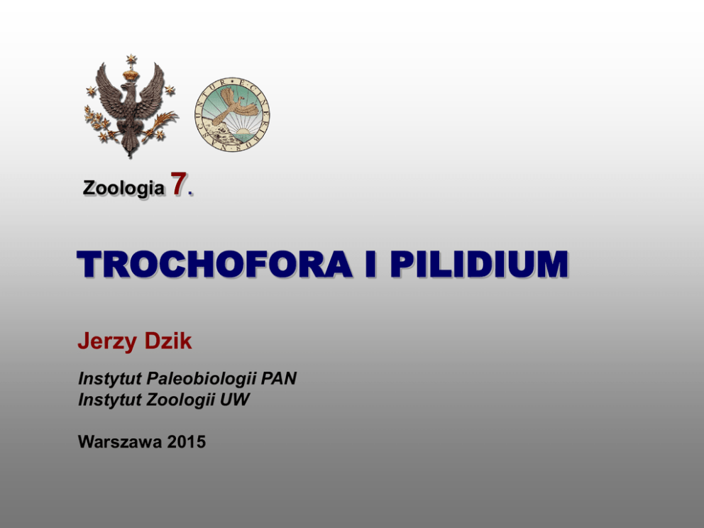 Zoologia 7. TROCHOFORA I PILIDIUM Jerzy Dzik Instytut Paleobiologii PAN Instytut Zoologii UW Warszawa 2015 czuciowe antennae ANNELIDA PIERŚCIENICE dorsum pochodzenie venter szczęki microvilli venter dorsum wieloszczet? Wiwaxia 520 mln lat prostopadłe sznury kolagenu kutikula pierścienic wieloszczet Aphrodite budowa kutikuli i boczne undulacje ciała jak u Nematomorpha wieloszczet Canadia 520 mln lat kambryjskie wieloszczety trudne do odróżnienia od mięczaków wspólny przodek miał pośrednie cechy? szczęki wieloszczet Eunice parapodium ANNELIDA PIERŚCIENICE antenna plan budowy Polychaeta palpus seryjne narządy zgrupowane w segmenty pęczki wiosłowatych szczecinek na parzystych "odnóżach" (parapodia) boczne undulacje ciała zdolność do pływania pierwotna? wieloszczet Nereis wynicowana gardziel bez szczęk POLYCHAETA WIELOSZCZETY pływająca Phyllodoce swobodnie żyjące pelagiczna Tomopteris pierwotnie przystosowane do pływania przy pomocy parapodiów drapieżne – wynicowywana gardziel z kutikularnymi zębami szczęki wynicowana gardziel ryjek z hakami pierwotny? przydenna Glycera operculum filtrująca Serpula POLYCHAETA w wapiennej rurce WIELOSZCZETY osiadłe Sabella Ridgeia wykorzystuje siarkowodór gorących podwodnych źródeł wydzielają bądź budują osłonkę ciała przydatki głowy tworzą aparat filtracyjny głębokowodne Pogonophora bez jelita – chemoautotroficzne bakterie w czułkach Spirobranchus w koralowcu operculum Osedax od filtracji do wykorzystania siarkowodoru na kości ścierwa wieloryba OLIGOCHAETA glebowa dżdżownica Lumbricus czułek SKĄPOSZCZETY słodkowodne i glebowe chaetae słodkowodna Stylaria pochodzą od morskich wieloszczetów po parapodiach pozostały cztery pęczki szczecinek na segment metanefrydium Pontoscolex jajo i sperma składane do kokonu (wydzielina gruczołów clitellum) kopulacja hermafrodyt – wymiana plemników część wydzielnicza reabsorbcja jonów analogia kanalików nerkowych metanefrydium Lumbricus Erpobdella HIRUDINEA PIJAWKI integracja anatomii pasożyt łososi Acanthobdella 30 Branchiobdella 15 przyssawka ektoparazyty i drapieżne stabilna liczba segmentów i dwie przyssawki mocne powierzchniowe umięśnienie ciała po skąposzczetach odziedziczyły clitellum stopniowy zanik układu krwionośnego plan segmentacji i pierścieniowania pijawki (34 segmenty) reliktowe formy mają mniej segmentów i jedną przyssawkę SIPUNCULA OGNIWO anus wiążące typy Sipunculus wentylacja pionowych norek, rurek czy odwiertów trudna Mollusca rozwiązaniem U-kształtne jelito odbyt na grzbiecie i aparat czułkowy zbliżają do czułkowców larwa i podobieństwo genomu do wieloszczetów pośrednie między pierścienicami i czułkowcami Lophophorata Annelida LOPHOPHORATA LOFOFOR narząd filtracyjny Phoronis Phoronoidea anus larwa Phoronis nephridioporus U-kształtne jelito wzdłuż cylindrycznego ciała i czułkowy aparat filtracyjny to brachiopody wtórnie bez muszli złożoność lofoforu powiązana z rozmiarami stoma lofofor LOPHOPHORATA BRACHIOPODY dwuskorupowa muszla Brachiopoda Eleutherocomma 370 mln lat wapienna muszla Hemithyris wyłącznie morskie dwuskorupkowa muszla: skorupki grzbietowa i brzuszna (a nie boczne, jak u małżów) zewnętrzny szkielet fosforanowy lub wapienny wydzielany brzeżnie przez płaszcz (jak u mięczaków) niegdyś bardzo różnorodne; wyparły je małże fosforanowa Lingula nóżka lofofor LOPHOPHORATA MSZYWIOŁY słodkowodne Plumatella Bryozoa Phylactolaemata kolonie przez pączkowanie z zachowaniem związku osobników reliktowe; stosunkowo duże rozmiary osobników – U-kształtny lofofor najmocniej zintegrowane kolonie mogą pełzać wytwarzają przetrwalniki na zimę Cristatella kolonia jest klonem genetycznym LOPHOPHORATA Cryptostomata INTEGRACJA klonu Bryozoa Cheilostomata 140 mln lat Trepostomata wspólna jama ciała pączkujący zooid Corynotrypa 470 mln lat ancestrula Cyclostomata metamorfoza po cementacji larwy do podłoża wapienny szkielet wydzielany przez płaszcz integracja postępująca aż po wspólną jamę ciała wspólny front pączkowania zmodyfikowane wieczko LOPHOPHORATA SUPERORGANIZM polimorfizm w kolonii avicularium wylęgarka Bryozoa Cheilostomata gałązkowa kolonia Bugula wylęgarka osobniki są identyczne genetycznie zwykły osobnik odmienność anatomii oznacza ekspresję różnych zestawów genów kolonia Membranipora bez polimorfizmu avicularium zwykły osobnik polimorficzna kolonia Manzonella warunkiem dywergencji duplikacja genów homeotycznych 110 mln lat LOPHOPHORATA EWOLUCJA zwykły osobnik avicularium polimorfizmu duplikacja genowa umożliwiła rozbieżną ewolucję ontogenezy osobników w obrębie klonu wylęgarka niezbędny mechanizm przełączania ekspresji genów homeotycznych EWOLUCJA Bryozoa Cheilostomata 135 mln lat coraz większa liczba typów polimorfów w kolonii NEMERTINI WSTĘŻNICE pokrewieństwa metamorfoza uniemożliwia określenie pochodzenia rynchocelu pilidium pierwotny Tubulanus morskie larwa podobna do trochofory anatomia swoista pokrewieństwa molekularne molekularnie bliskie mięczakom i pierścienicom Annelida NEMERTINI gonady WSTĘŻNICE plan budowy mięsień wciągający ryjek protonefrydia gonady ryjek rhynchocoel anus oczy stoma hydraulicznie wynicowywany ryjek z osobną jamą ciała jelito zwykle z bocznymi uchyłkami seryjne gonady wypustki jelita planktonowy Pelagonemertes nie wiadomo, co w anatomii pierwotne, co wtórne bentosowy Amphiporus PLATYHELMINTHES WIRKI reliktowe uproszczone Turbellaria Acoela s.l. nemertodermatid Flagellophora jednowiciowe plemniki plemniki z normalną 9×2+2 pojedynczą wicią tylko u nielicznych maleńkich form Catenula plemniki bez wici jaja zwykle dwie wici 9×2+1 wtórne uproszczenie anatomii (bezjelitowe lub szczątkowe jelito) przyspieszona ewolucja molekularna utrudnia rozpoznanie pokrewieństw brak odbytu śladem miniaturyzacji przodka? aktyna bezjelitowa Convoluta w symbiozie z wiciowcem zi