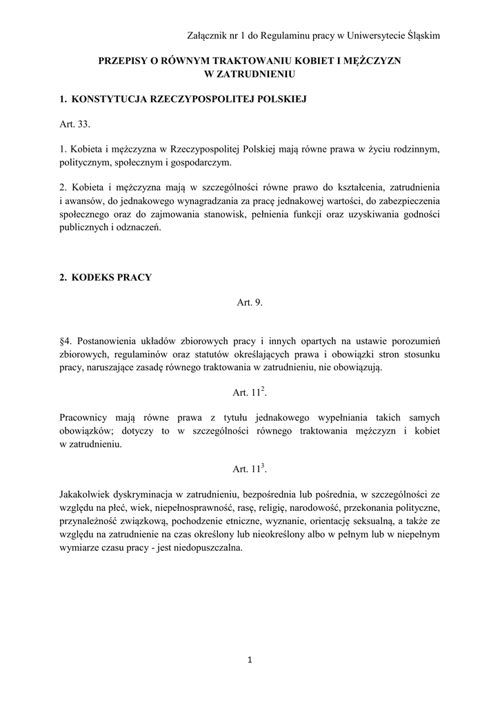 Załącznik nr 1 do Regulaminu pracy w Uniwersytecie Śląskim PRZEPISY O RÓWNYM TRAKTOWANIU KOBIET I MĘŻCZYZN W ZATRUDNIENIU 1. KONSTYTUCJA RZECZYPOSPOLITEJ POLSKIEJ Art. 33. 1. Kobieta i mężczyzna w Rzeczypospolitej Polskiej mają równe prawa w życiu rodzinnym, politycznym, społecznym i gospodarczym. 2. Kobieta i mężczyzna mają w szczególności równe prawo do kształcenia, zatrudnienia i awansów, do jednakowego wynagradzania za pracę jednakowej wartości, do zabezpieczenia społecznego oraz do zajmowania stanowisk, pełnienia funkcji oraz uzyskiwania godności publicznych i odznaczeń. 2. KODEKS PRACY Art. 9. §4. Postanowienia układów zbiorowych pracy i innych opartych na ustawie porozumień zbiorowych, regulaminów oraz statutów określających prawa i obowiązki stron stosunku pracy, naruszające zasadę równego traktowania w zatrudnieniu, nie obowiązują. Art. 112. Pracownicy mają równe prawa z tytułu jednakowego wypełniania takich samych obowiązków; dotyczy to w szczególności równego traktowania mężczyzn i kobiet w zatrudnieniu. Art. 113. Jakakolwiek dyskryminacja w zatrudnieniu, bezpośrednia lub pośrednia, w szczególności ze względu na płeć, wiek, niepełnosprawność, rasę, religię, narodowość, przekonania polityczne, przynależność związkową, pochodzenie etniczne, wyznanie, orientację seksualną, a także ze względu na zatrudnienie na czas określony lub nieokreślony albo w pełnym lub w niepełnym wymiarze czasu pracy - jest niedopuszczalna. 1 Art. 18. §3. Postanowienia umów o pracę i innych aktów, na podstawie których powstaje stosunek pracy, naruszające zasadę równego traktowania w zatrudnieniu są nieważne. Zamiast takich postanowień stosuje się odpowiednie przepisy prawa pracy, a w razie braku takich przepisów - postanowienia te należy zastąpić odpowiednimi postanowieniami niemającymi charakteru dyskryminacyjnego. Rozdział IIa Równe traktowanie w zatrudnieniu (Art. 183a. – 183e.) Art. 183a. §1. Pracownicy powinni być równo traktowani w zakresie nawiązania i rozwiązania stosunku pracy, warunków zatrudnienia, awansowania oraz dostępu do szkolenia w celu podnoszenia kwalifikacji zawodowych, w szczególności bez względu na płeć, wiek, niepełnosprawność, rasę, religię, narodowość, przekonania polityczne, przynależność związkową, pochodzenie etniczne, wyznanie, orientację seksualną, a także bez względu na zatrudnienie na czas określony lub nieokreślony albo w pełnym lub w niepełnym wymiarze czasu pracy. §2. Równe traktowanie w zatrudnieniu oznacza niedyskryminowanie w jakikolwiek sposób, bezpośrednio lub pośrednio, z przyczyn określonych w § 1. §3. Dyskryminowanie bezpośrednie istnieje wtedy, gdy pracownik z jednej lub z kilku przyczyn określonych w § 1 był, jest lub mógłby być traktowany w porównywalnej sytuacji mniej korzystnie niż inni pracownicy. §4. Dyskryminowanie pośrednie istnieje wtedy, gdy na skutek pozornie neutralnego postanowienia, zastosowanego kryterium lub podjętego działania występują lub mogłyby wystąpić niekorzystne dysproporcje albo szczególnie niekorzystna sytuacja w zakresie nawiązania i rozwiązania stosunku pracy, warunków zatrudnienia, awansowania oraz dostępu do szkolenia w celu podnoszenia kwalifikacji zawodowych wobec wszystkich lub znacznej liczby pracowników należących do grupy wyróżnionej ze względu na jedną lub kilka przyczyn określonych w § 1, chyba że postanowienie, kryterium lub działanie jest obiektywnie uzasadnione ze względu na zgodny z prawem cel, który ma być osiągnięty, a środki służące osiągnięciu tego celu są właściwe i konieczne. §5. Przejawem dyskryminowania w rozumieniu § 2 jest także: 1) działanie polegające na zachęcaniu innej osoby do naruszenia zasady równego traktowania w zatrudnieniu lub nakazaniu jej naruszenia tej zasady, 2 2) niepożądane zachowanie, którego celem lub skutkiem jest naruszenie godności pracownika i stworzenie wobec niego zastraszającej, wrogiej, poniżającej, upokarzającej lub uwłaczającej atmosfery (molestowanie). §6. Dyskryminowaniem ze względu na płeć jest także każde niepożądane zachowanie o charakterze seksualnym lub odnoszące się do płci pracownika, którego celem lub skutkiem jest naruszenie godności pracownika, w szczególności stworzenie wobec niego zastraszającej, wrogiej, poniżającej, upokarzającej lub uwłaczającej atmosfery; na zachowanie to mogą się składać fizyczne, werbalne lub pozawerbalne elementy (molestowanie seksualne). §7. Podporządkowanie się przez pracownika molestowaniu lub molestowaniu seksualnemu, a także podjęcie przez niego działań przeciwstawiających się molestowaniu lub molestowaniu seksualnemu nie może powodować jakichkolwiek negatywnych konsekwencji wobec pracownika. Art. 183b. §1. Za naruszenie zasady równego traktowania w zatrudnieniu, z zastrzeżeniem § 2-4, uważa się różnicowanie przez pracodawcę sytuacji pracownika z jednej lub kilku przyczyn określonych w art. 183a § 1, którego skutkiem jest w szczególności: 1) odmowa nawiązania lub rozwiązanie stosunku pracy, 2) niekorzystne ukształtowanie wynagrodzenia za pracę lub innych warunków zatrudnienia albo pominięcie przy awansowaniu lub przyznawaniu innych świadczeń związanych z pracą, 3) pominięcie przy typowaniu do udziału w szkoleniach podnoszących kwalifikacje zawodowe - chyba że pracodawca udowodni, że kierował się obiektywnymi powodami. §2. Zasady równego traktowania w zatrudnieniu nie naruszają działania, proporcjonalne do osiągnięcia zgodnego z prawem celu różnicowania sytuacji pracownika, polegające na: 1) niezatrudnianiu pracownika z jednej lub kilku przyczyn określonych w art. 183a § 1, jeżeli rodzaj pracy lub warunki jej wykonywania powodują, że przyczyna lub przyczyny wymienione w tym przepisie są rzeczywistym i decydującym wymaganiem zawodowym stawianym pracownikowi, 