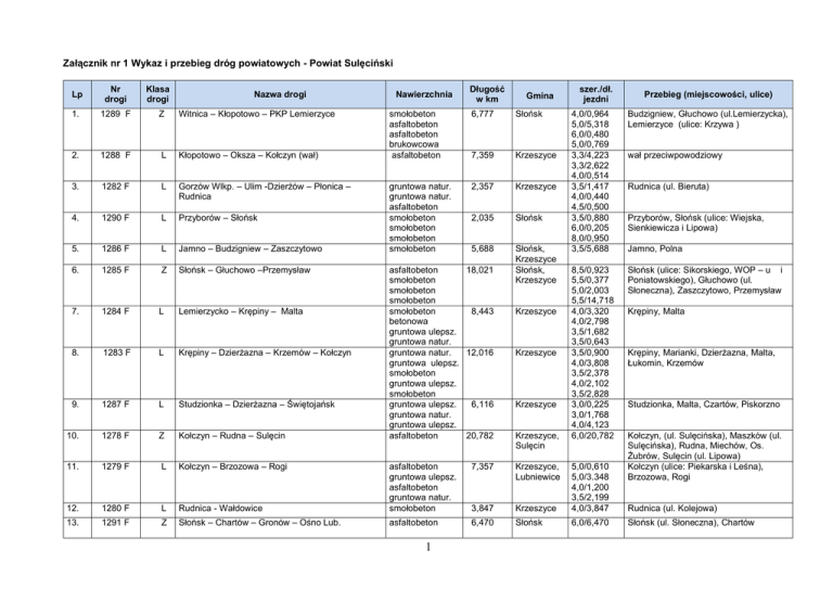 Załącznik nr 1 Wykaz i przebieg dróg powiatowych - Powiat Sulęciński Lp Nr drogi Klasa drogi 1. 1289 F Z Witnica – Kłopotowo – PKP Lemierzyce 2. 1288 F L Kłopotowo – Oksza – Kołczyn (wał) 3. 1282 F L Gorzów Wlkp. – Ulim -Dzierżów – Płonica – Rudnica 4. 1290 F L Przyborów – Słońsk 5. 1286 F L Jamno – Budzigniew – Zaszczytowo 6. 1285 F Z Słońsk – Głuchowo –Przemysław 7. 1284 F L Lemierzycko – Krępiny – Malta 8. 1283 F L Krępiny – Dzierżazna – Krzemów – Kołczyn 9. 1287 F L Studzionka – Dzierżazna – Świętojańsk 10. 1278 F Z Kołczyn – Rudna – Sulęcin 11. 1279 F L Kołczyn – Brzozowa – Rogi 12. 1280 F L 13. 1291 F Z Nazwa drogi Nawierzchnia Długość w km Gmina smołobeton asfaltobeton asfaltobeton brukowcowa asfaltobeton 6,777 Słońsk 7,359 Krzeszyce gruntowa natur. gruntowa natur. asfaltobeton smołobeton smołobeton smołobeton smołobeton 2,357 Krzeszyce 2,035 Słońsk 5,688 Słońsk, Krzeszyce Słońsk, Krzeszyce asfaltobeton 18,021 smołobeton smołobeton smołobeton smołobeton 8,443 betonowa gruntowa ulepsz. gruntowa natur. gruntowa natur. 12,016 gruntowa ulepsz. smołobeton gruntowa ulepsz. smołobeton gruntowa ulepsz. 6,116 gruntowa natur. gruntowa ulepsz. asfaltobeton 20,782 Krzeszyce Krzeszyce Krzeszyce Krzeszyce, Sulęcin szer./dł. jezdni 4,0/0,964 5,0/5,318 6,0/0,480 5,0/0,769 3,3/4,223 3,3/2,622 4,0/0,514 3,5/1,417 4,0/0,440 4,5/0,500 3,5/0,880 6,0/0,205 8,0/0,950 3,5/5,688 Budzigniew, Głuchowo (ul.Lemierzycka), Lemierzyce (ulice: Krzywa ) 8,5/0,923 5,5/0,377 5,0/2,003 5,5/14,718 4,0/3,320 4,0/2,798 3,5/1,682 3,5/0,643 3,5/0,900 4,0/3,808 3,5/2,378 4,0/2,102 3,5/2,828 3,0/0,225 3,0/1,768 4,0/4,123 6,0/20,782 Słońsk (ulice: Sikorskiego, WOP – u i Poniatowskiego), Głuchowo (ul. Słoneczna), Zaszczytowo, Przemysław 7,357 Krzeszyce, Lubniewice Rudnica - Wałdowice asfaltobeton gruntowa ulepsz. asfaltobeton gruntowa natur. smołobeton 3,847 Krzeszyce 5,0/0,610 5,0/3.348 4,0/1,200 3,5/2,199 4,0/3,847 Słońsk – Chartów – Gronów – Ośno Lub. asfaltobeton 6,470 Słońsk 6,0/6,470 1 Przebieg (miejscowości, ulice) wał przeciwpowodziowy Rudnica (ul. Bieruta) Przyborów, Słońsk (ulice: Wiejska, Sienkiewicza i Lipowa) Jamno, Polna Krępiny, Malta Krępiny, Marianki, Dzierżazna, Malta, Łukomin, Krzemów Studzionka, Malta, Czartów, Piskorzno Kołczyn, (ul. Sulęcińska), Maszków (ul. Sulęcińska), Rudna, Miechów, Os. Żubrów, Sulęcin (ul. Lipowa) Kołczyn (ulice: Piekarska i Leśna), Brzozowa, Rogi Rudnica (ul. Kolejowa) Słońsk (ul. Słoneczna), Chartów Lp Nr drogi Klasa drogi Nazwa drogi Nawierzchnia 14. 1292 F L Lemierzyce Gaj – Ownice – Ośno Lub. 15. 16. 1295 F 1297 F Z Z Lubniewice -Bledzew – Skwierzyna Miechów – Lubniewice 17. 1271 F L Glisno – Grochowo 18. 1296 F L Trzcińce – Lubniewice 19. 1265 F Z Długoszyn – Rychlik – Przęślice -Torzym 20. 1275 F Z Ośno Lub. – Lubień – Brzeźno – Sulęcin 21. 1267 F Z Trzemeszno-Wielowieś – Sieniawa 22. 23. 1293 F 1273 F Z L Studzionka – Krasnołęg Droga przez wieś Świerczów 24. 1276 F L Brzeźno – Ostrów 25. 1281 F L Kołczyn – Łąków – Rudnica 26. 1272 F L Lubniewice – Glisno – Trzemeszno 27. 1270 F L Grochowo – do drogi pow. nr 1267 F Długość w km Gmina smołobeton brukowcowa gruntowa natur. smołobeton asfaltobeton smołobeton asfaltobeton gruntowa ulepsz brukowcowa. smołobeton 6,189 Słońsk 1,725 7,473 Lubniewice Sulęcin, Lubniewice Lubniewice Sulęcin 3,055 Lubniewice asfaltobeton smołobeton smołobeton smołobeton asfaltobeton smołobeton smołobeton asfaltobeton asfaltoibeton smolobeton smołobeton smołobeton smołobeton asfaltobeton gruntowa natura. brukowcowa gruntowa natur. smołobeton asfaltobeton smołobeton smołobeton smołobeton brukowcowa brukowcowa gruntowa ulepsz. brukowcowa gruntowa natur. brukowcowa asfaltobeton brukowcowa 16,165 Sulęcin 6,637 Sulęcin 11,225 Sulęcin 2 5,035 4,039 0,960 Krzeszyce Lubniewice 3,308 Sulęcin 6,442 Krzeszyce 9,573 Lubniewice Sulęcin 1,827 Sulęcin szer./dł. jezdni 5,5/2,650 4,0/0120 3,5/3,419 6,0/1.725 5,5/2,320 5,0/5,153 3,5/0,100 3,5/1,748 3,5/3,187 3,5/3,055 6,0/4,750 5,5/1,950 6,0/1,350 4,0/3,275 6,0/4,840 5,0/2,860 5,5/3,277 6,0/0,500 6,0/0,200 5,5/5,615 6,6/3,435 5,5/1,975 4,0/4,039 5,0/0,400 3,5/0,560 3,0/1,899 4,0/1,409 5,5/5,730 4,00//,712 6,0/0,290 5,5/4,150 3,0/0,113 4,0/0,607 3,5/2,415 4,0/0,685 4,0/0,758 4,0/0,490 3,5/0,065 4,0/0,120 3,0/1,707 Przebieg (miejscowości, ulice) Ownice (ulice: Słoneczna i Młyńska) Lubniewice (ul. Skwierzyńska) Miechów, Jarnatów, Lubniewice (ul. Świerczewskiego) Glisno, Grochowo Lubniewice (Os. Trzcińce, ulice: Leśna i Sosnowa) Długoszyn, Brzeźno, Przęślice Brzeźno, Sulęcin (ul. Młynarska) Trzemeszno (ul. Świebodzińska), Wielowieś Lubniewice (Os. Świerczów) Brzeźno, Ostrów Kołczyn (ul. Leśna), Rudnica (ul. Główna) Lubniewice (ul. Harcerska), Glisno, Trzemeszno (ul. Kolejowa) Grochowo Lp Nr drogi Klasa drogi Nazwa drogi Nawierzchnia Długość w km Gmina szer./dł. jezdni Przebieg (miejscowości, ulice) 28. 1274 F L Lubień – Rychlik – Ostrów brukowcowa gruntowa natur. 6,221 Sulęcin 3,0/2,930 4,0/3,291 Rychlik, Ostrów 29. 1277 F L Glisno – Dębowiec – Nowa Wieś asfaltobeton brukowcowa 5,136 Lubniewice 6,0/1,977 3,0/3,159 Glisno 30. 1246 F L Wielowieś – Zarzyń – Wysoka 5,818 Sulęcin 1269 F L Templewo – Wielowieś 3,248 Sulęcin 4,0/4,156 3,0/0,604 4,0/1,058 3,0/3,248 Wielowieś, Zarzyń 31. smołobeton brukowcowa gruntowa natur. brukowcowa 32. 1236 F L Gronów-Łagów-Sieniawa –Zarzyń brukowcowa 2,027 Sulęcin 3,0/2,027 — 33. 1242 F Z Pieski – Zarzyń – Lubrza-Świebodzin 3,916 Sulęcin 1249 F Z Cybinka – Radzików-Jerzmanice 5,5/1,675 6,0/2,241 6,0/1,610 Zarzyń 34. smołobeton asfaltobeton asfaltobeton 35. 1251 F L Urad – Radzików – Gądków Mały Bargów, Gądków Mały 36. 1162 F L 37. 1256 F 4,0/0,898 2,5/0,582 4,0/0,486 